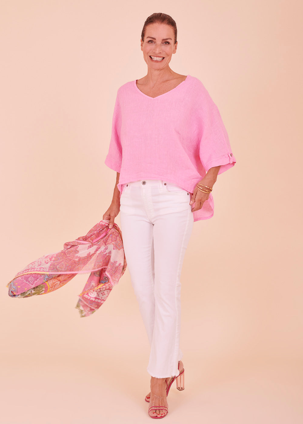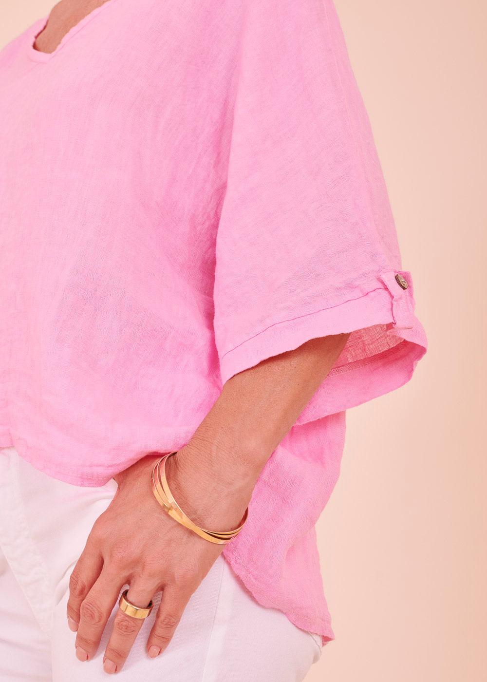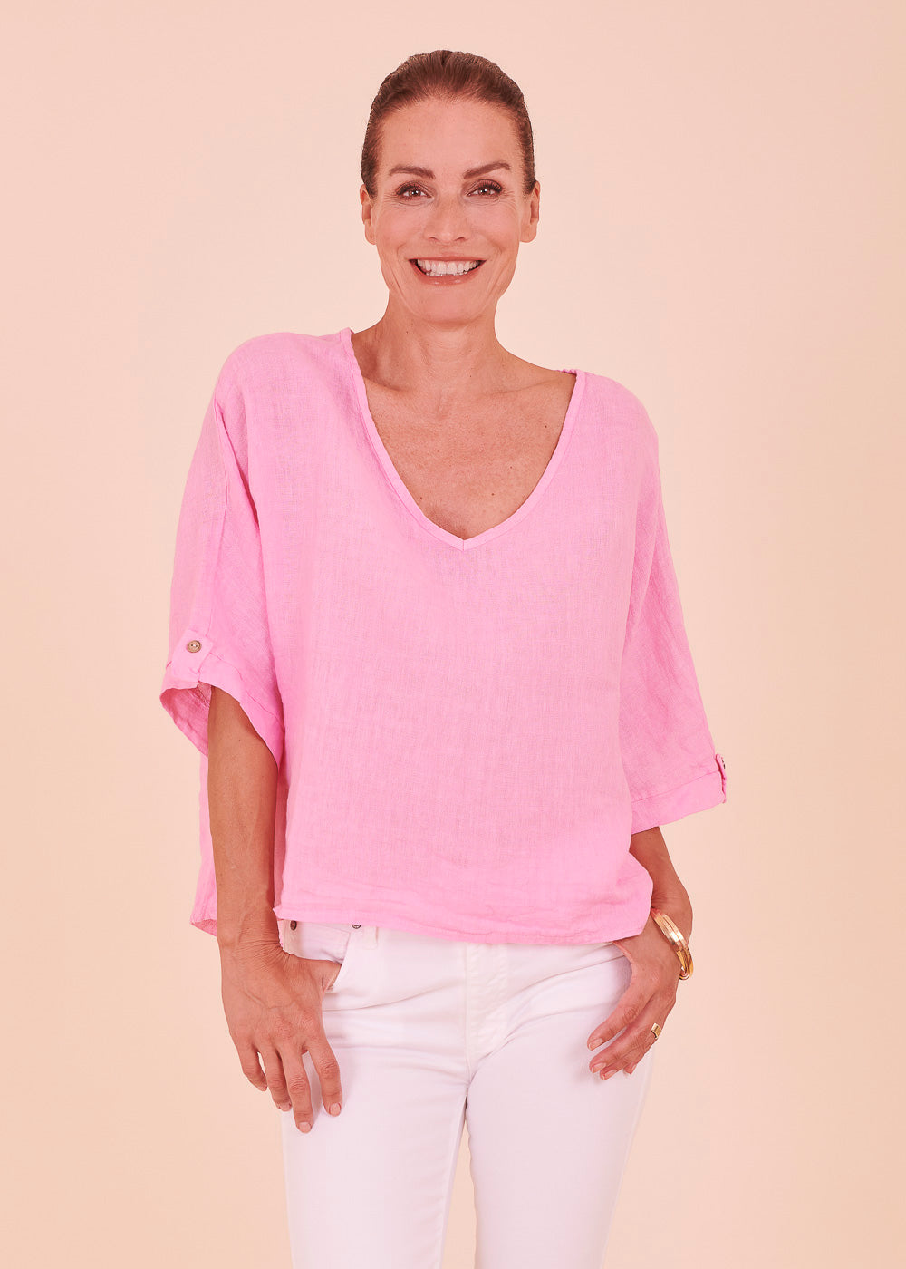 Leinen ist das perfekte Material für die heißen Sommertage. Diese lässig sitzende Leinenbluse mit einem besonders schönen V-Ausschnitt ist ein absoluter Alleskönner. Das luftig leichte Material schmiegt sich angenehm an deinem Körper an.