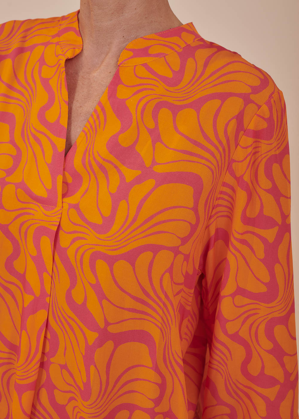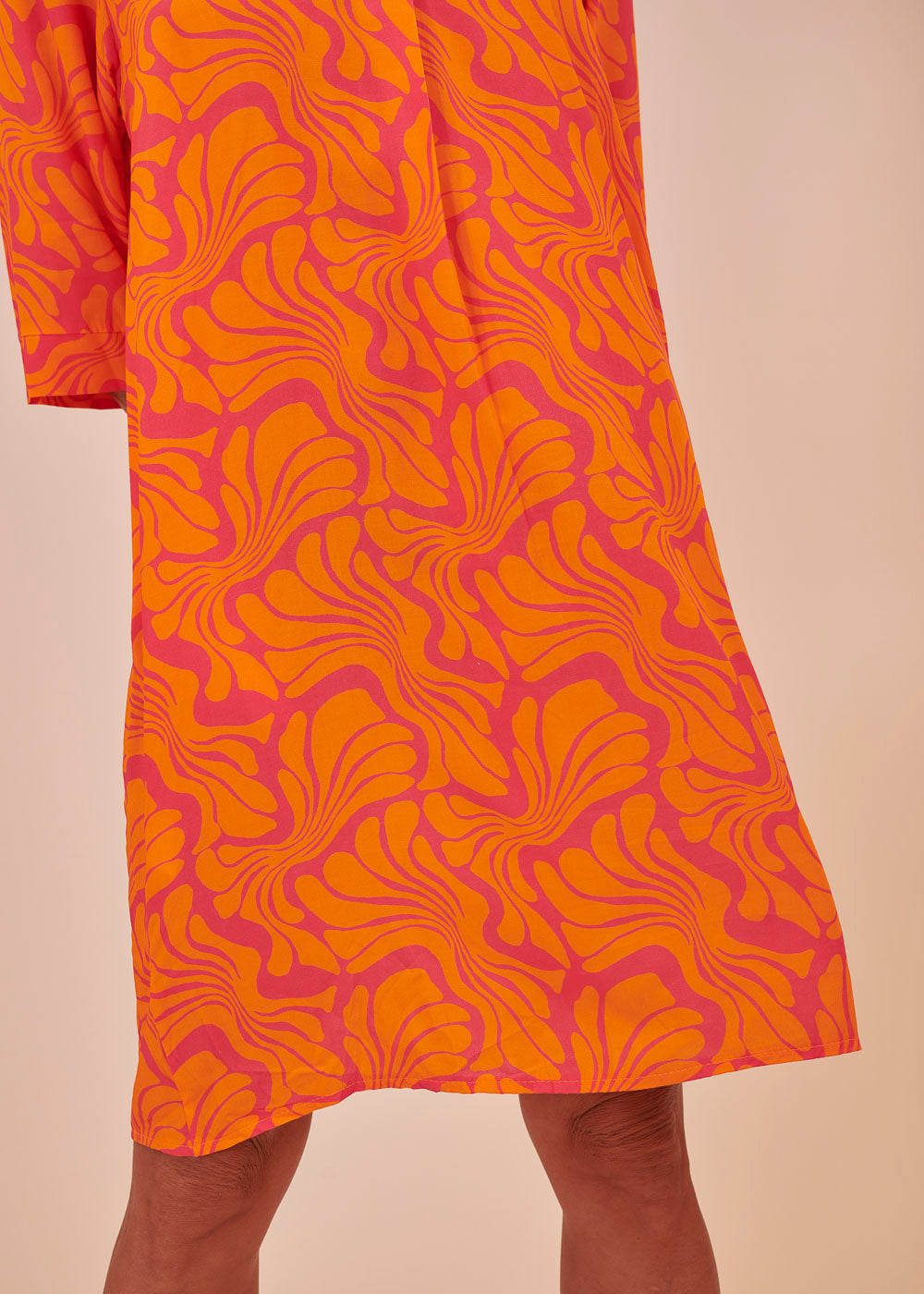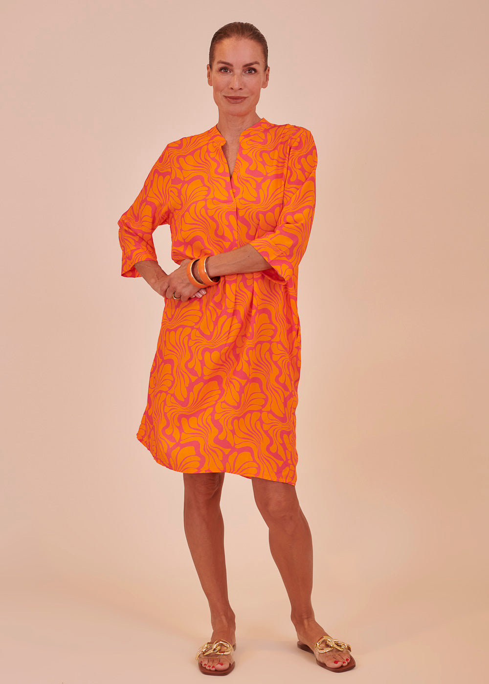 Ein Traum in Orange! Dieses sommerliche Kleid erstrahlt in frischen neuen Trendfarben und einem All-Over-Print. Das Kleid besitzt einen Stehkragen, sowie 3/4 lange Ärmel. Der fließende Schnitt sorgt für ein luftig-leichtes Tragegefühl.