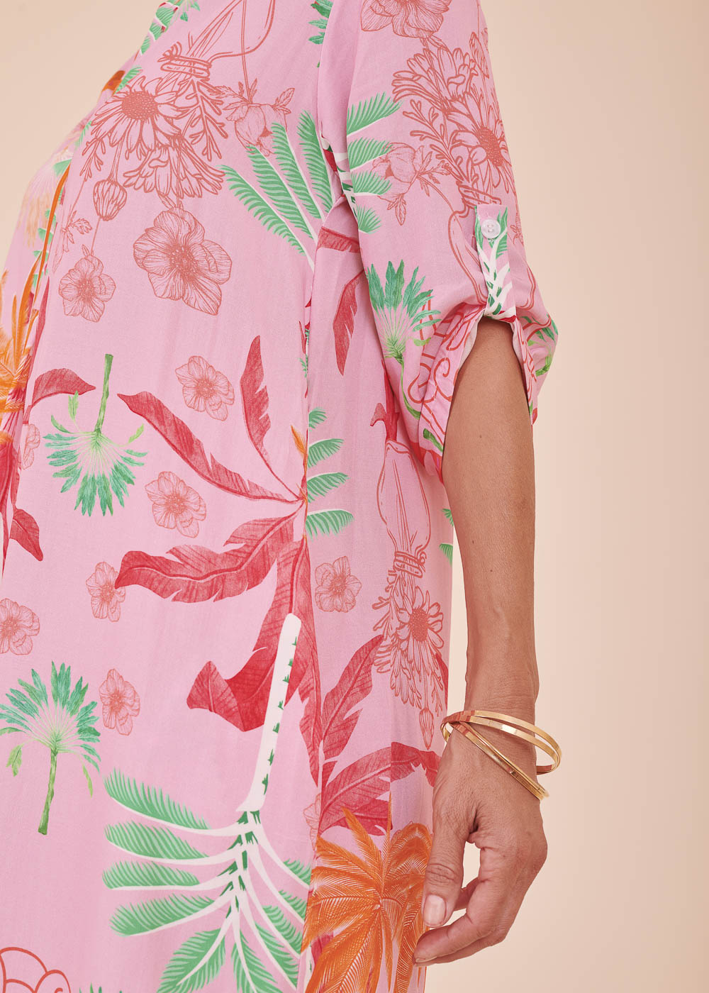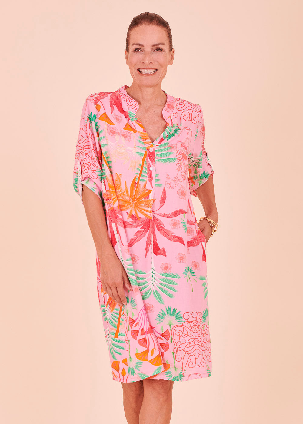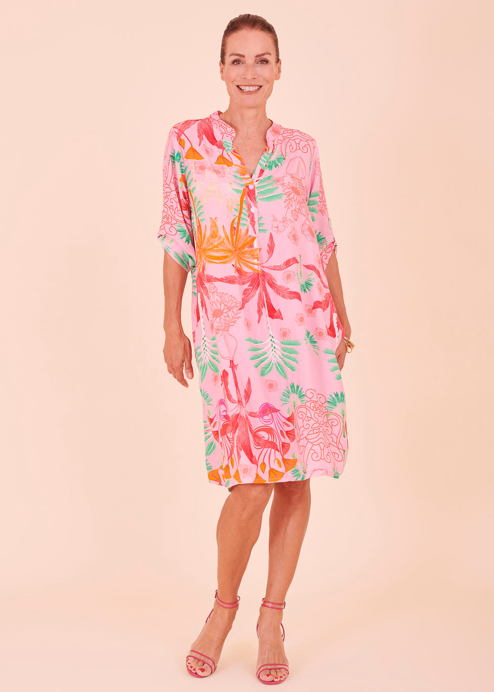 Weich fließendes Material aus Viskose und ein unglaublich gelungenes Design lassen dieses Kleid zu deinem neuen Lieblingsstück für den Sommer werden. Dieses sommerliche Kleid erstrahlt in frischen neuen Trendfarben und einem All-Over-Print. Das Kleid besitzt einen Stehkragen, sowie 3/4 lange Ärmel. Der fließende Schnitt sorgt für ein luftig-leichtes Tragegefühl.