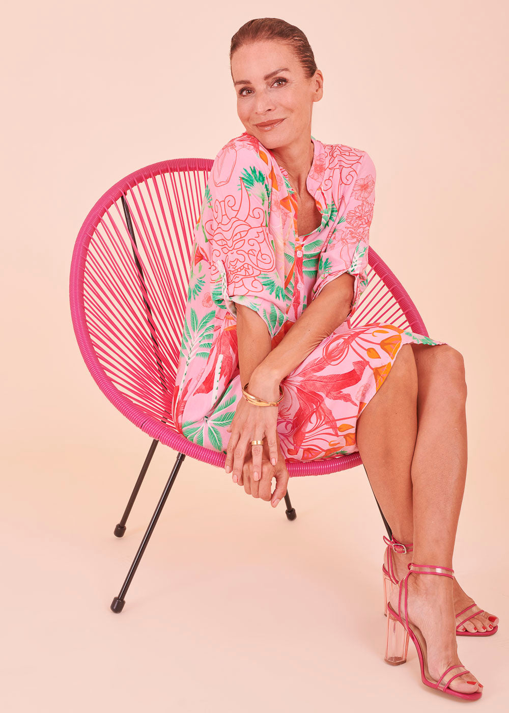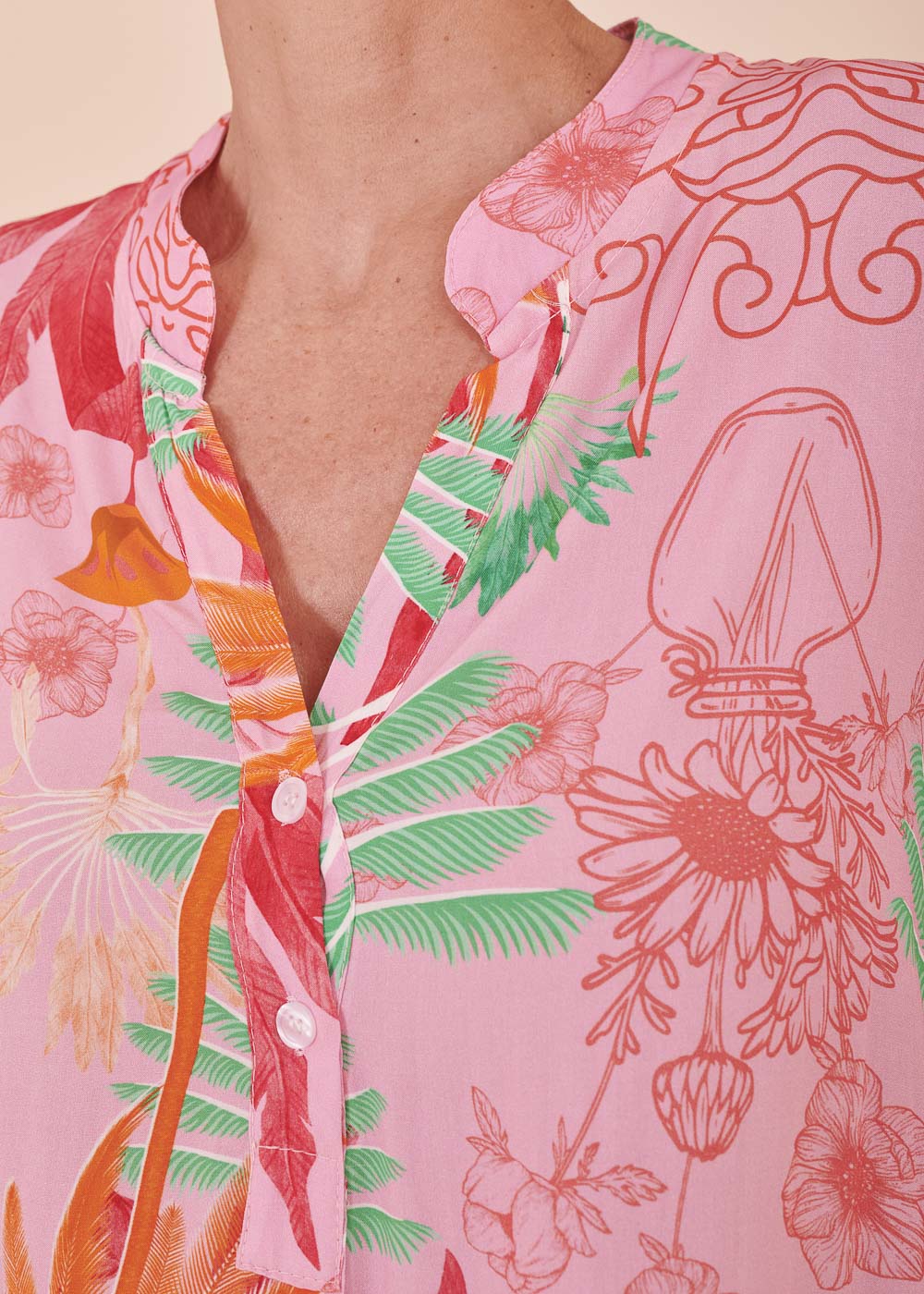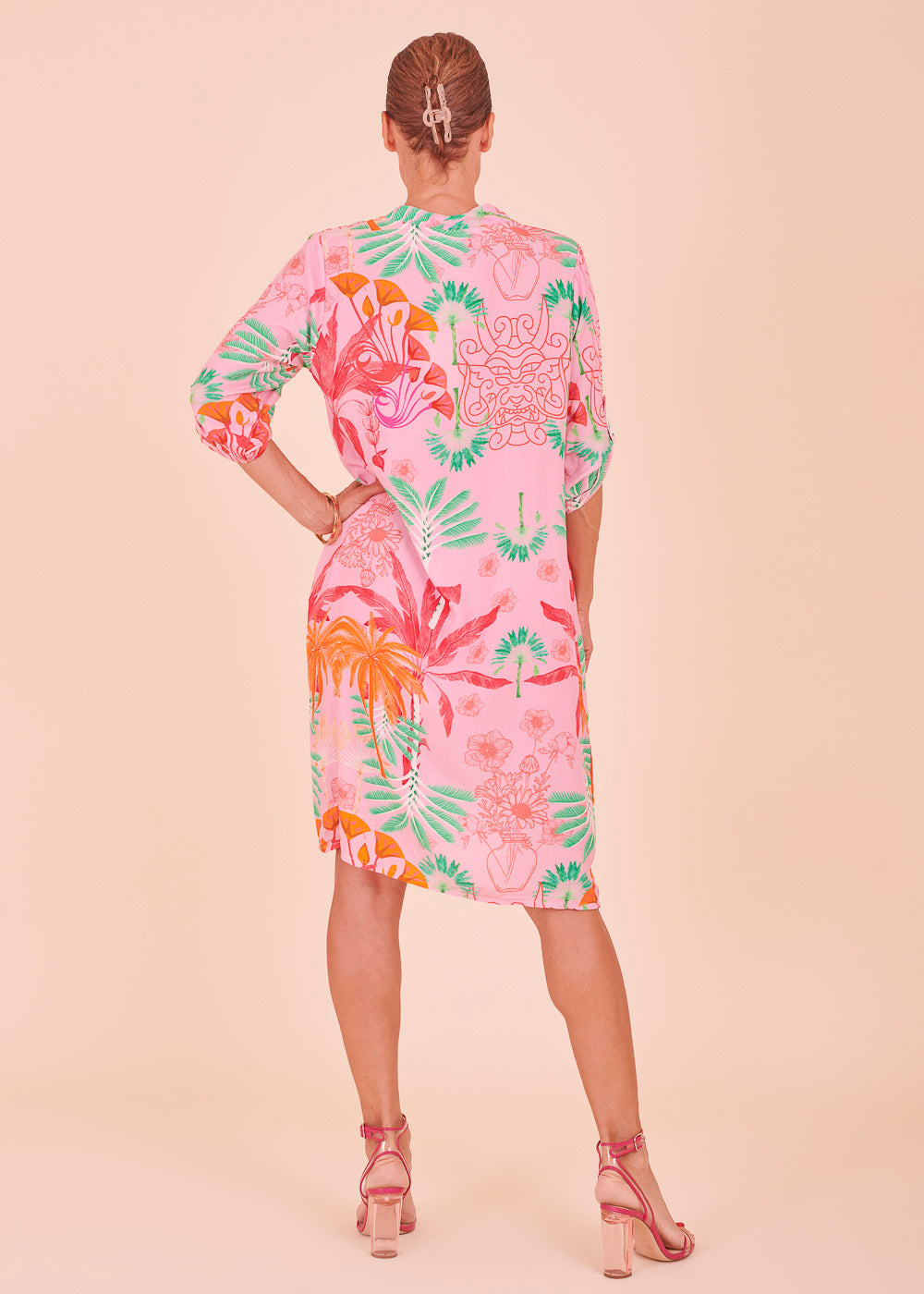 Weich fließendes Material aus Viskose und ein unglaublich gelungenes Design lassen dieses Kleid zu deinem neuen Lieblingsstück für den Sommer werden. Dieses sommerliche Kleid erstrahlt in frischen neuen Trendfarben und einem All-Over-Print. Das Kleid besitzt einen Stehkragen, sowie 3/4 lange Ärmel. Der fließende Schnitt sorgt für ein luftig-leichtes Tragegefühl.