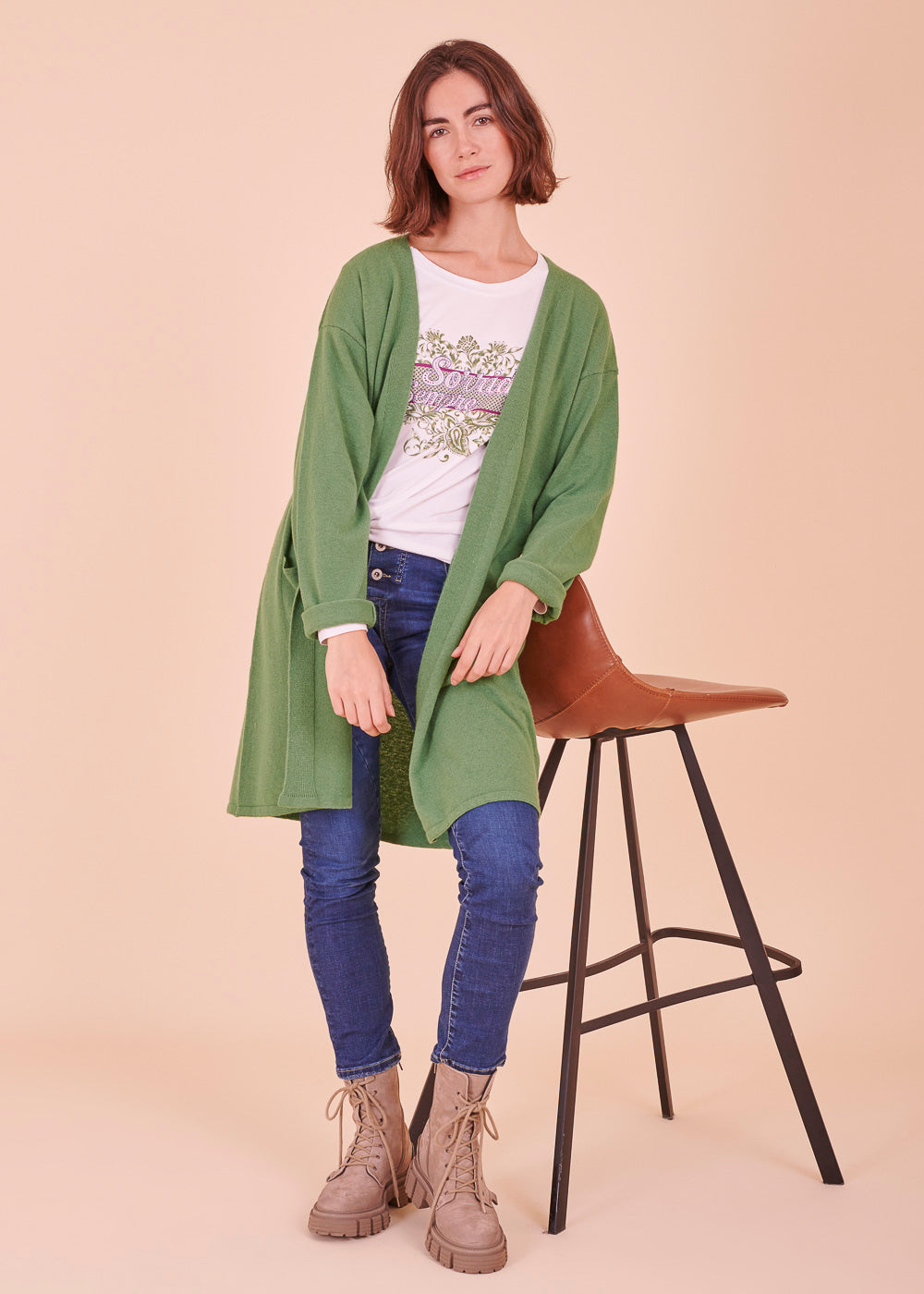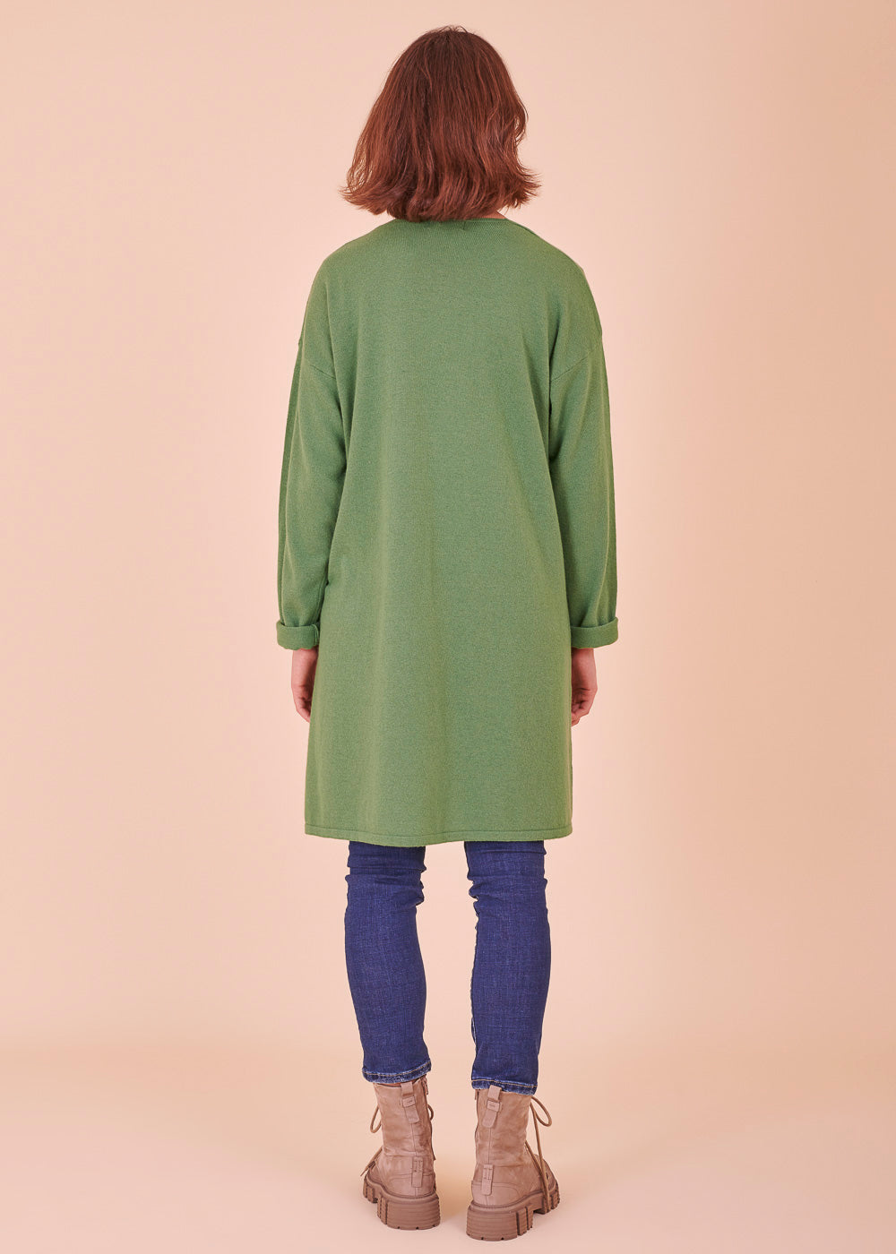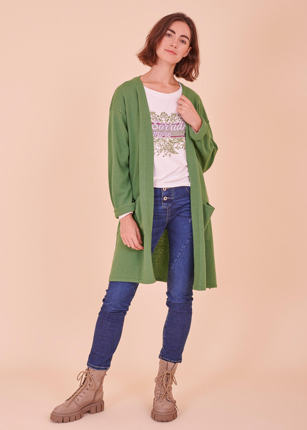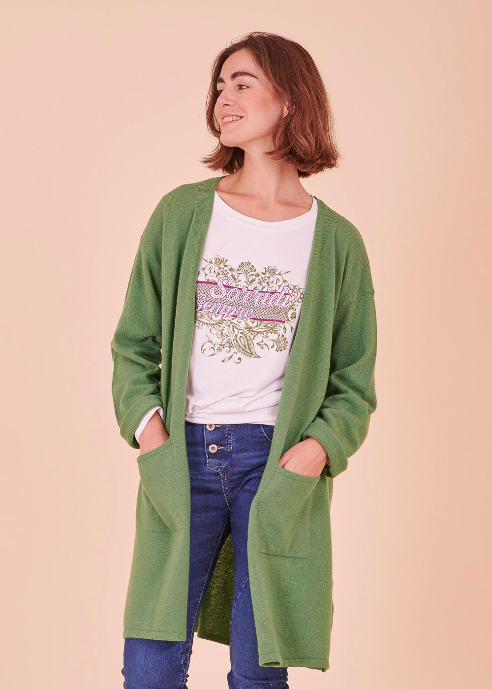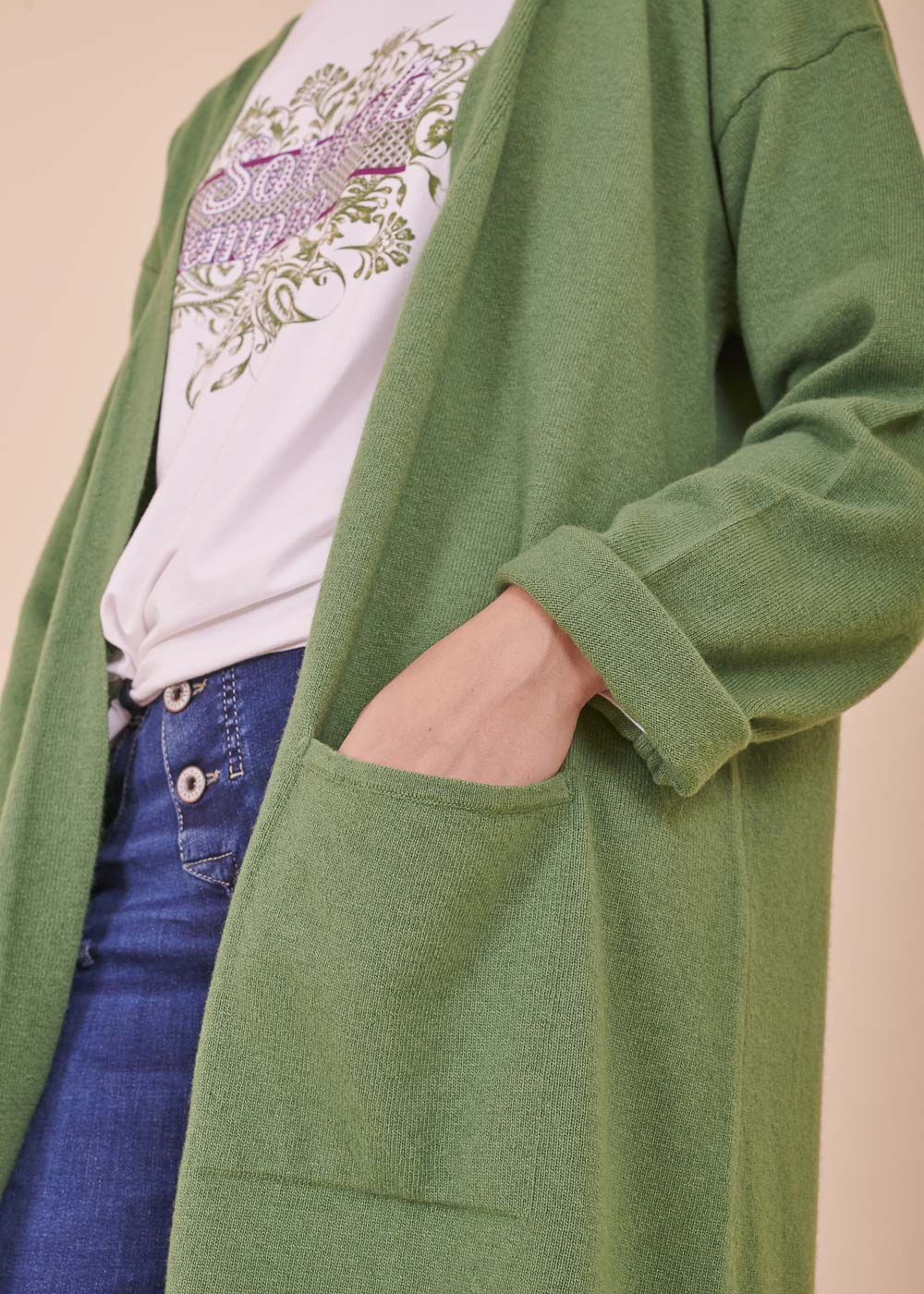 Die satte grüne Farbe verleiht Ihrem Outfit eine frische und lebendige Note, während die lange Silhouette eine schmeichelhafte Eleganz vermittelt. Ob Sie sie über einem einfachen T-Shirt oder einer Bluse tragen, diese Strickjacke verleiht Ihrem Look sofort eine edle Dimension.