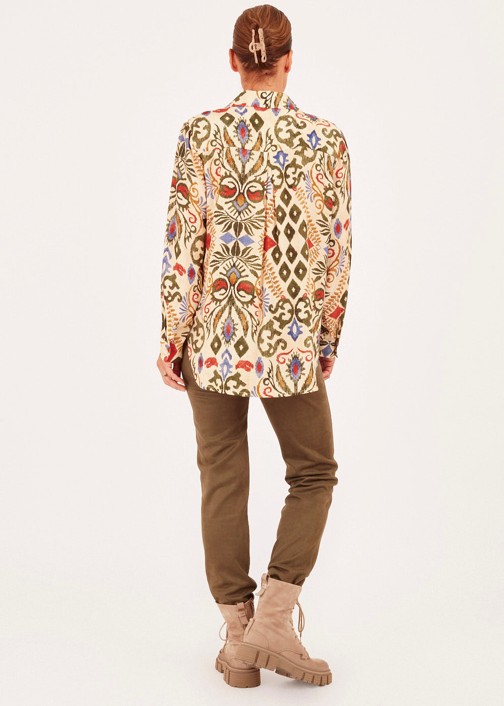 Lässige Viskosebluse mit angesamtem Herbstdruck. In Tunikaform. Mit einer schicken Jacke oder einem Cardigan darüber verwandelst du die Bluse im Handumdrehen in ein wärmendes Outfit für kühlere Herbstabende.