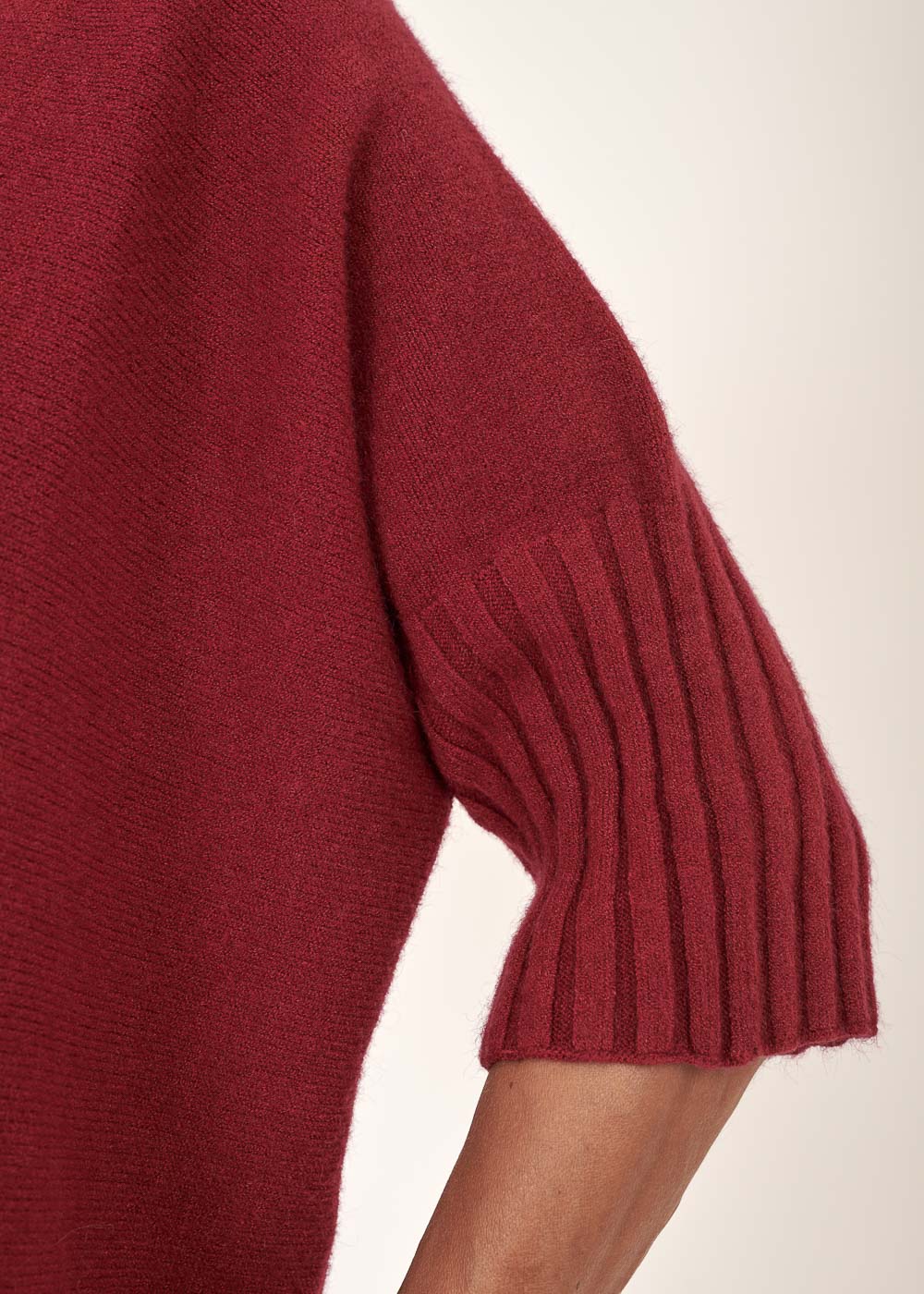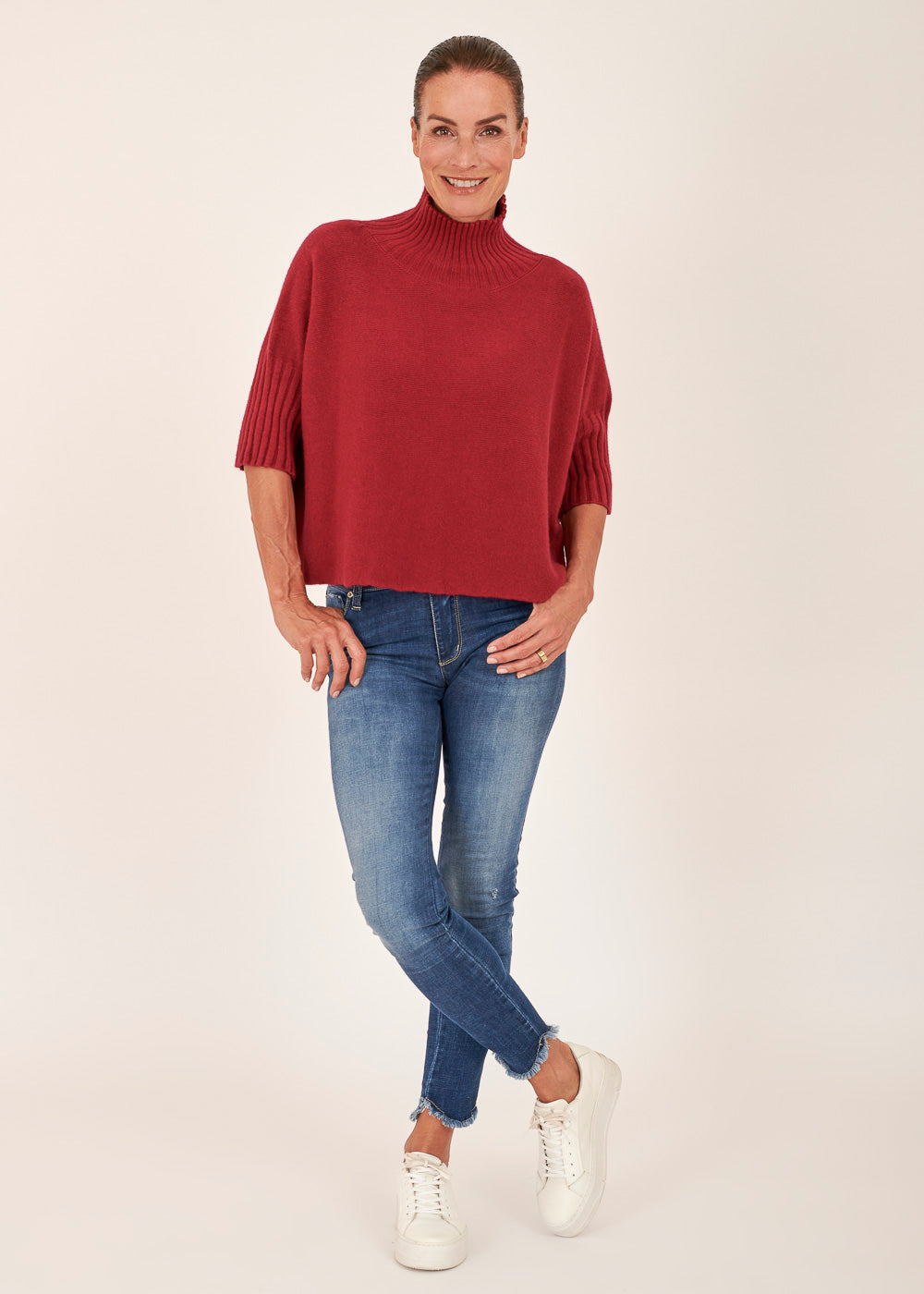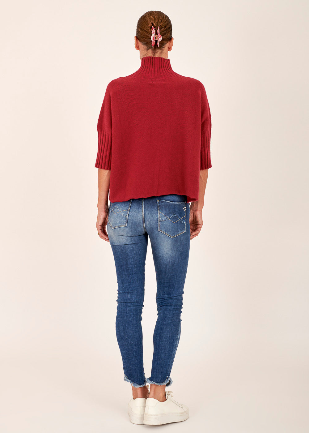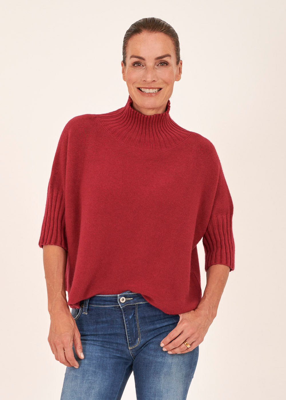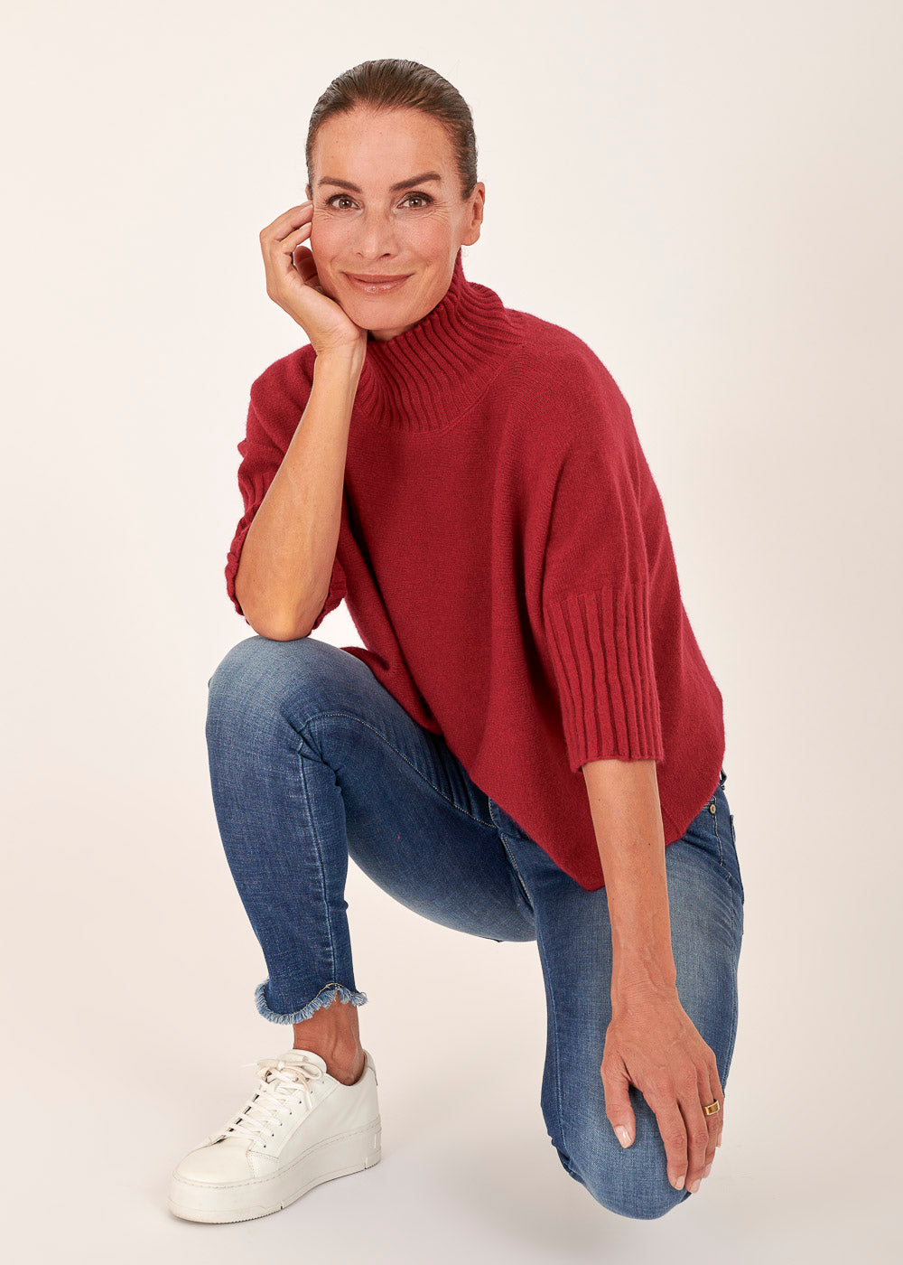 Kurz geschnittener Strickpullover mit Stehkragen aus unserem Kuschelgarn. Er hat ein Rippenbündchen am Kragen und an den Ärmeln. Mit kurz geschnittenen Armen. Einer unserer Lieblinge.