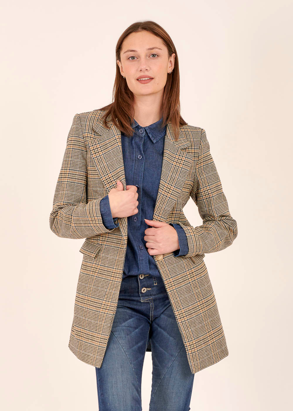 Unser Longblazer zeichnet sich durch eine Vielzahl von besonderen Merkmalen aus, die ihn von anderen Blazern abheben. Der taillierte Schnitt sorgt für eine schmeichelhafte Passform und betont deine Silhouette. Die Knopfleiste und die seitlichen angedeuteten Taschen verleihen dem Blazer eine praktische Note, ohne dabei den Stil zu beeinträchtigen. Die hochwertige Verarbeitung gewährleistet Langlebigkeit und Tragekomfort. Der Longblazer im Glencheck Design ist äußerst vielseitig. Trage ihn über einem schlichten Hemd oder einer Bluse für einen eleganten Bürolook, oder kombinieren ihn mit Jeans und einem T-Shirt für einen entspannten, aber dennoch stilvollen Freizeitlook. Er eignet sich auch hervorragend als Teil eines schickeren Ensembles für formellere Anlässe.