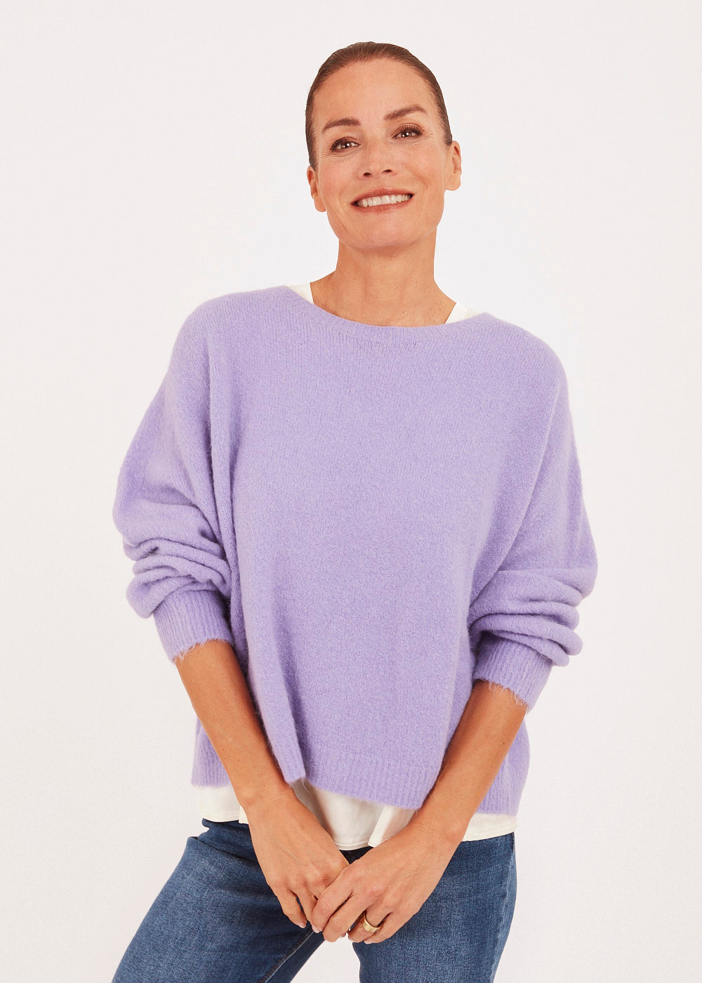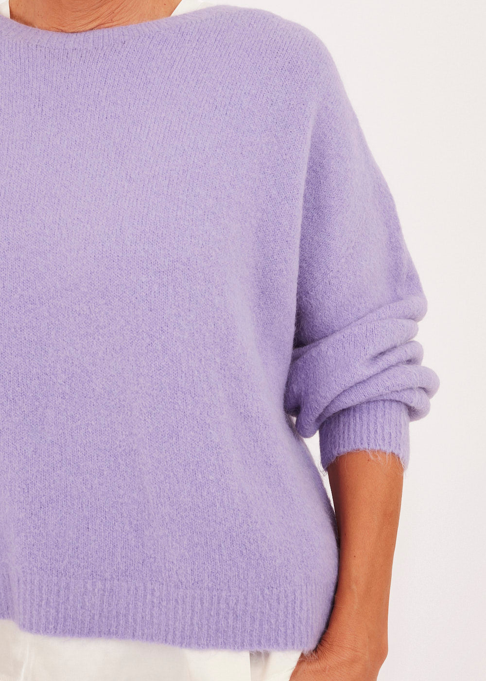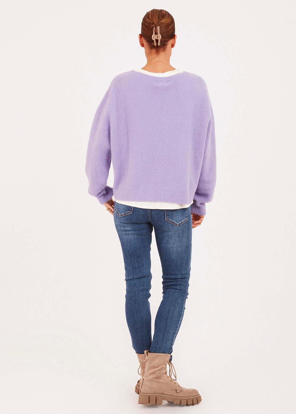 Leichter und gemütlicherPullovermit V-Ausschnitt. Mit überschnittenen Ärmeln aus einem Materialmix mit Alpaka. Rippenbündchen an den Ärmeln und Schlitzen an den Seiten. Einfach zum Wohlfühlen. Kombiniere diesen Artikel gerne mit einer unserer Please Skinny Jeans.