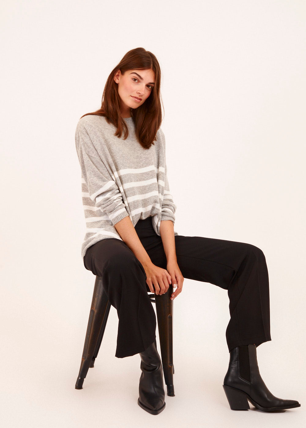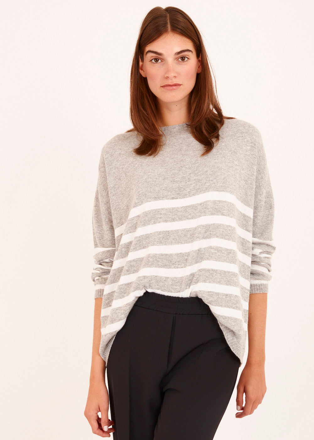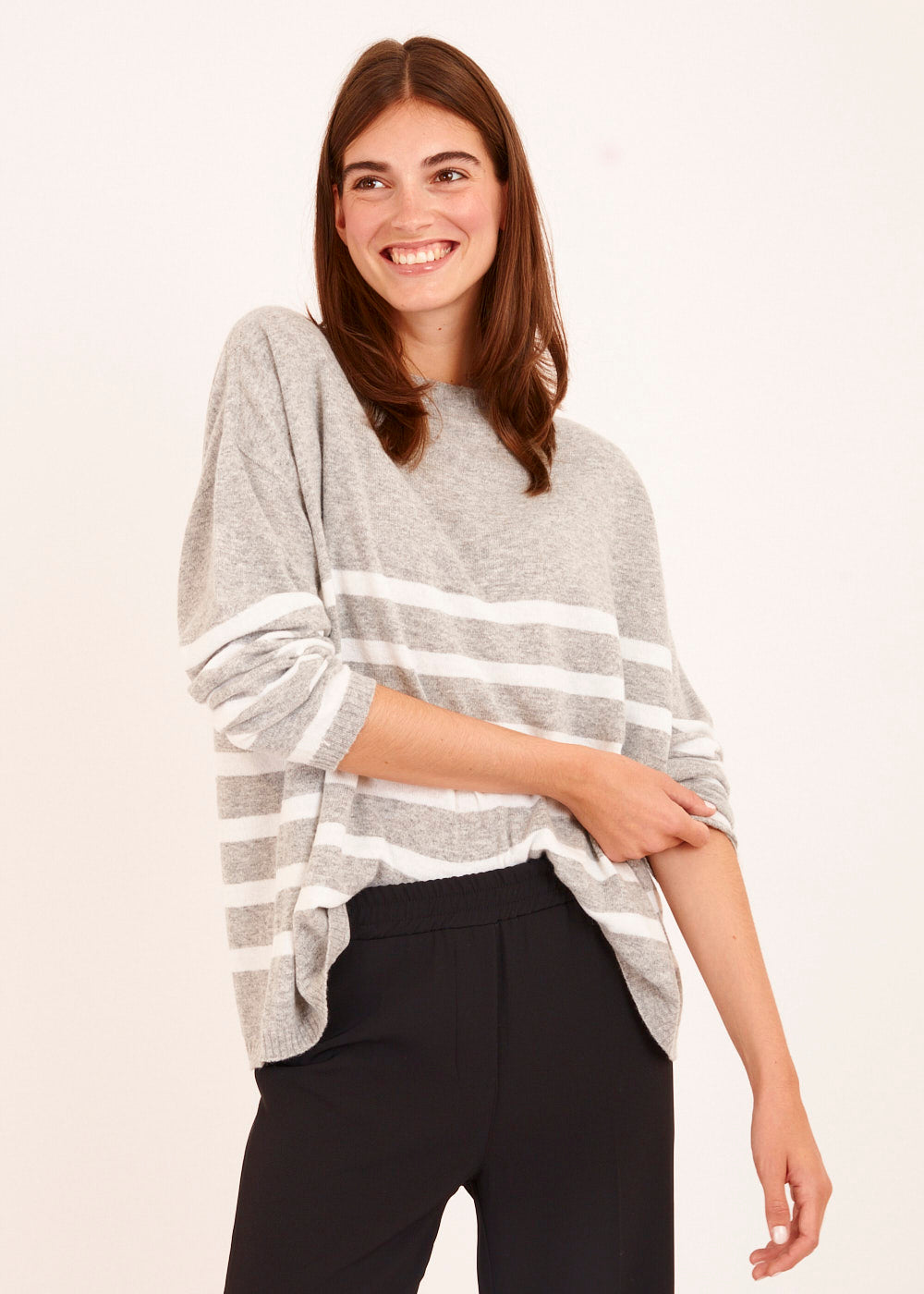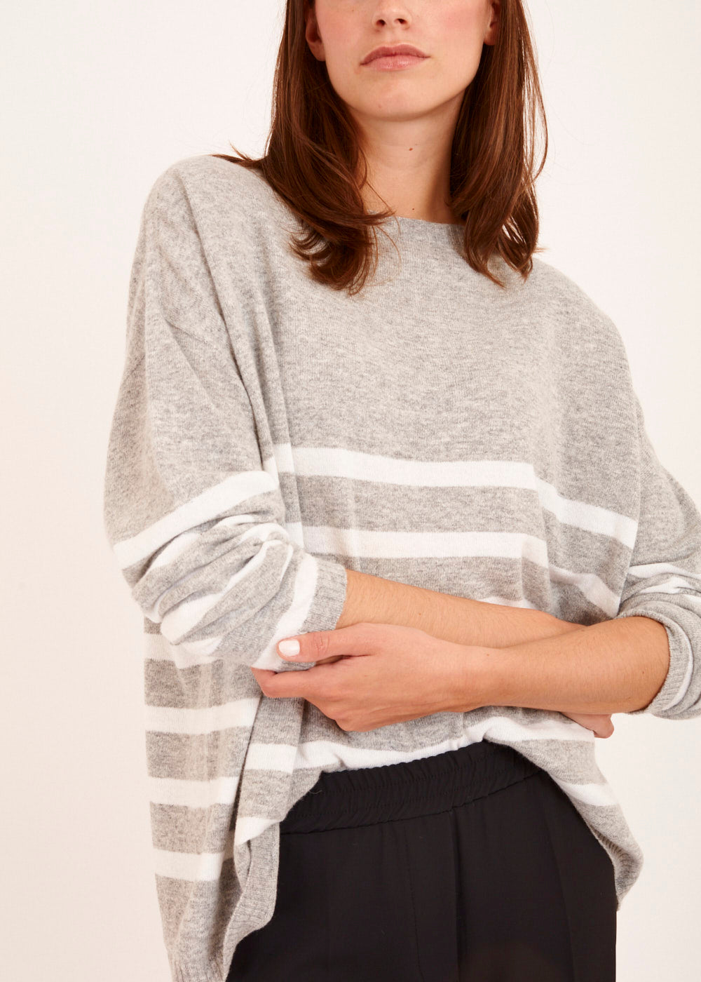 Die grauen Ringel verleihen dem Pullover eine dezente, aber dennoch ansprechende Optik. Sie passen zu vielen verschiedenen Outfits und sind vielseitig kombinierbar. Ob du ihn zu Jeans, einer Leggings oder einem Rock tragen, dieser Pullover ergänzt deinen Look auf stilvolle Weise.