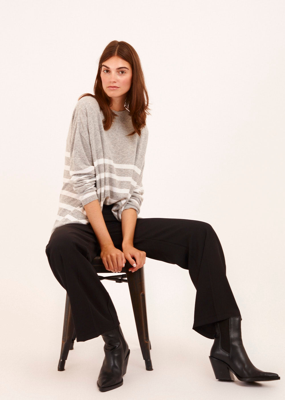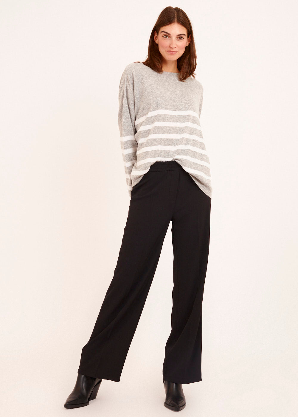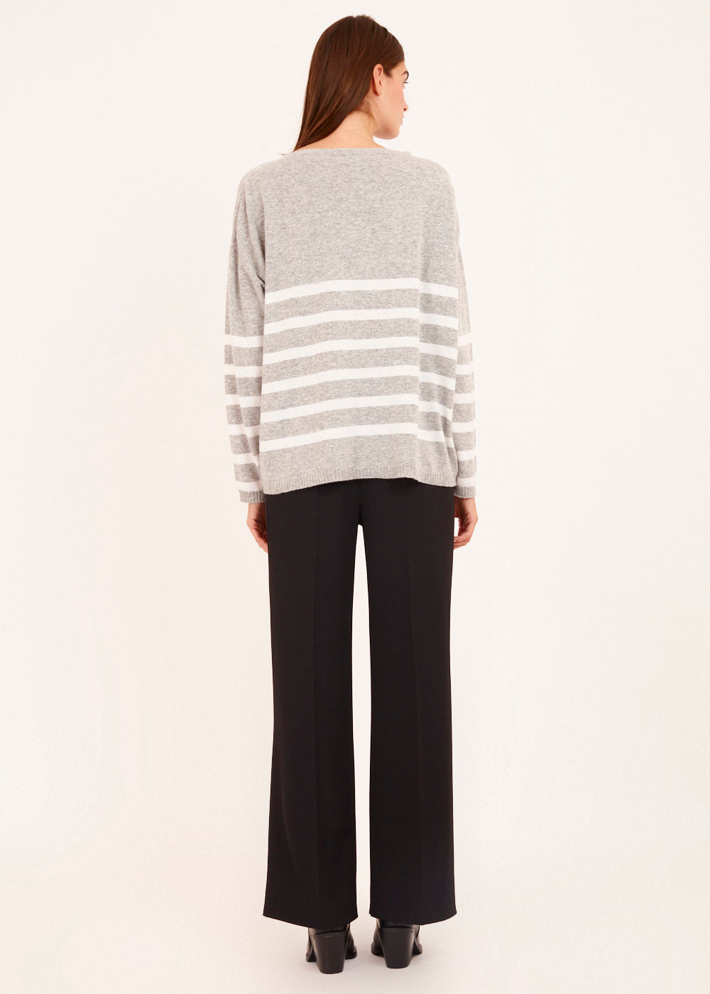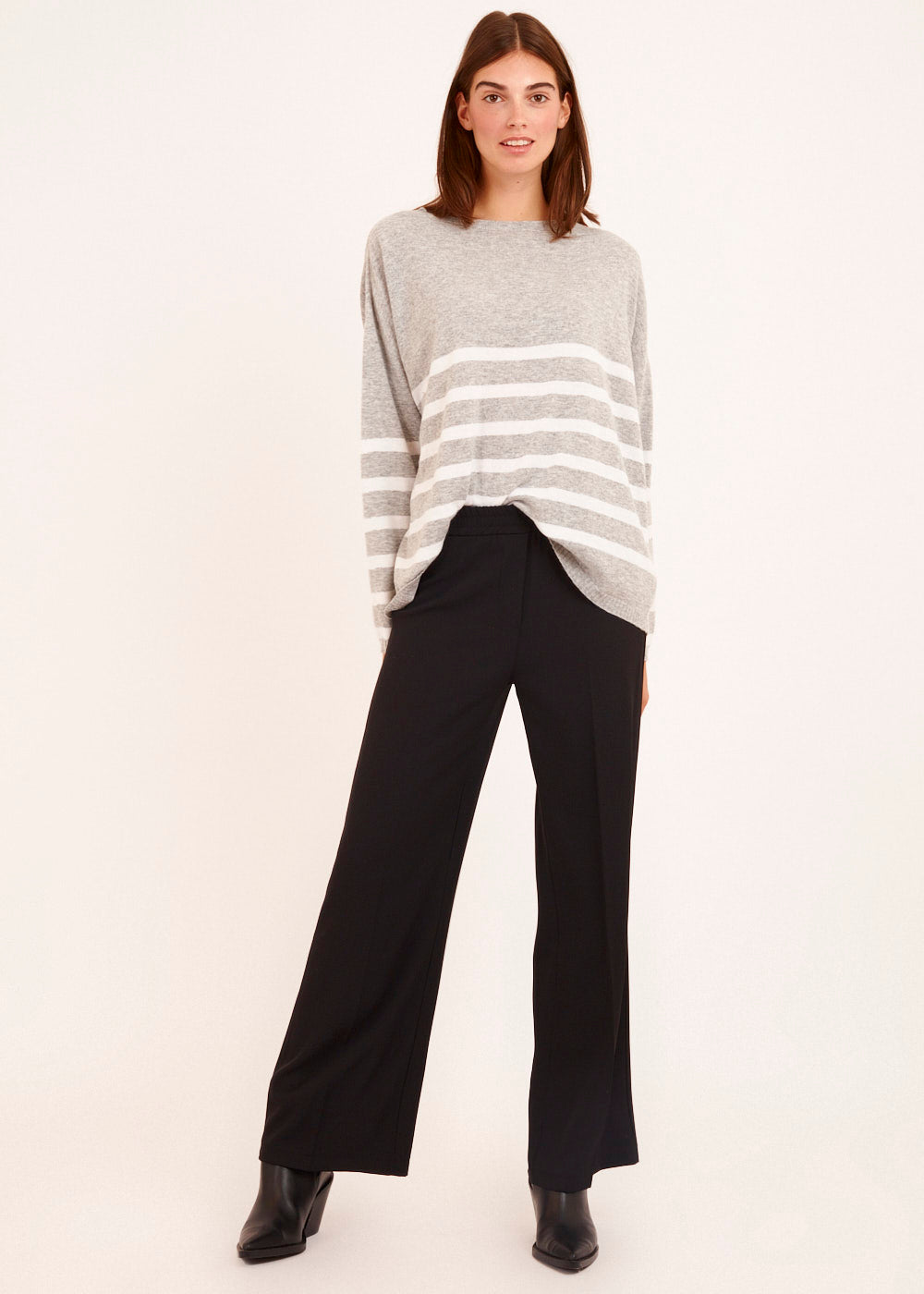 Die grauen Ringel verleihen dem Pullover eine dezente, aber dennoch ansprechende Optik. Sie passen zu vielen verschiedenen Outfits und sind vielseitig kombinierbar. Ob du ihn zu Jeans, einer Leggings oder einem Rock tragen, dieser Pullover ergänzt deinen Look auf stilvolle Weise.