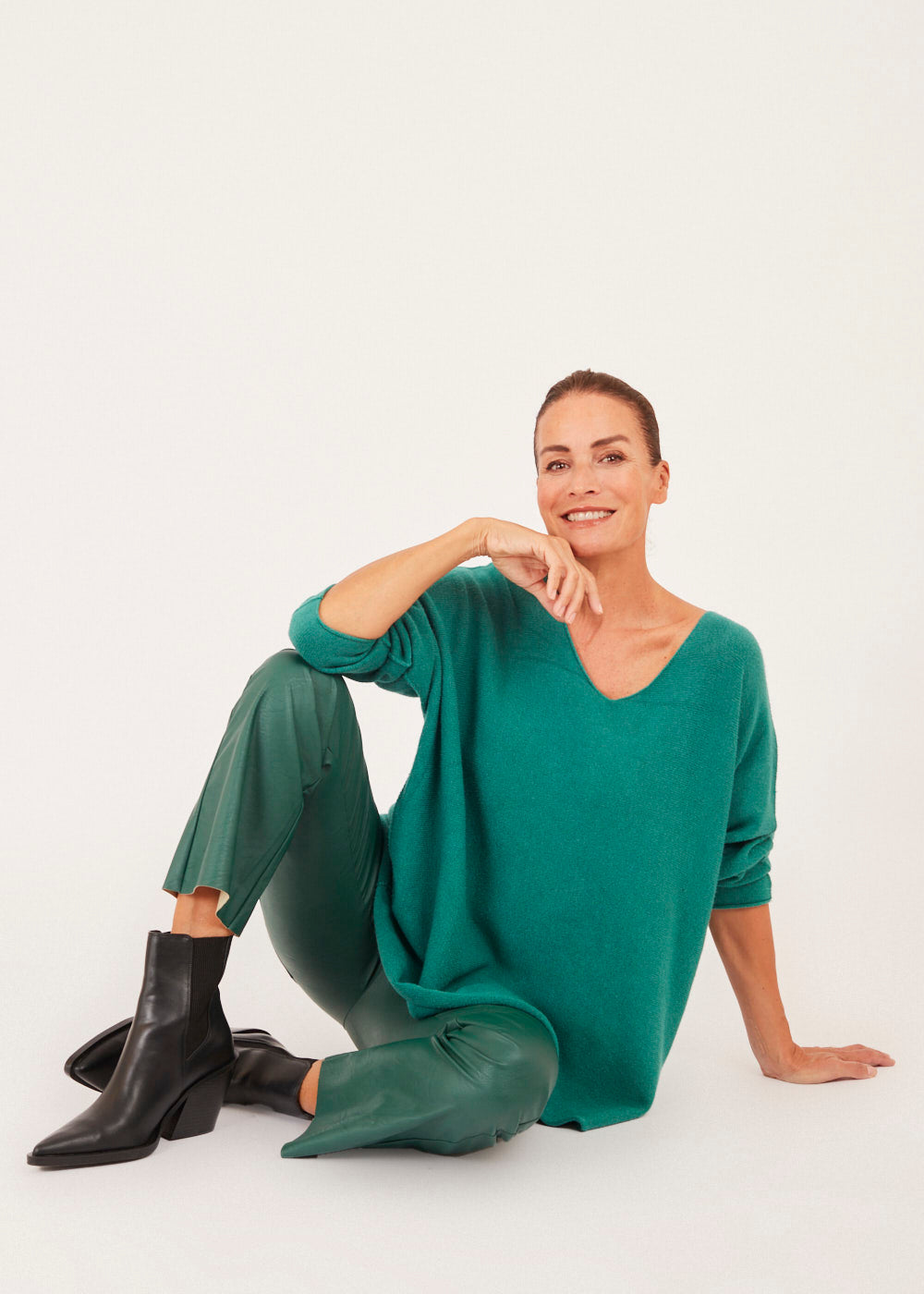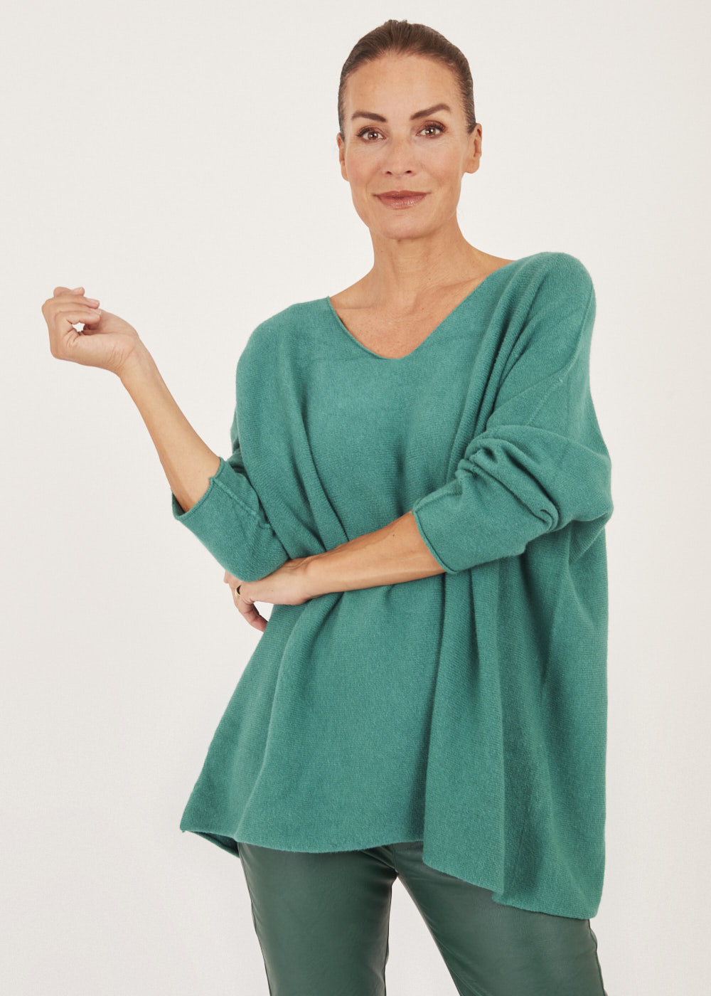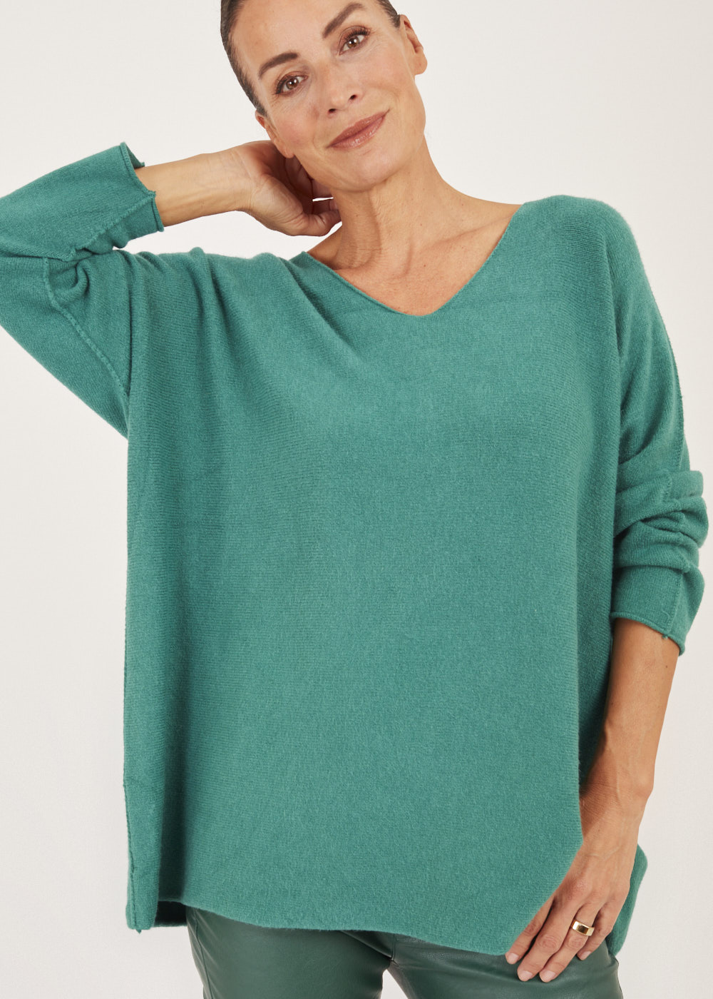 Leichter und gemütlicher Oversizepullover mit V-Ausschnitt. Mit überschnittenen Ärmeln aus unserem Kuschelgarn. Einfach zum Wohlfühlen. Kombiniere diesen Artikel gerne mit einer unserer Please Fashion Hosen.