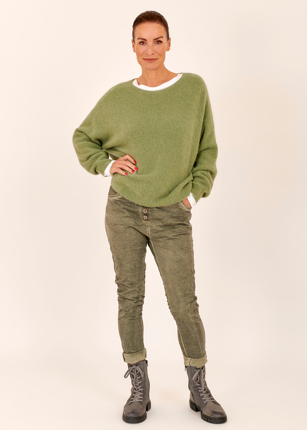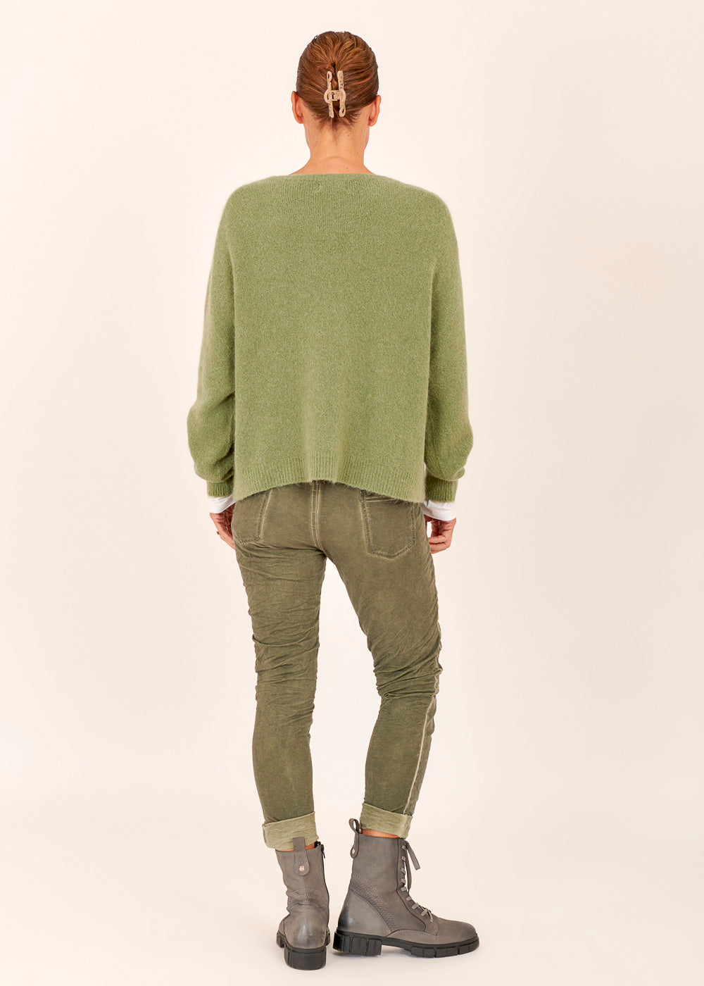 Leichter und gemütlicherPullovermit V-Ausschnitt. Mit überschnittenen Ärmeln aus einem Materialmix mit Alpaka. Rippenbündchen an den Ärmeln und Schlitzen an den Seiten. Einfach zum Wohlfühlen. Kombiniere diesen Artikel gerne mit einer unserer Please Skinny Jeans.