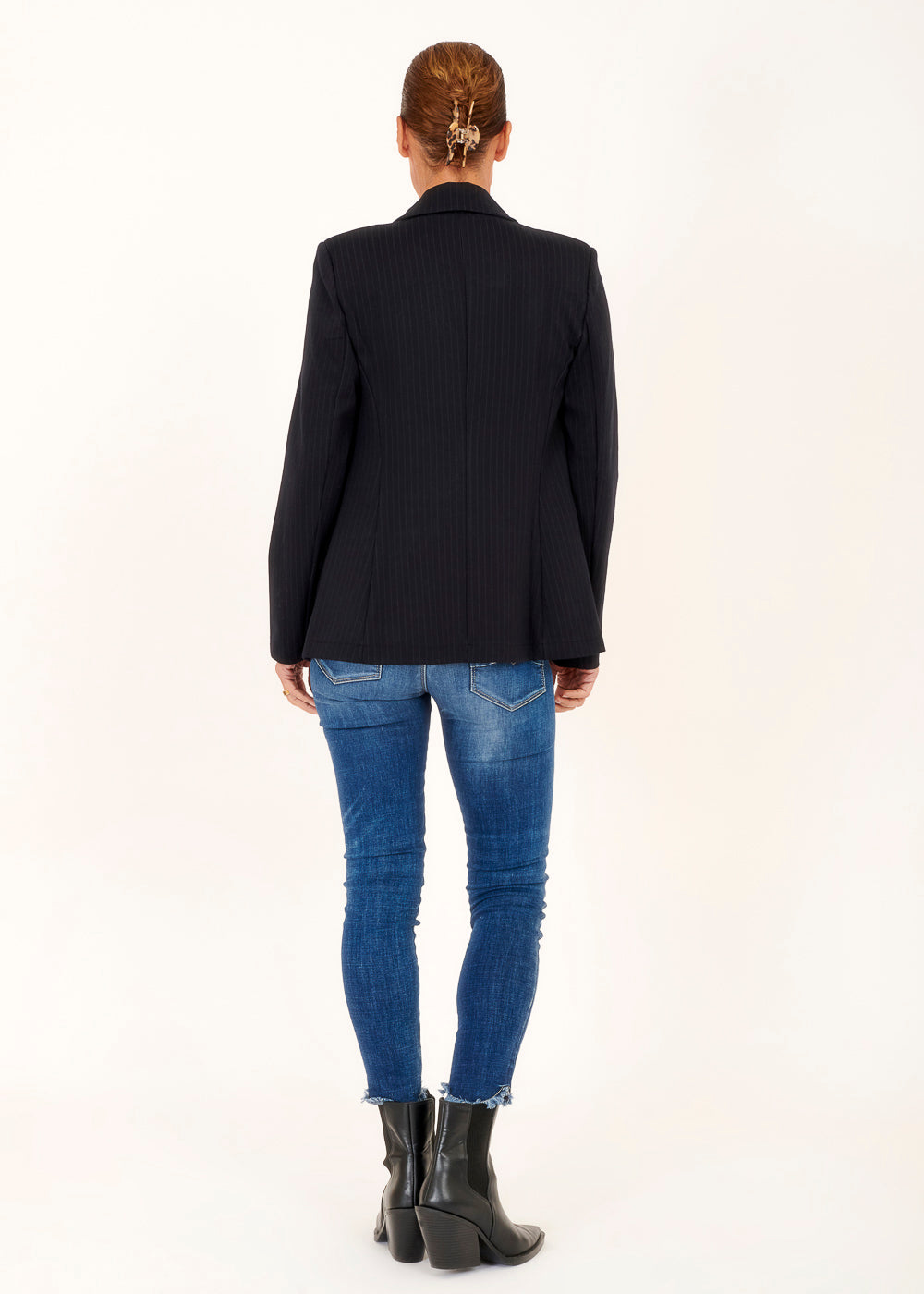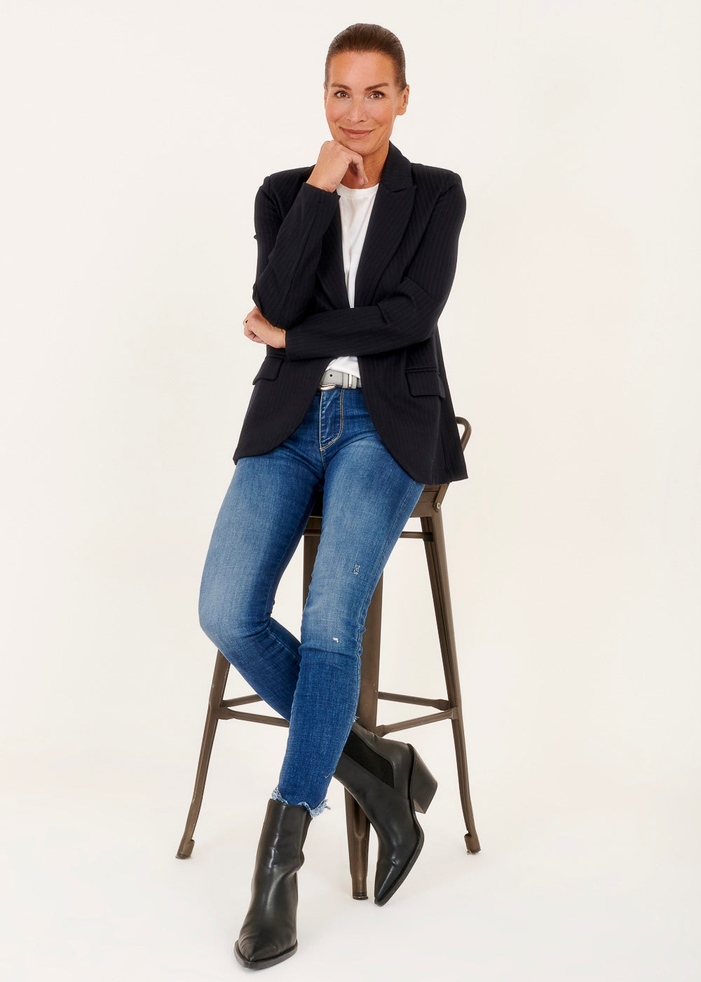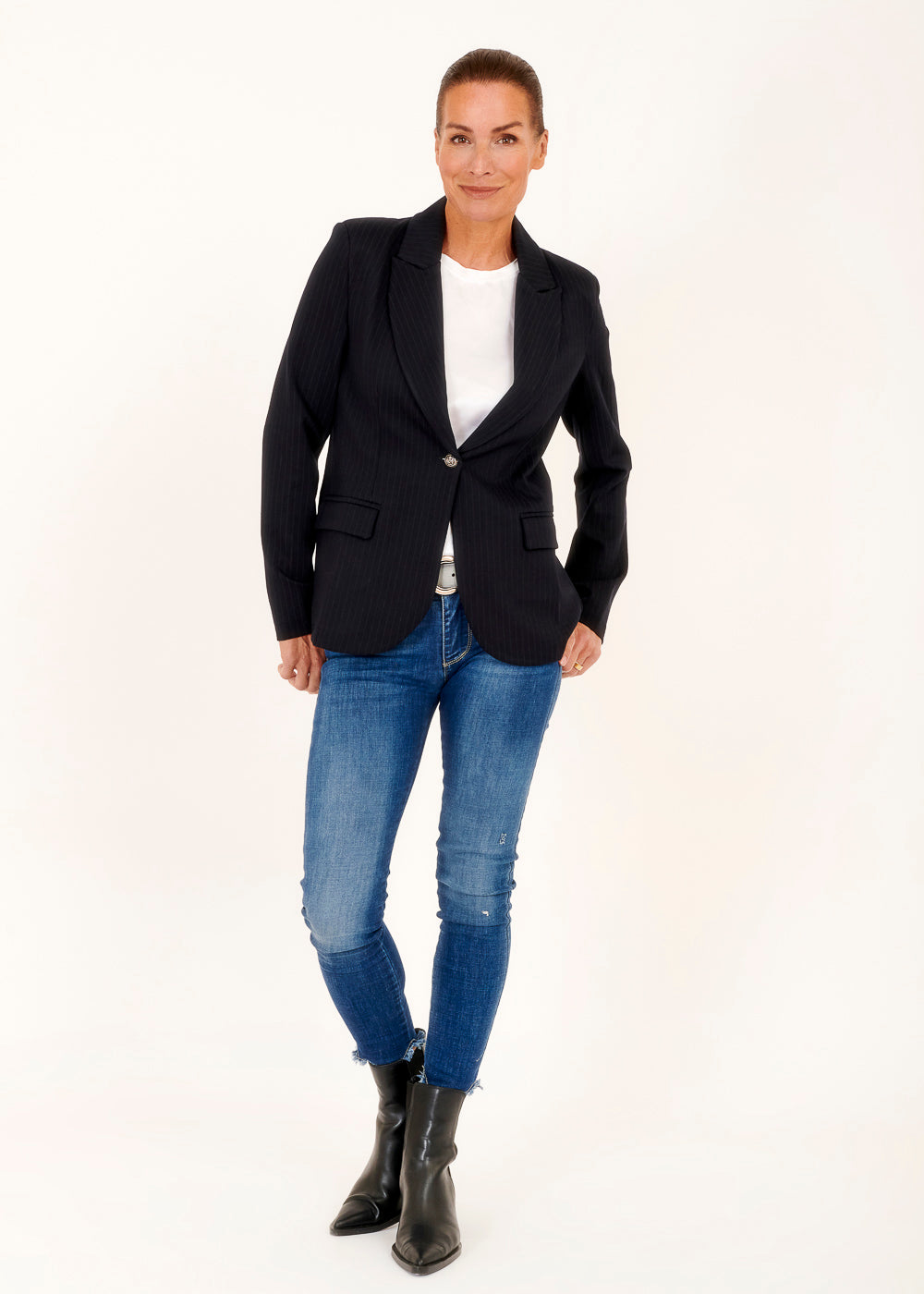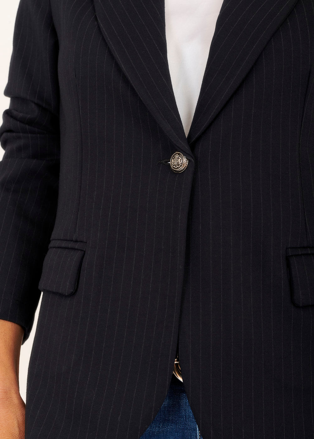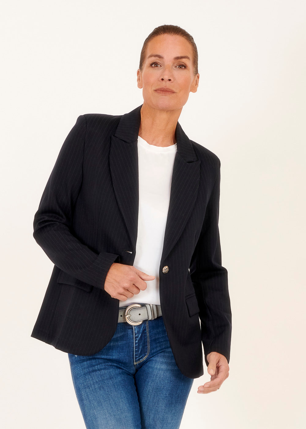 Mit diesem Nadelstreifen-Blazer setzt du ein klares Statement für Eleganz und Stil. Ganz gleich, ob im Büro, bei geschäftlichen Meetings oder im Alltag – dieser Blazer wird dich stets souverän und modisch begleiten.