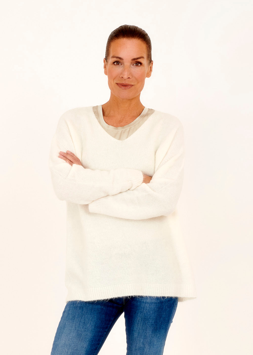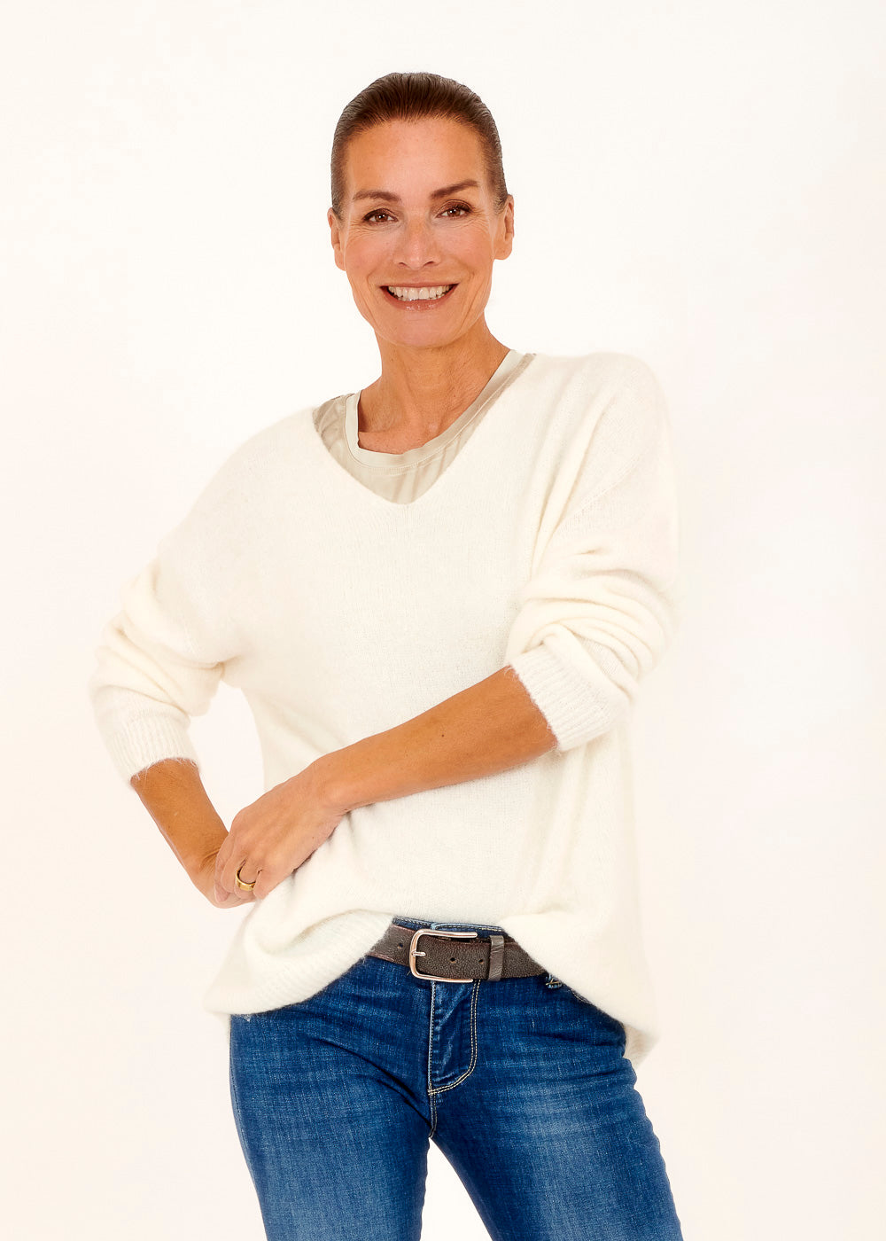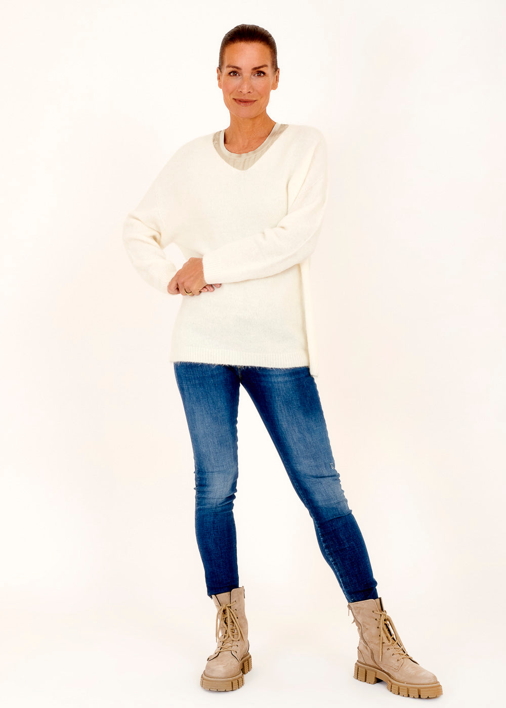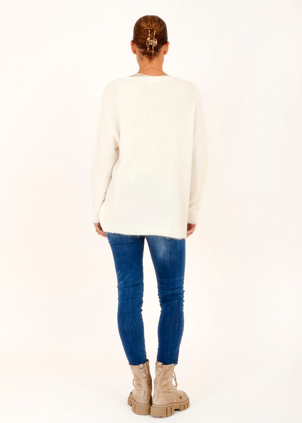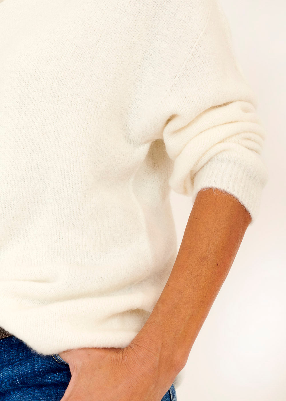 Leichter und gemütlicher lässiger Pullover . Mit überschnittenen Ärmeln aus einem Baby Alpaka Mix. Rippenbündchen an den Ärmeln und Schlitzen an den Seiten. Einfach zum Wohlfühlen. Kombiniere diesen Artikel gerne mit einer unserer Skinny Jeans.