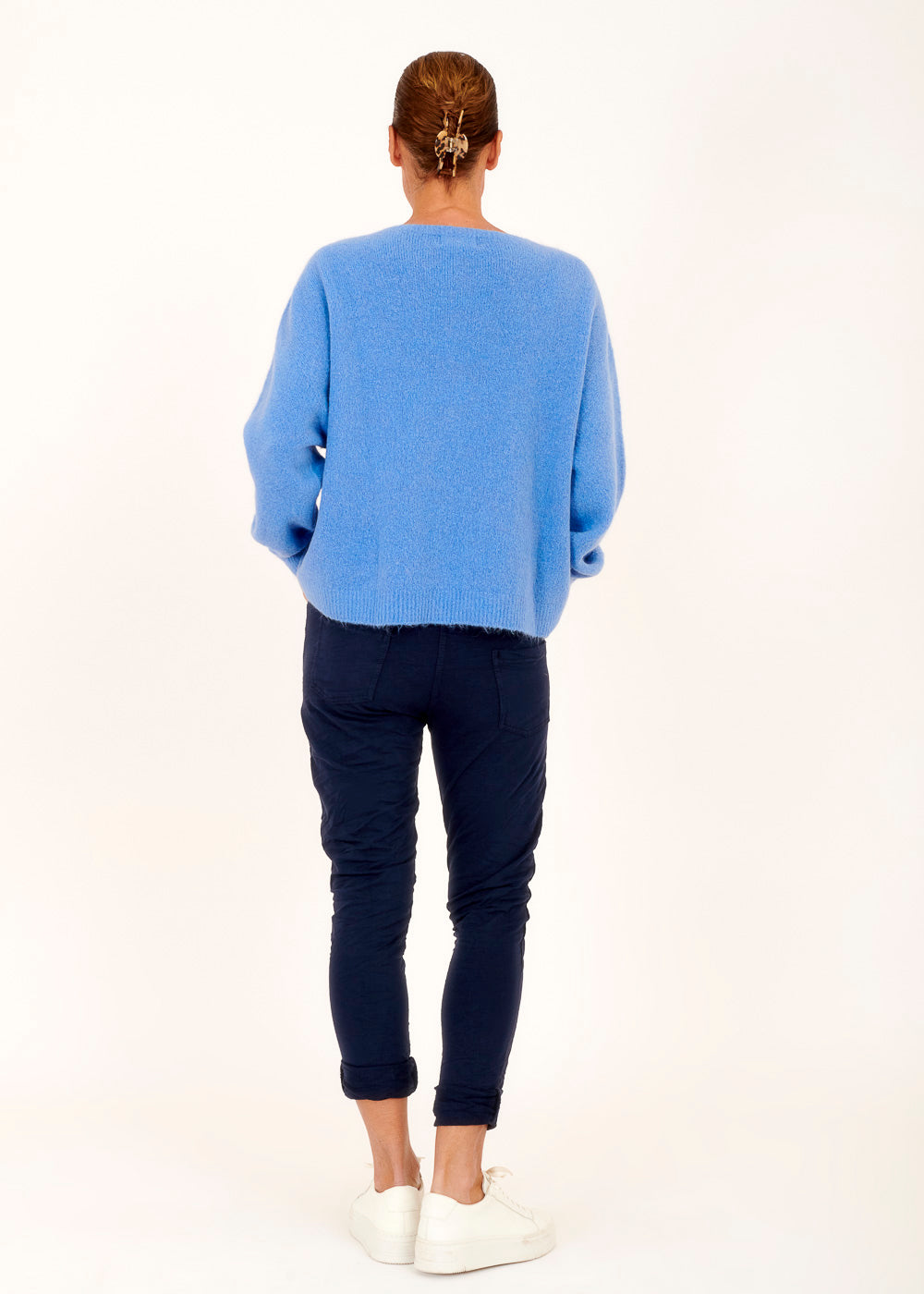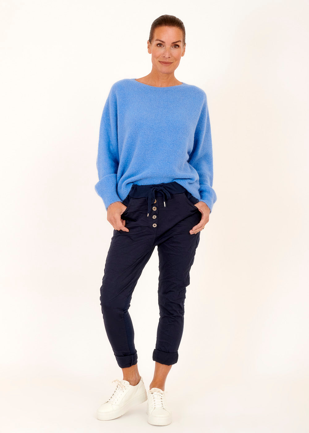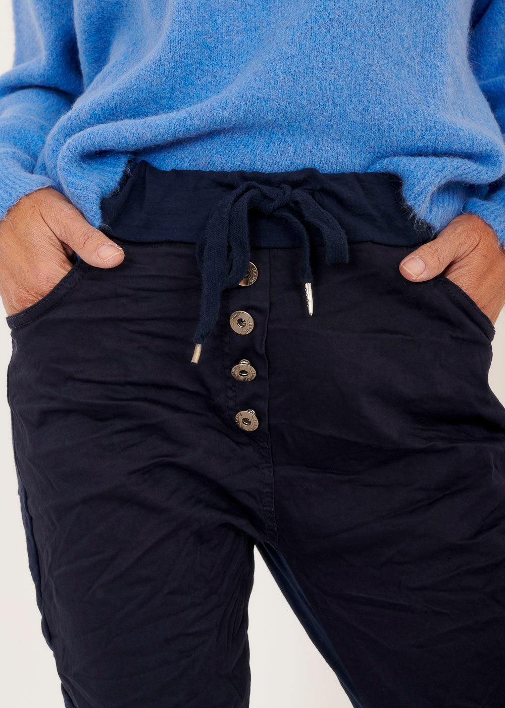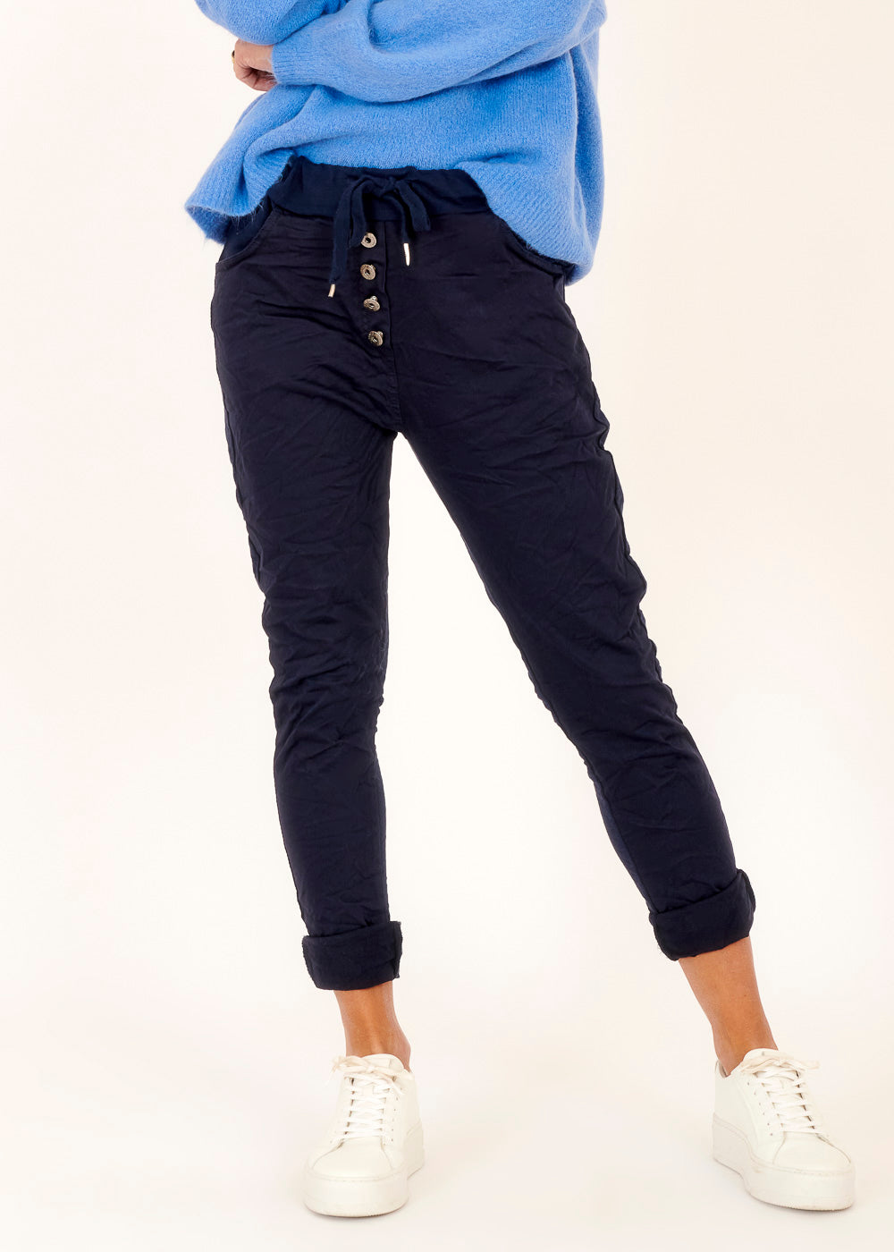 Unser Bestseller! Hose aus Viskose und Elasthan. Dadurch sitzt sie super bequem und lässt sich prima zu Allem kombinieren. Gummizug im Bund, Tunnelzug mit Band, seitliche Eingriffstaschen und Knopfleiste