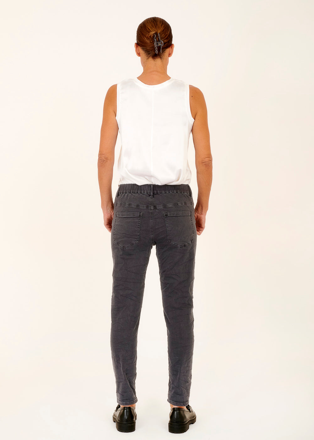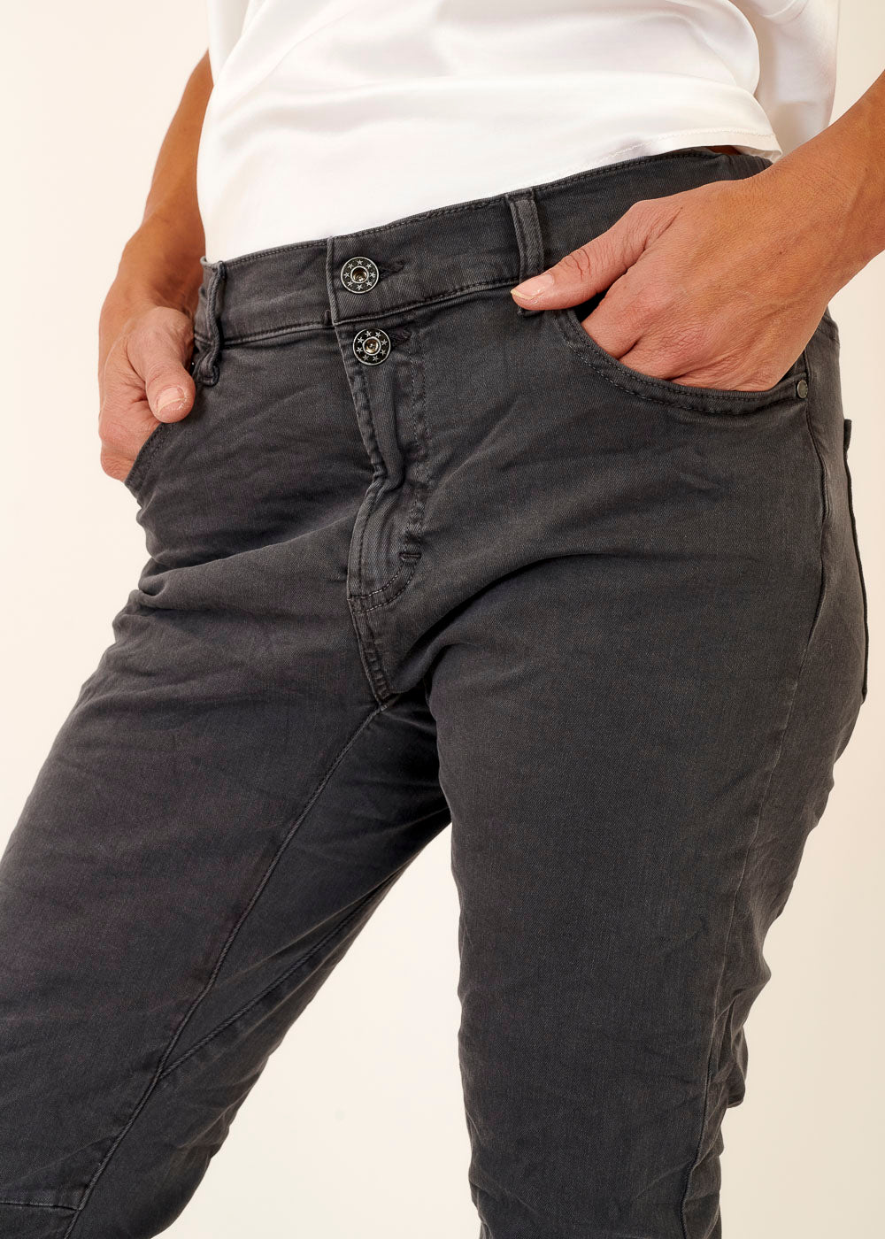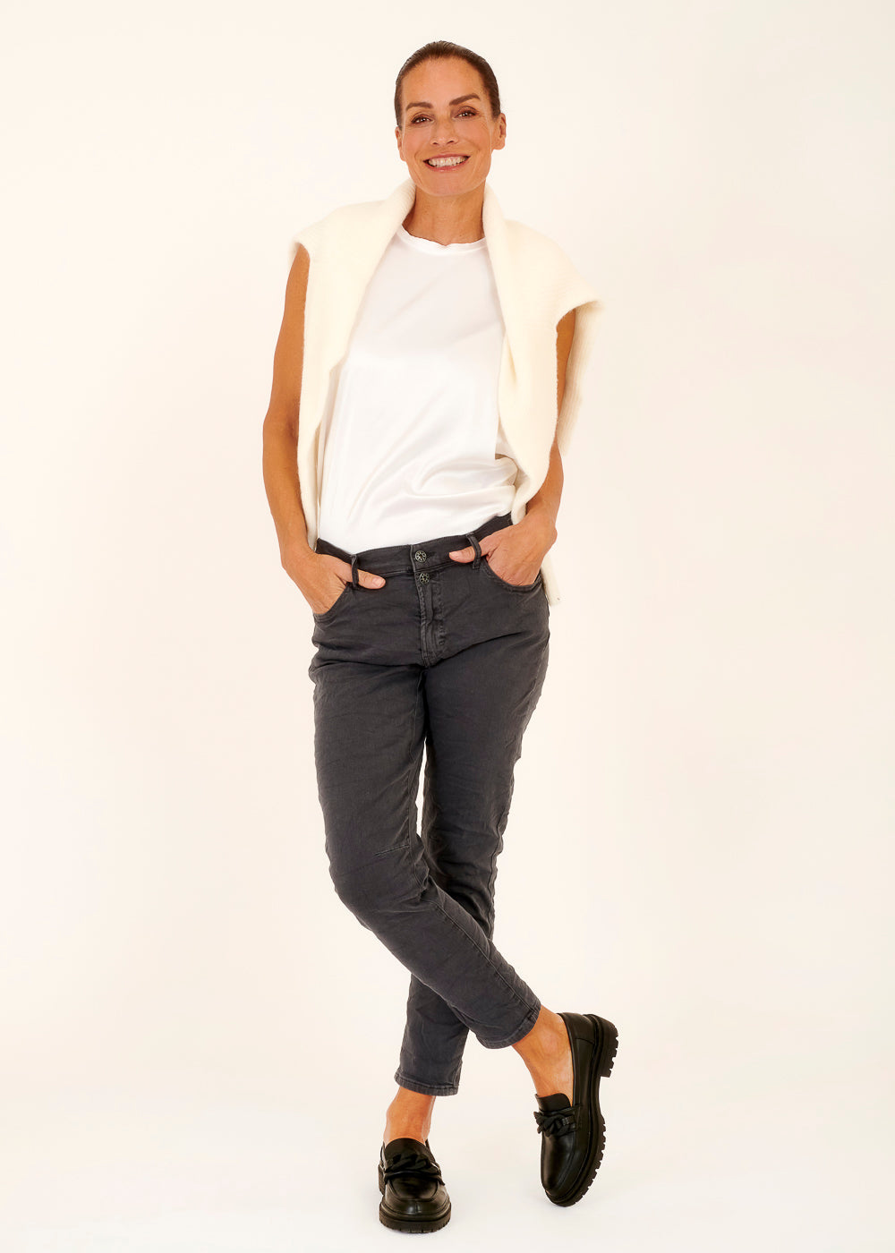 Boyfriend-Fit Jeans . Sie sitzt locker auf den Hüften und eine Knopfleiste mit 2 Metallknöpfen vorn. Klassischer 5-Pocket Stil, mit dem einem hohen Elasthan Anteil. Einfach zum wohlfühlen.