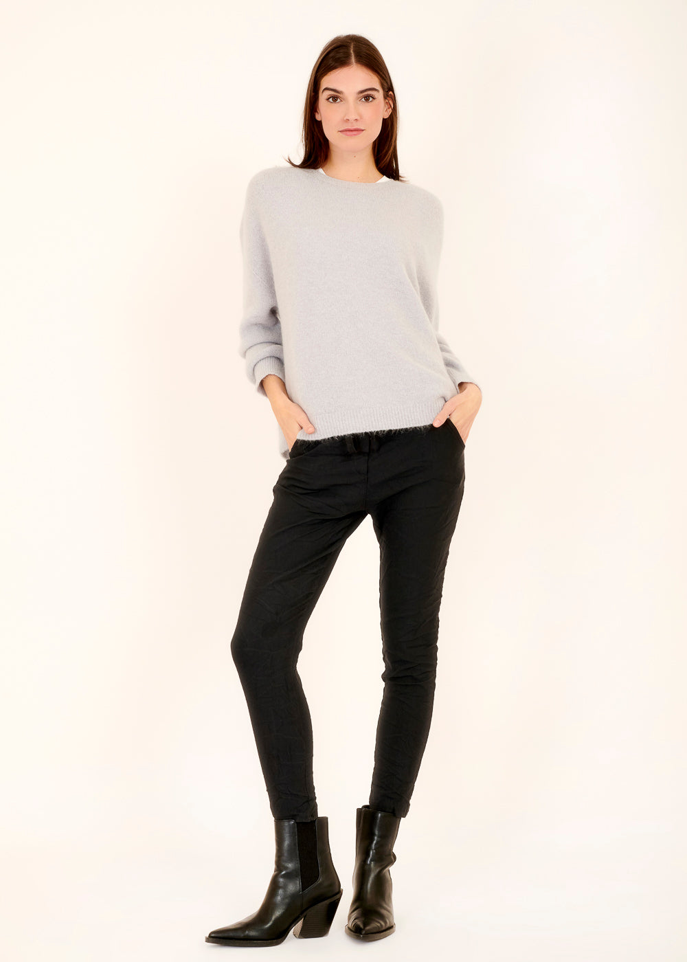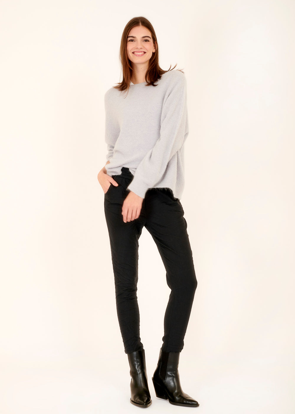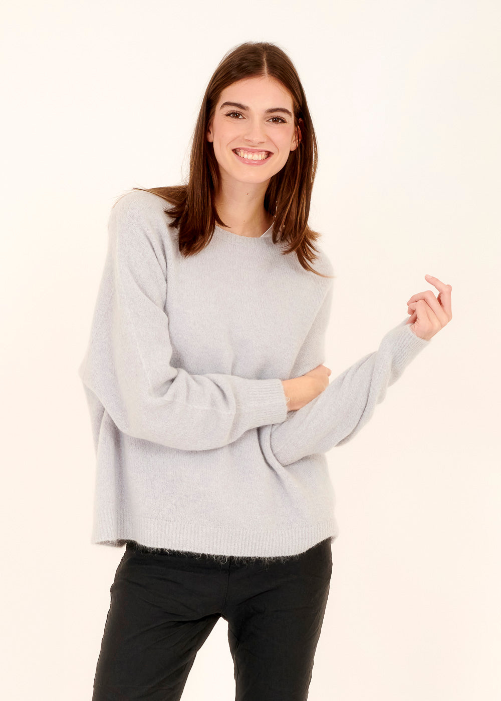 Gemütlicher lässiger Rundhals Pullover in einem wunderschöne Celeste Ton. Der gemütliche Schnitt dieses Pullovers sorgt für eine entspannte und lockere Passform. Er ist kuschlig weich, aus einem Baby Alpaka Mix. Unser Pullover Liebling!