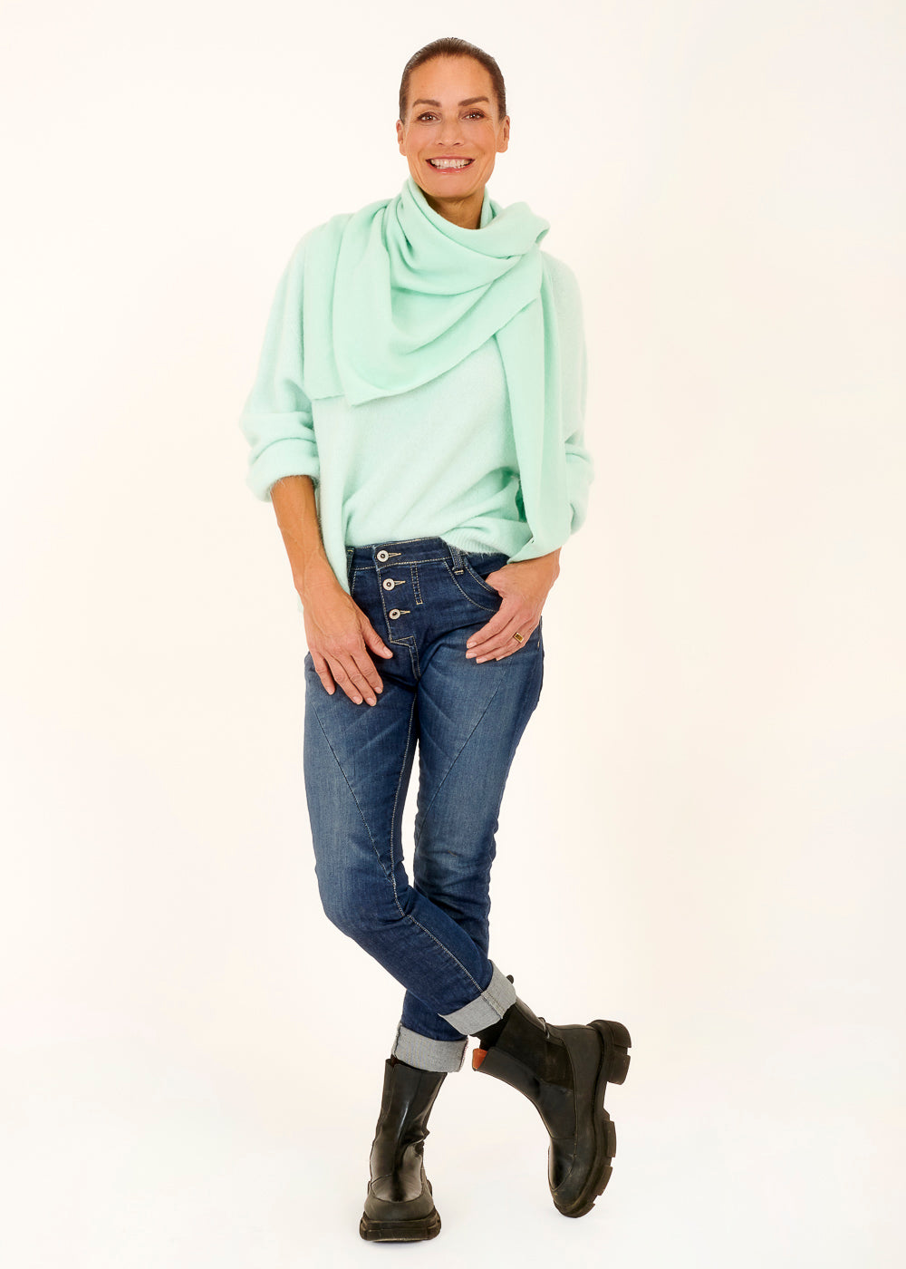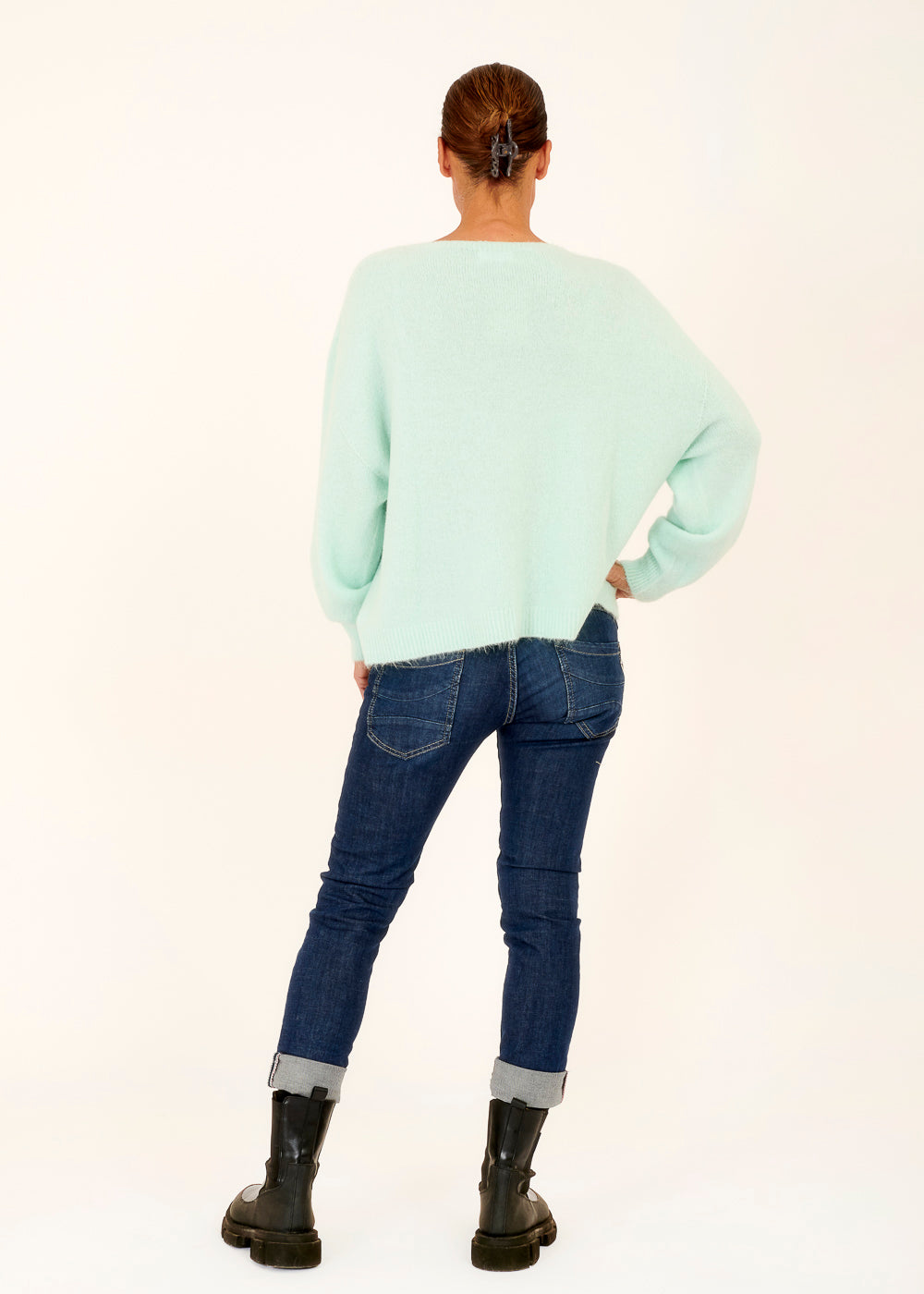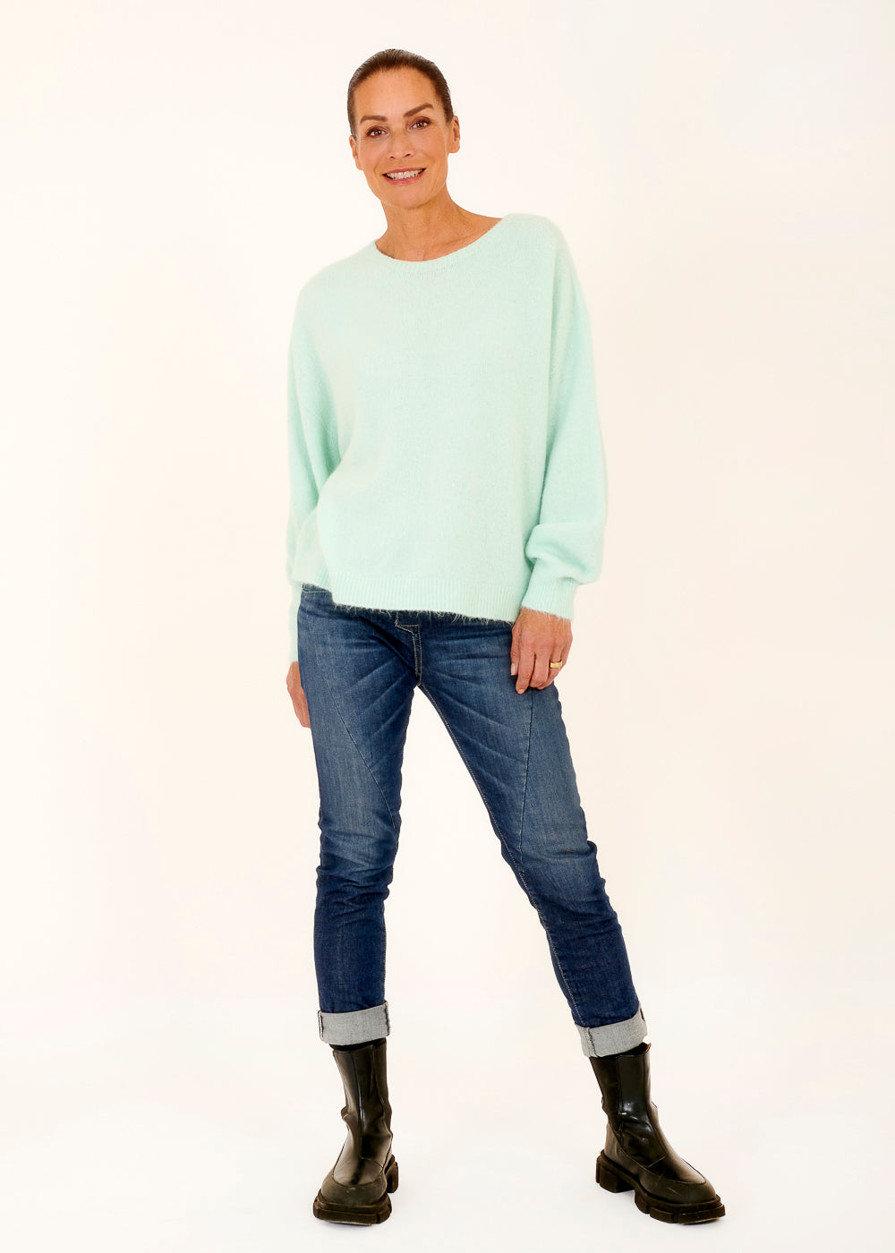 Gemütlicher lässiger Rundhals Pullover in einem wunderschöne Aqua Ton. Der gemütliche Schnitt dieses Pullovers sorgt für eine entspannte und lockere Passform. Er ist kuschlig weich, aus einem Baby Alpaka Mix. Unser Pullover Liebling!