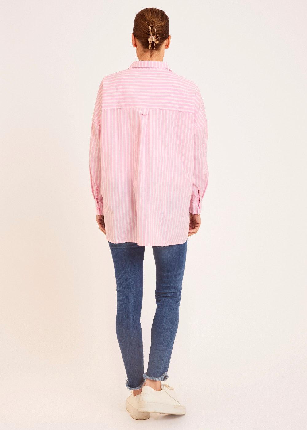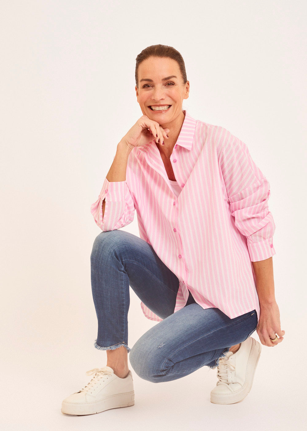 Das Trend Must-Have. Diese gestreifte Bluse im Hemdkragen Stil ist lässig geschnitten und hat ein leicht verlängertes Rückenteil. Gestreifte Blusen sind vielseitige Kleidungsstücke, die sich leicht in deinen Look integrieren lassen. Ob du sie als lässige Freizeitkleidung oder als formales Business-Outfit trägst, eine gestreifte Bluse kann immer eine stilvolle Wahl sein.