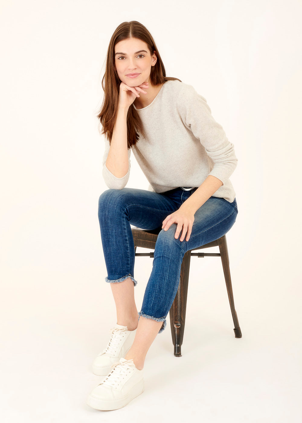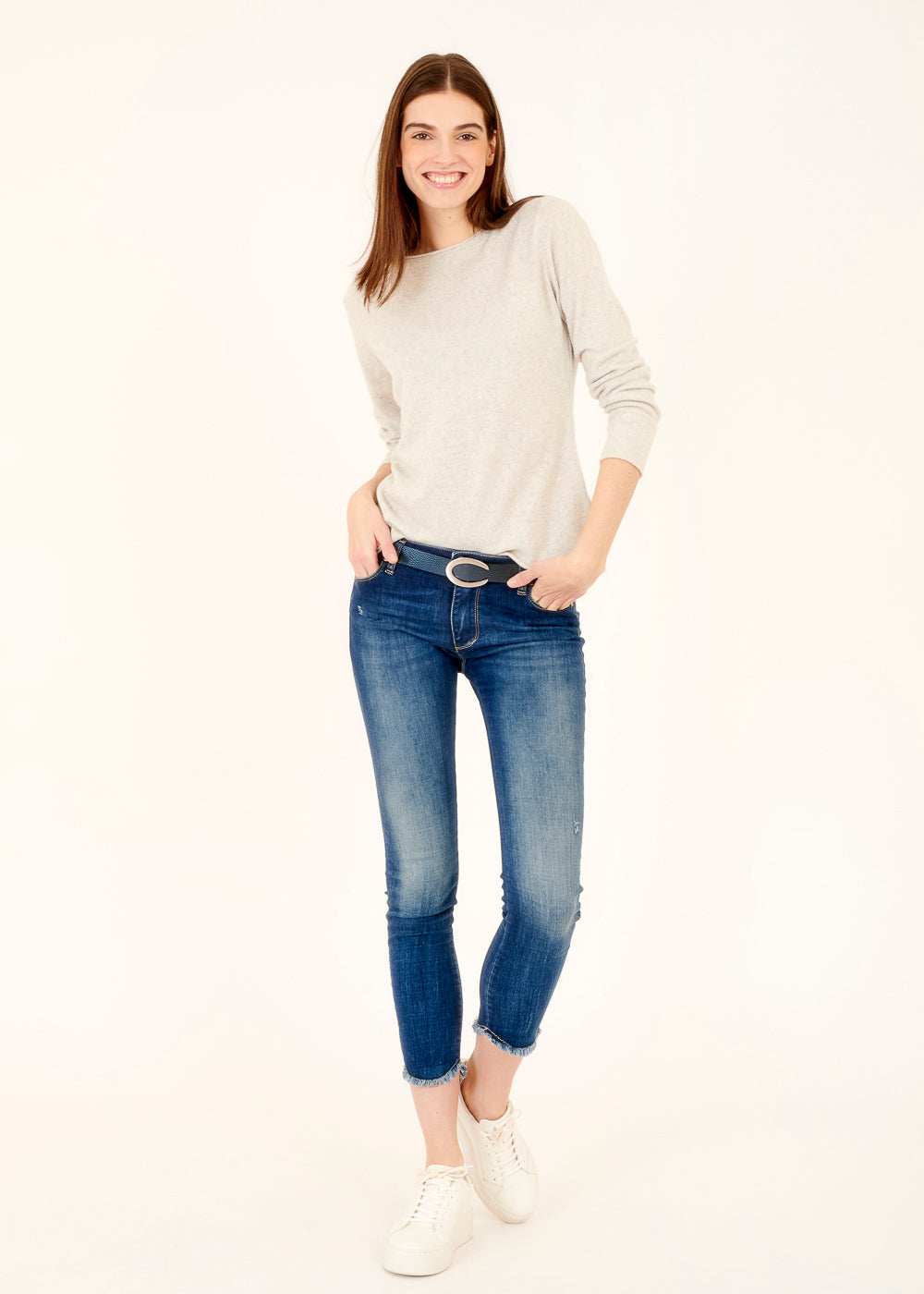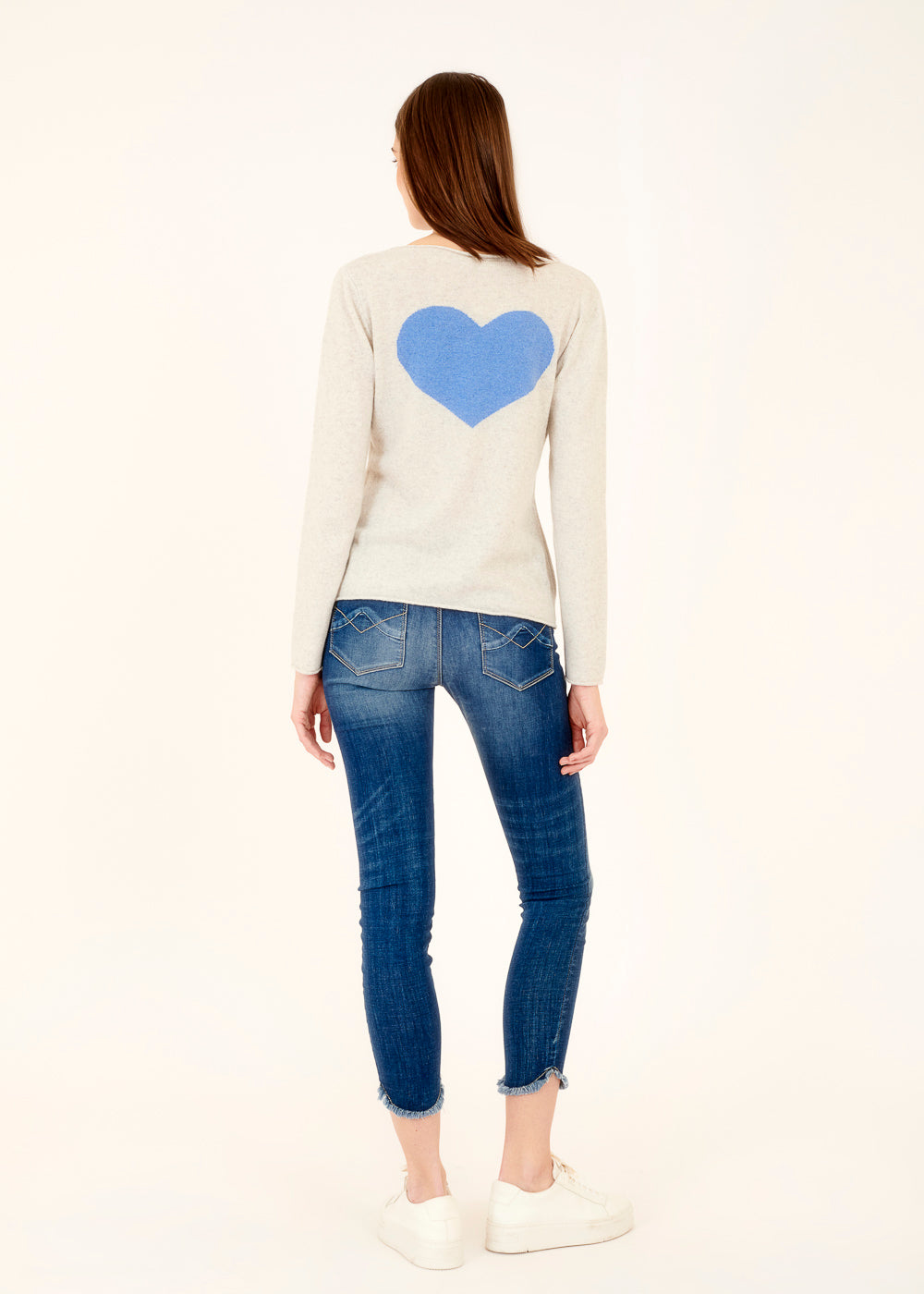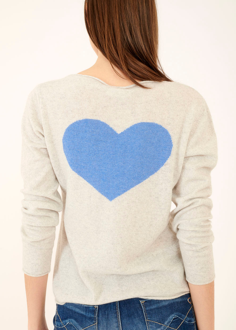 Der schmale Schnitt verleiht dem Pullover eine moderne und schicke Silhouette, die perfekt zu verschiedenen Anlässen passt. Das dezente Grau macht ihn vielseitig kombinierbar, während das blaue Herz auf der Rückseite einen charmanten Akzent setzt.