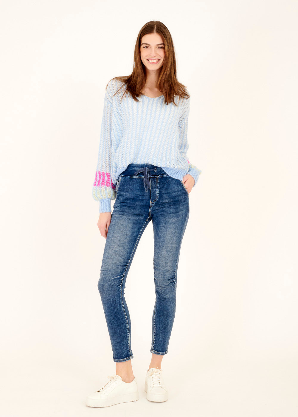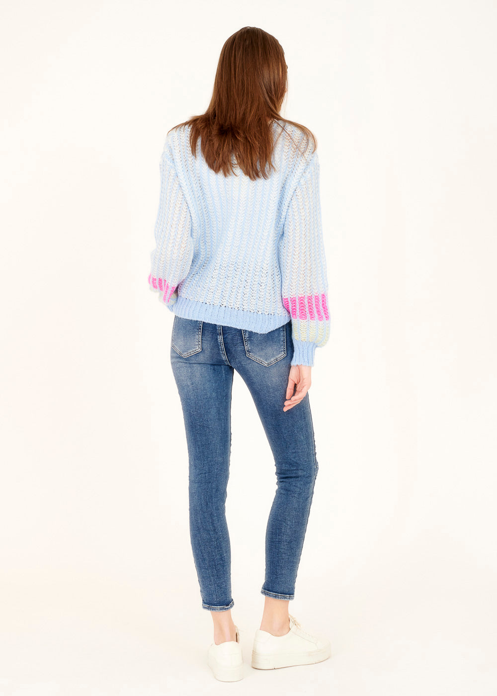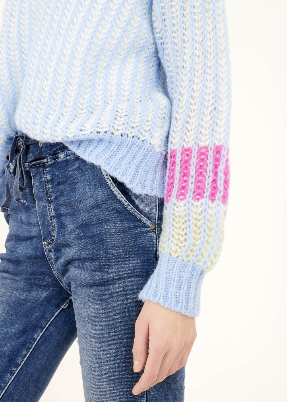 Hergestellt aus hochwertigem Material bietet der Pullover nicht nur einen angenehmen Tragekomfort, sondern auch eine einzigartige Kombination von Farben und Mustern. Die verspielten Elemente an den Ärmeln verleihen dem Pullover das gewisse Extra und machen ihn zu einem echten Blickfang.