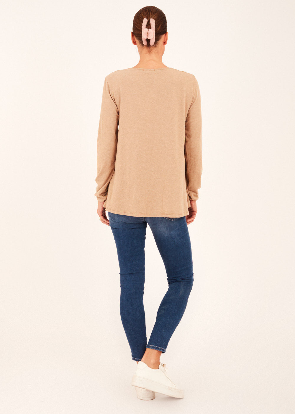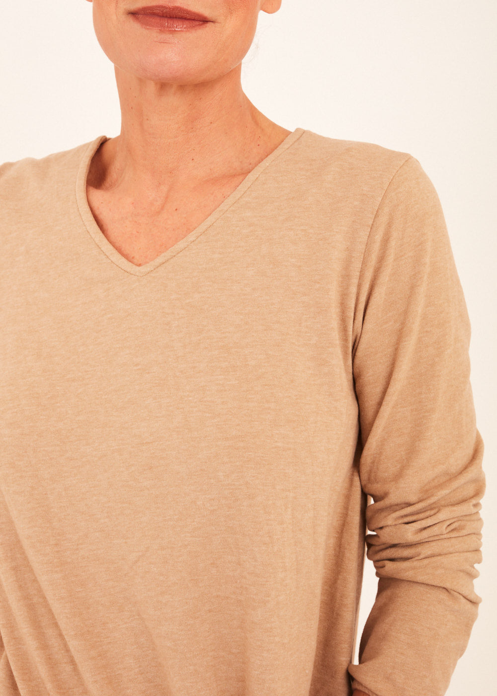 Mit seinem kuscheligen Charme wird dieses V-Shirt schnell zu Ihrem Lieblingsstück im Kleiderschrank. Setzen Sie auf Wohlfühlmomente und Stil mit unserem beige-farbenen kuscheligen V-Shirt.