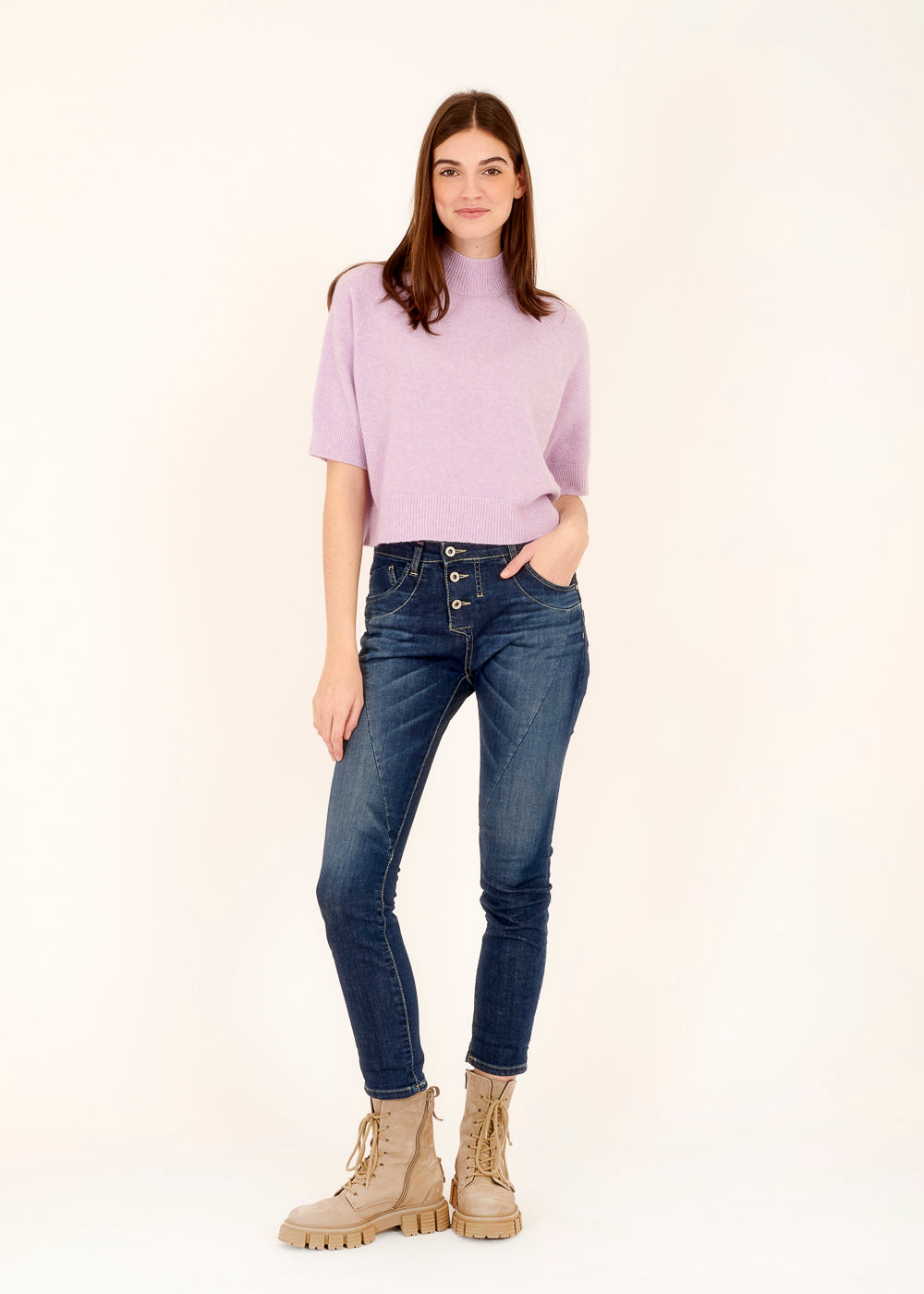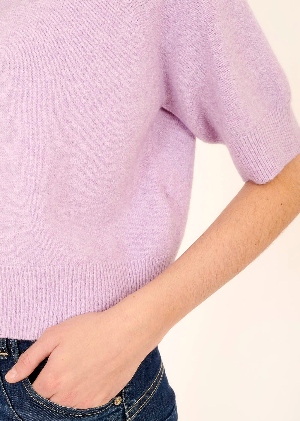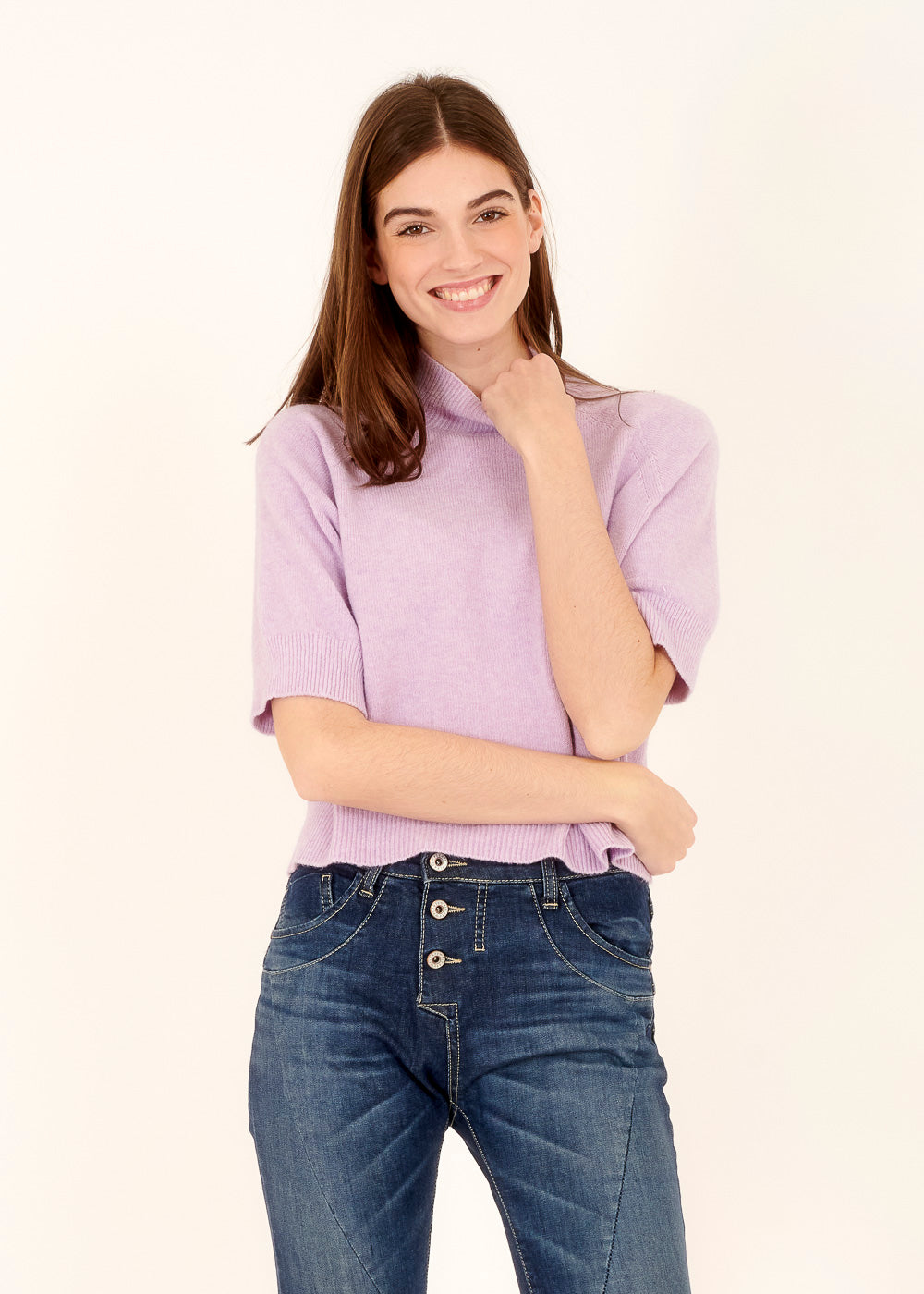 Kurz geschnittener Pullover mit kurzen Armen. Rippenbündchen an den Ärmeln und am Saum.  Durch seine Länge eignet er sich besonders gut für höher geschnittenen Jeans. Wir haben auch die passende Strickjacke in unserem Shop.