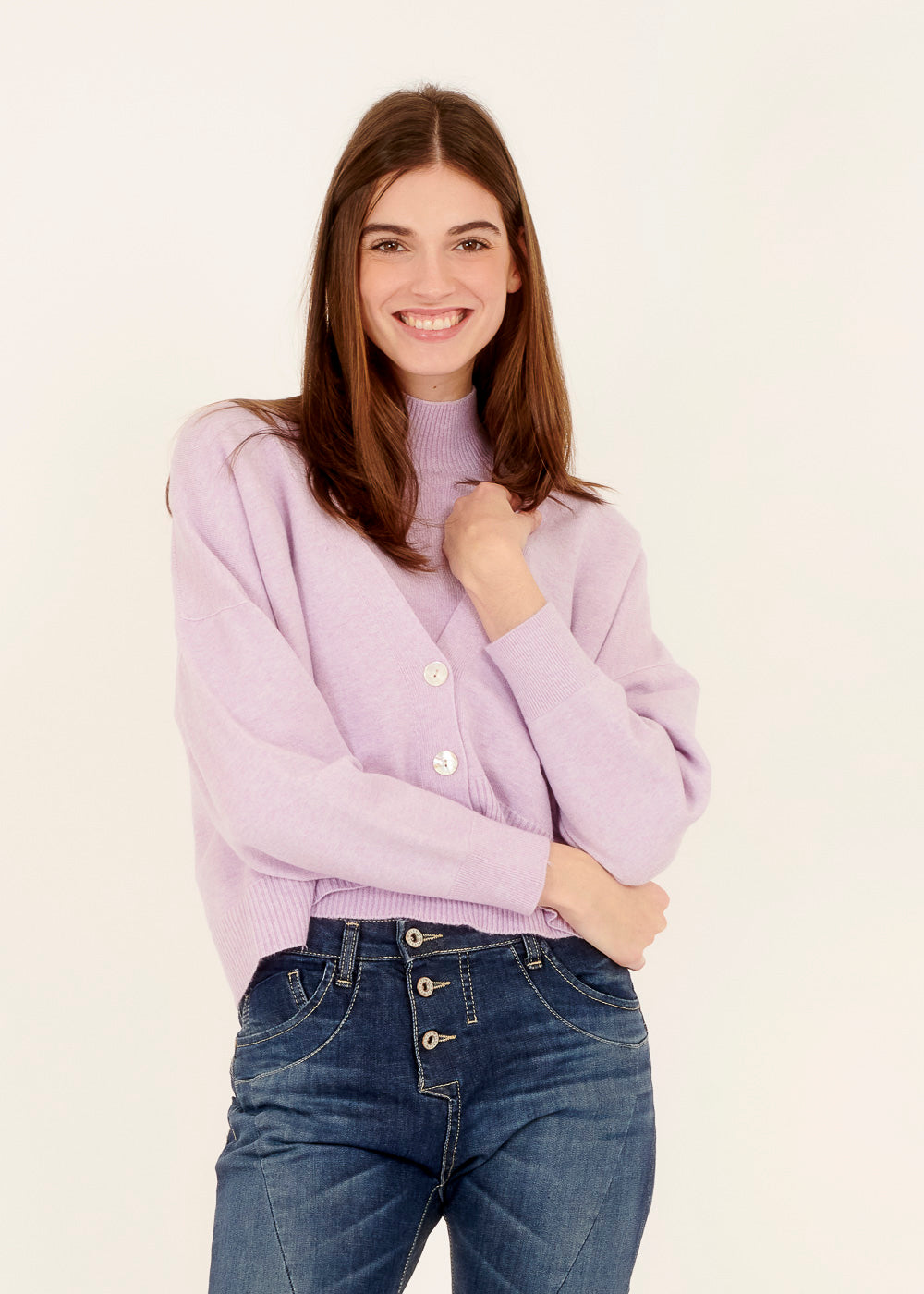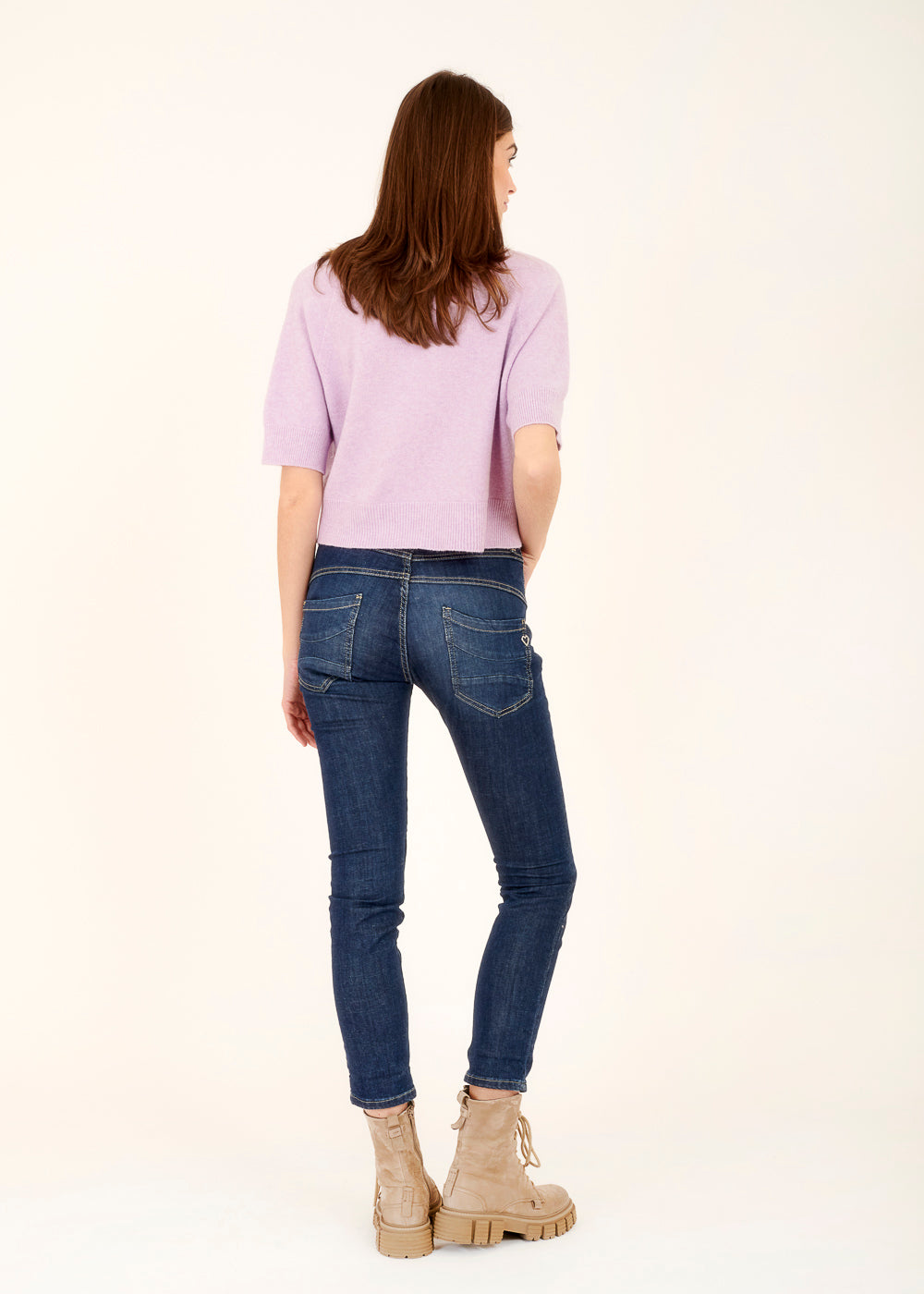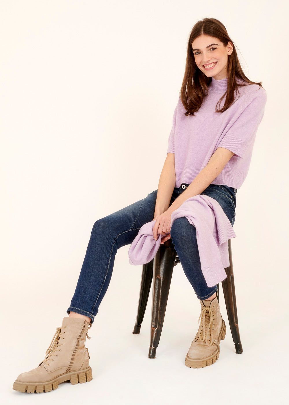 Kurz geschnittener Pullover mit kurzen Armen. Rippenbündchen an den Ärmeln und am Saum.  Durch seine Länge eignet er sich besonders gut für höher geschnittenen Jeans. Wir haben auch die passende Strickjacke in unserem Shop.