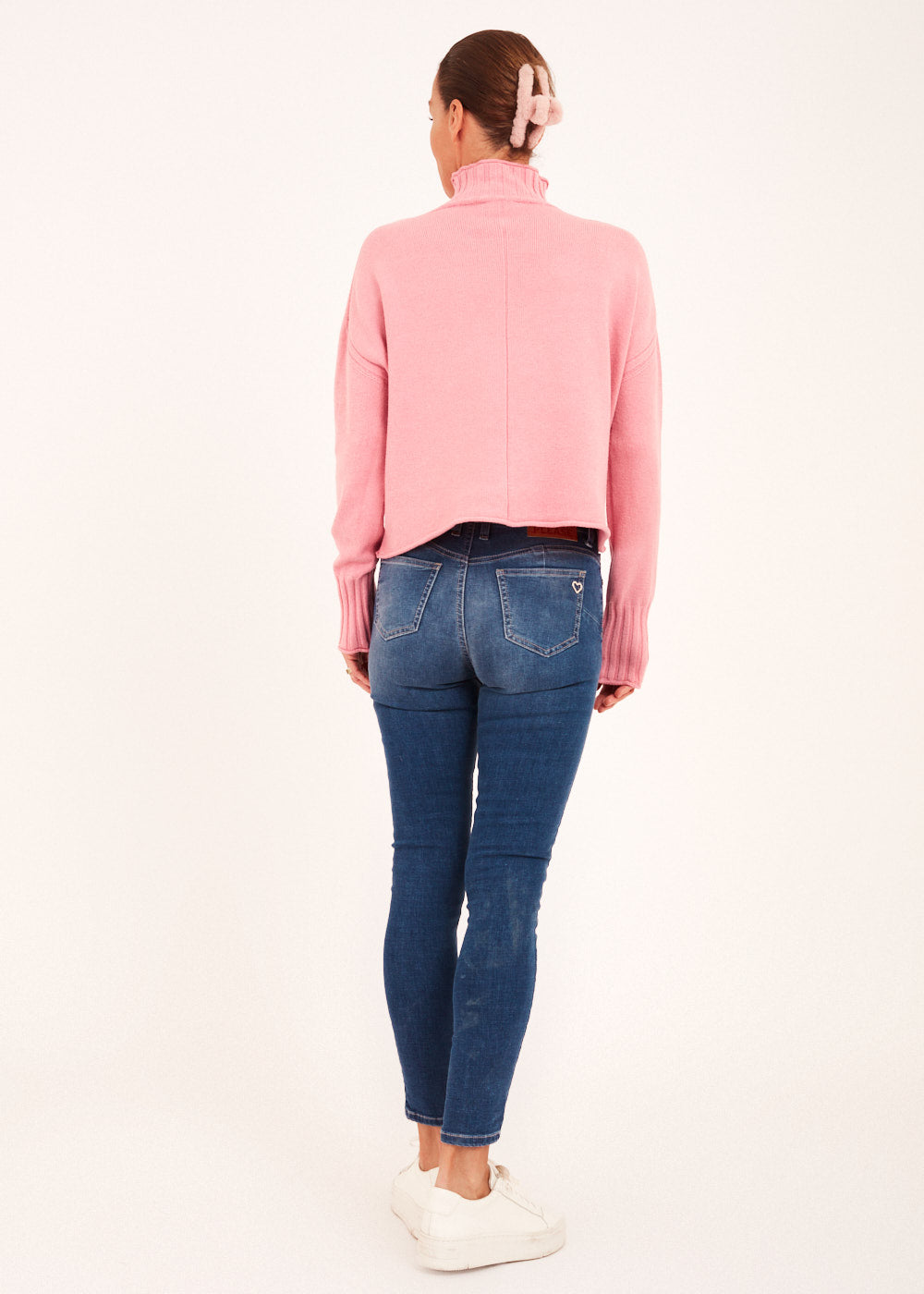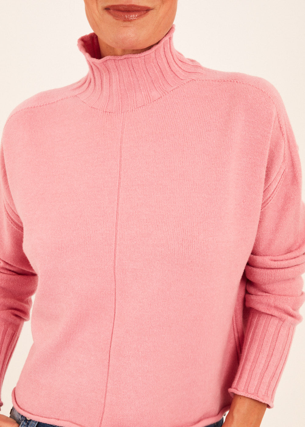 Stehkragenpullover – ein Trendsetter für selbstbewusste Fashion-Liebhaberinnen. Dieser Pullover in einem zarten Rosa ist nicht nur ein Blickfang, sondern auch ein Statement für Stil und Individualität.