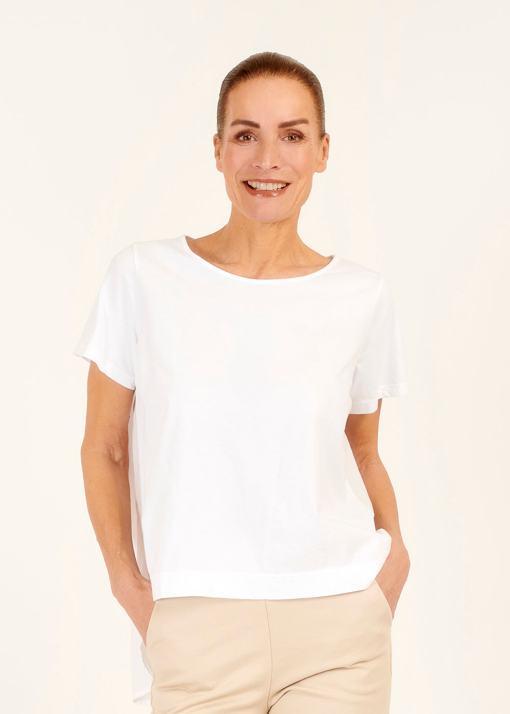 Ein Shirt, das deinen Look auf ein neues Level hebt: Unser Materialmix-Shirt in strahlendem Weiß mit rundem Halsausschnitt und raffinierten Details auf der Rückseite.