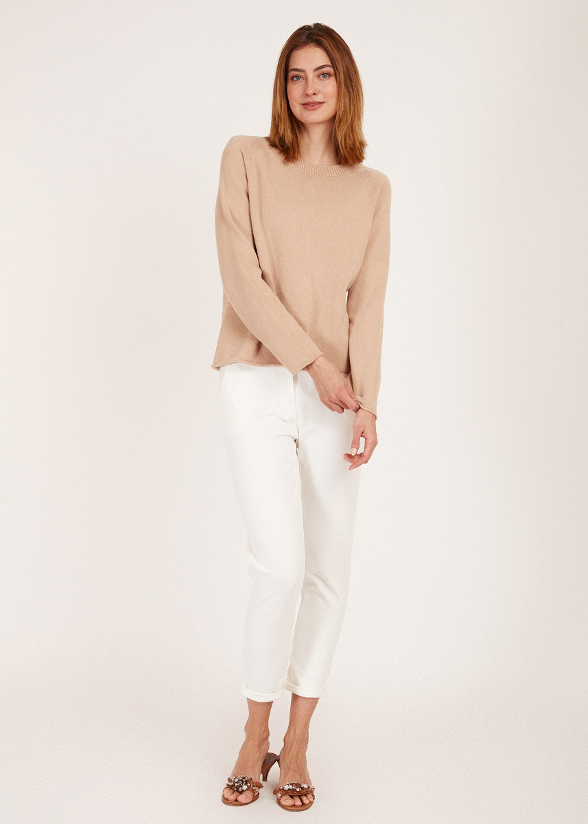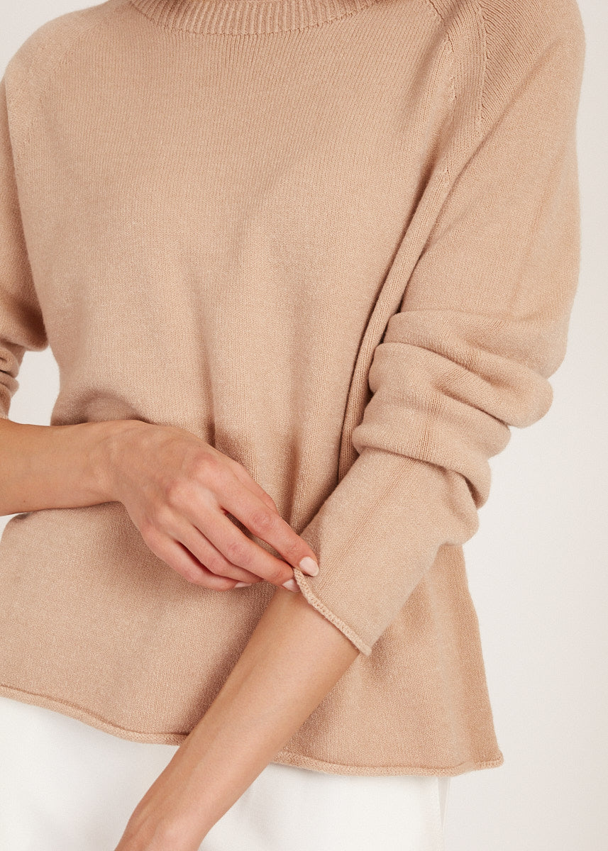 Entdecke unseren Pullover mit Rollkante in Sand - ein zeitloses Kleidungsstück, das Eleganz und Komfort vereint und dir einen Hauch von Luxus für deine Garderobe bietet.