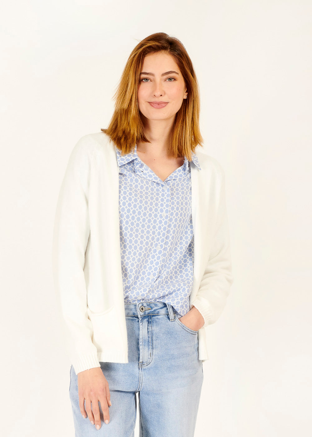 Der offene Schnitt ermöglicht es dir, diesen Cardigan mühelos über deinen Lieblings-Outfits zu tragen, sei es über einem schicken Kleid oder einer lässigen Jeans und einem T-Shirt. Die zeitlose Farbe Weiß macht ihn zu einem vielseitigen Stück, das sich leicht in deine Garderobe integrieren lässt.