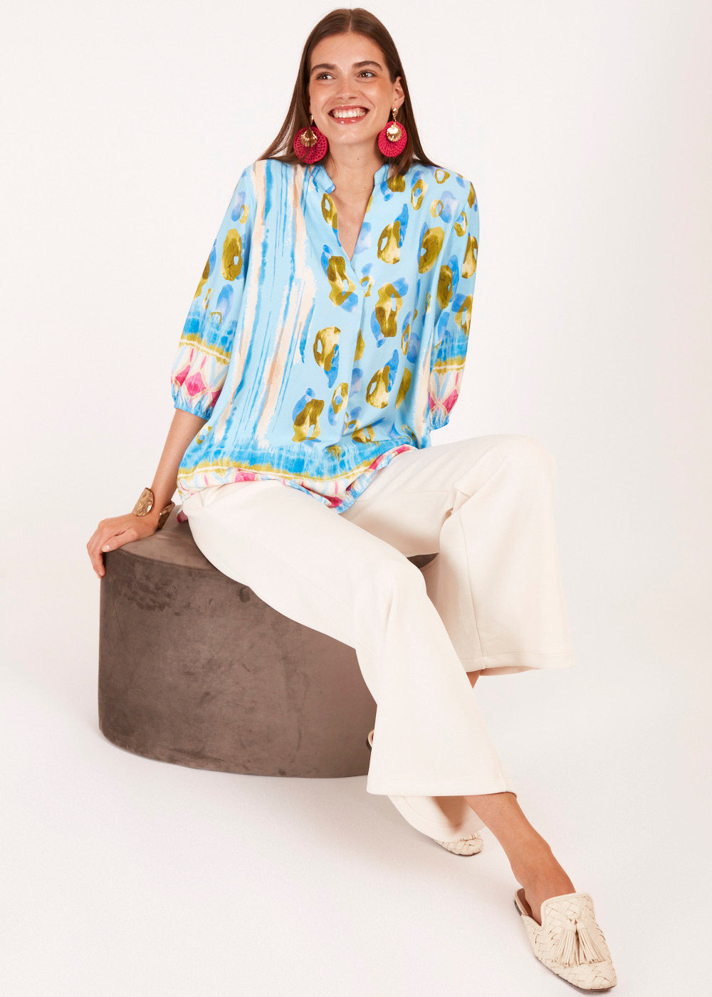 Diese stilvolle 3/4 Arm Druckbluse vereint Komfort und Eleganz, mit ihrem einzigartigen Muster und der schmeichelhaften Passform perfekt für jeden Anlass.