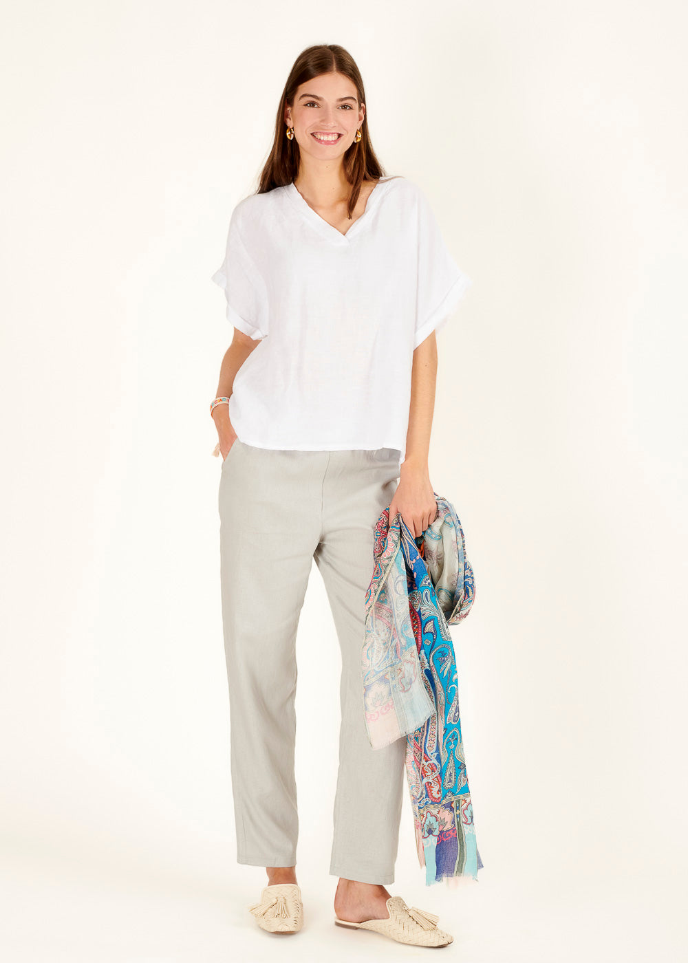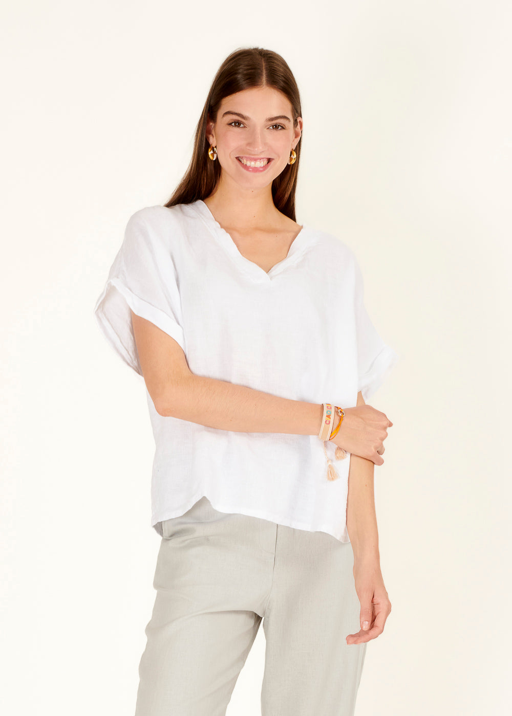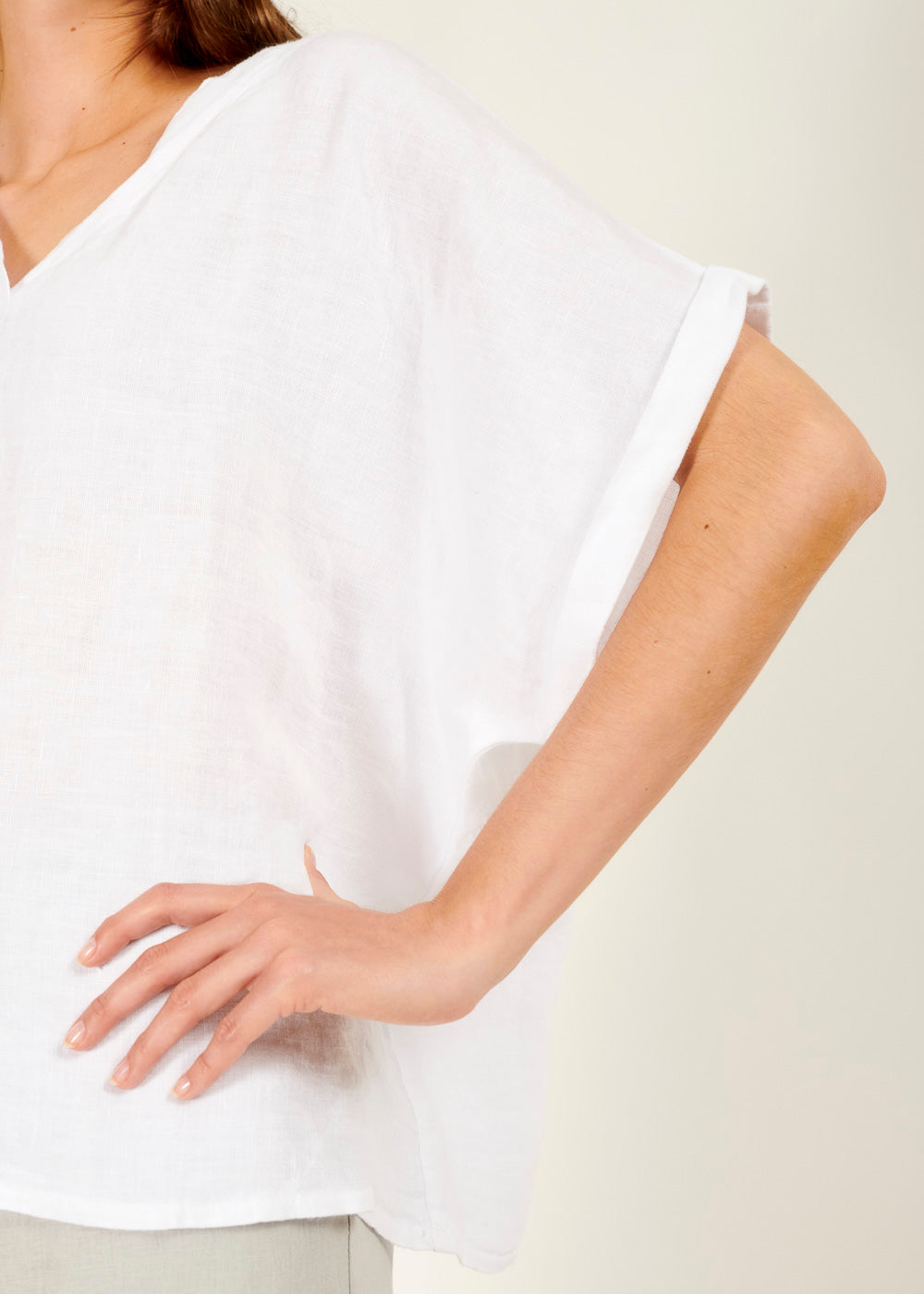 Unsere Leinentunika in Bianco-Ottico besticht durch ihre luftige Leichtigkeit und zeitlose Eleganz. Ideal für sommerliche Tage und stilvolle Auftritte.