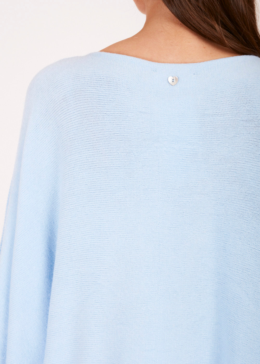 Der Kimonopullover in der Traumfarbe Cielo lässt sich ideal zu einer schicken, weißen Hose kombinieren.