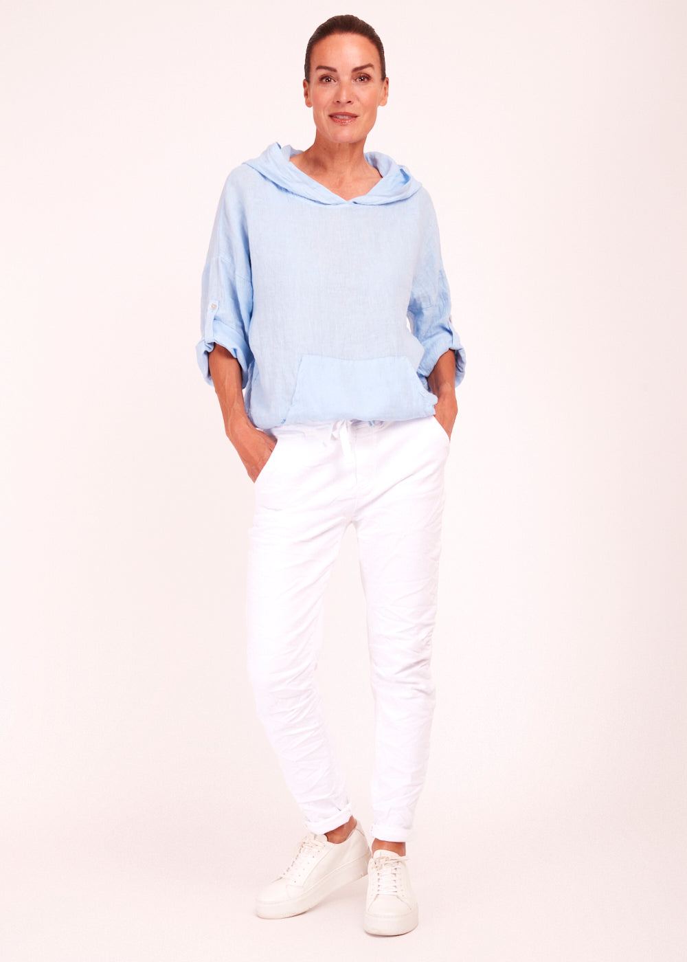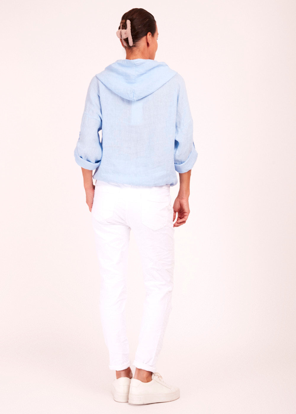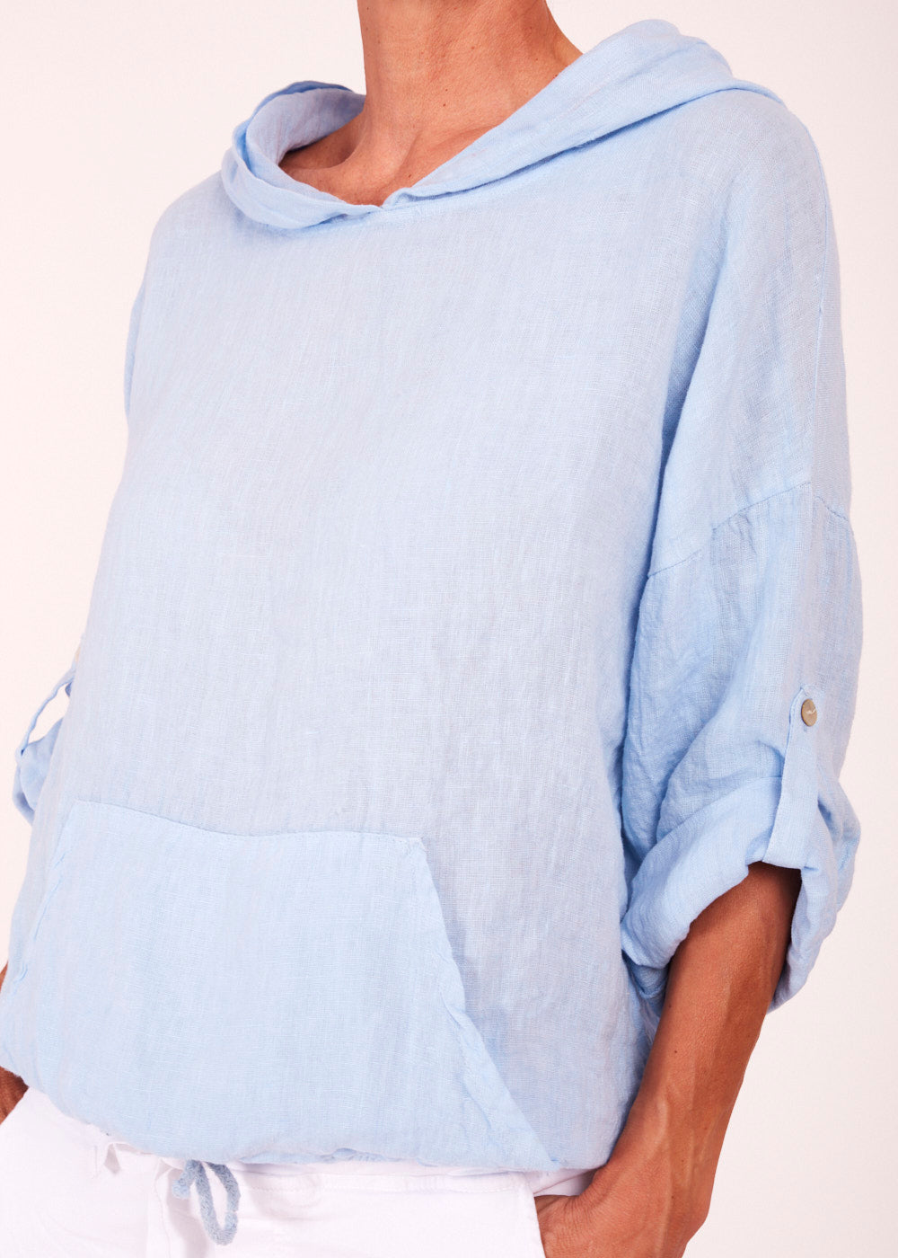 Shoppe unseren Leinenhoody in Celeste für einen entspannten und stylischen Look. Genieße den luftigen Tragekomfort und das trendige Design, das zu jedem Anlass passt.