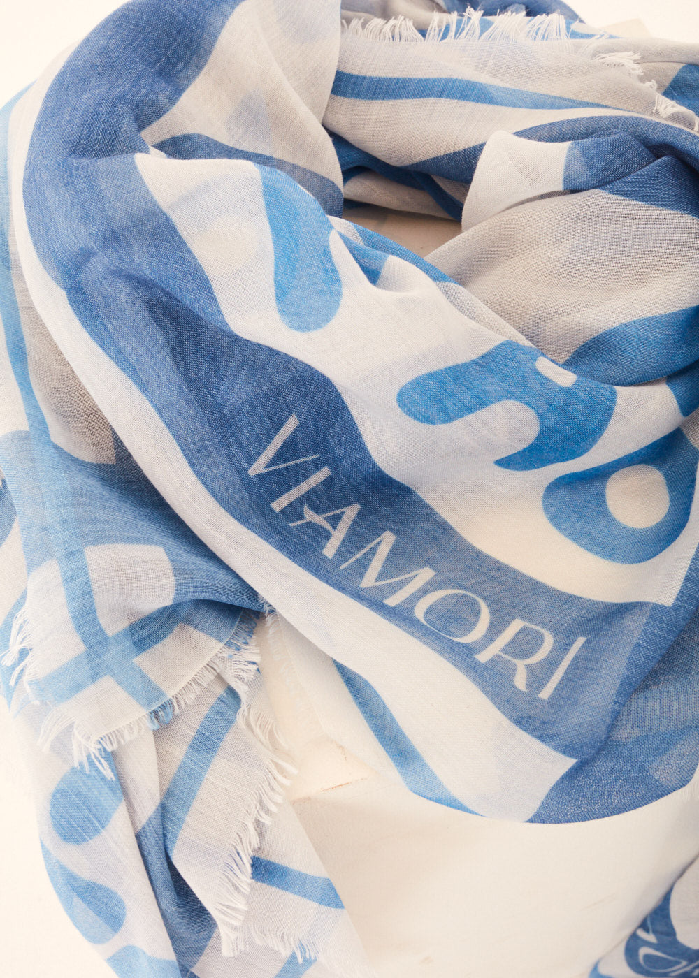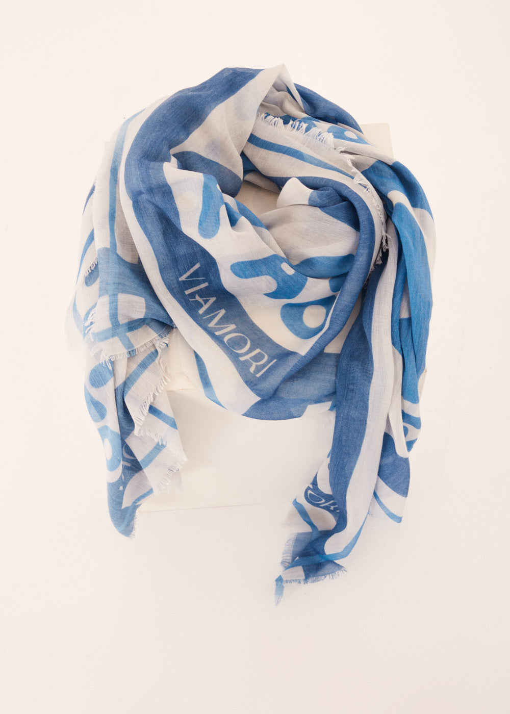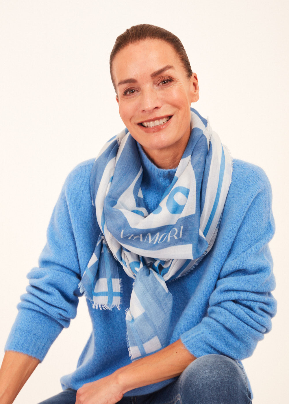 Umhülle dich in einem Hauch von Vielfalt und Lebensfreude mit dem Viamori Schal in strahlendem Blau und verspieltem Muster. Die Worte "Liebe, Lebe, Lache" verleihen diesem Accessoire eine inspirierende Note, die deinen Tag erhellen wird.