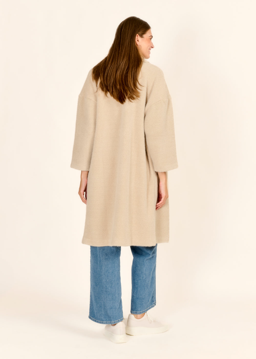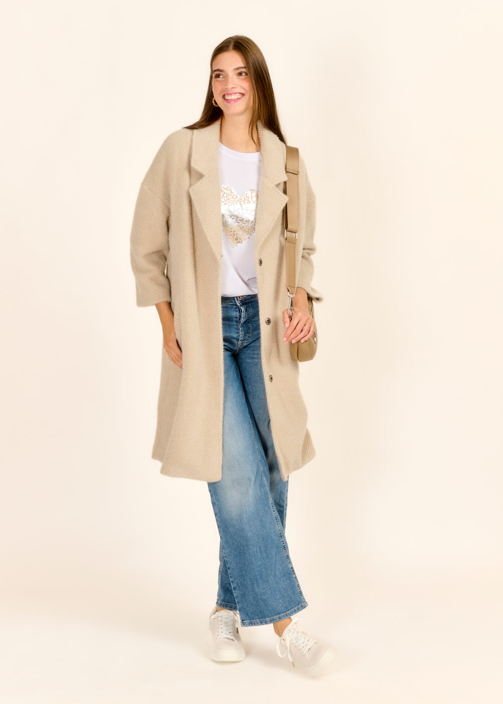 Erlebe den perfekten Mix aus Komfort und Stil mit unserem lang geschnittenen Mantel in elegantem Beige. Dieser Mantel punktet mit seinem zeitlosen Schnitt, hochwertigem Strickmaterial, schlichten Knöpfen und praktischen Taschen.