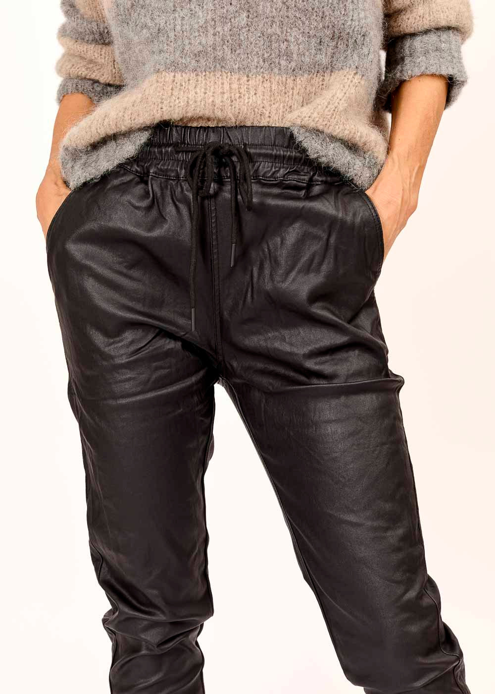 Hol Dir die beschichteten Jogger in Lederoptik in Nero und kombiniere Style mit Komfort! Das coole Design sorgt für einen edgy Look, während der bequeme Schnitt perfekten Tragekomfort bietet.