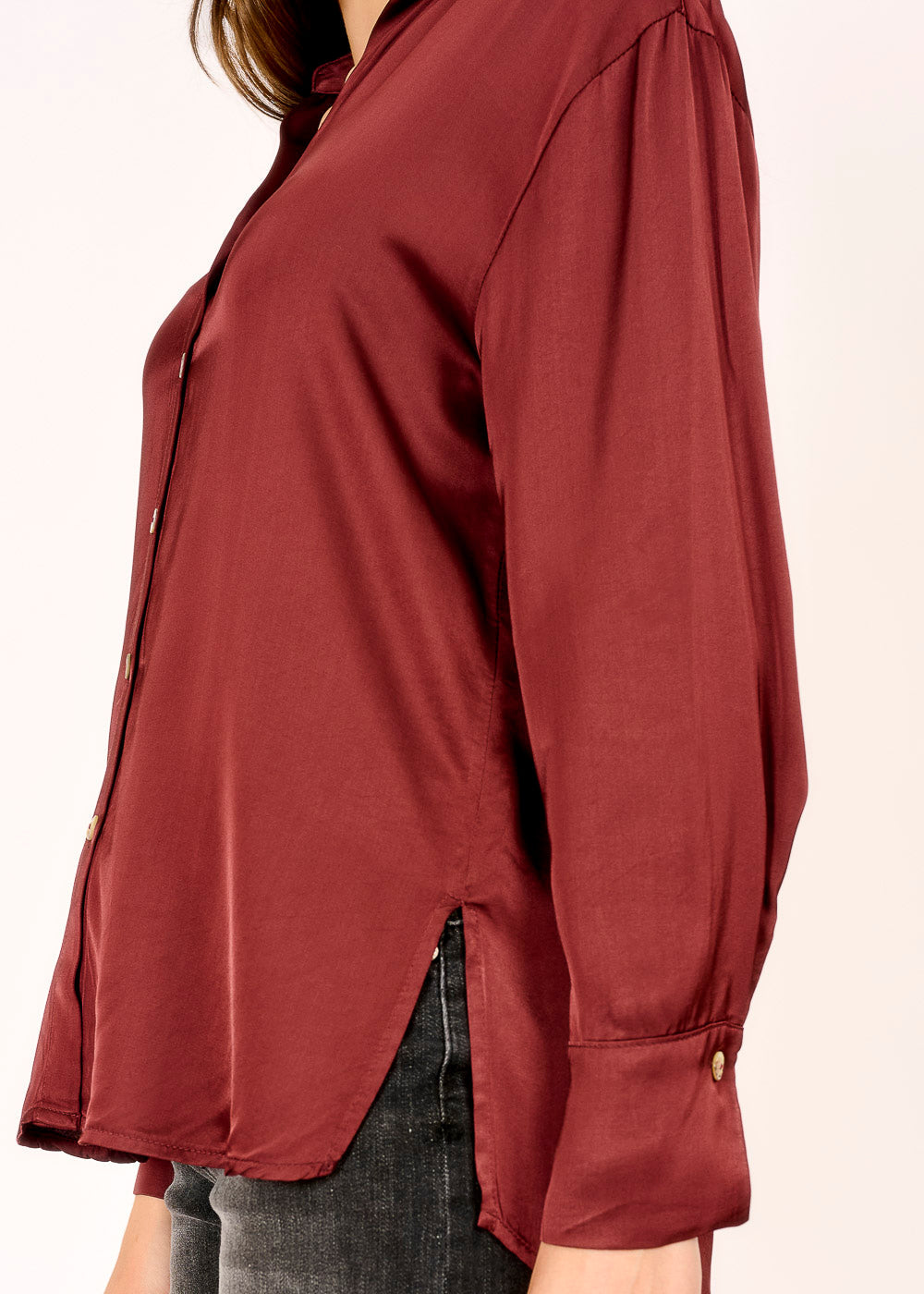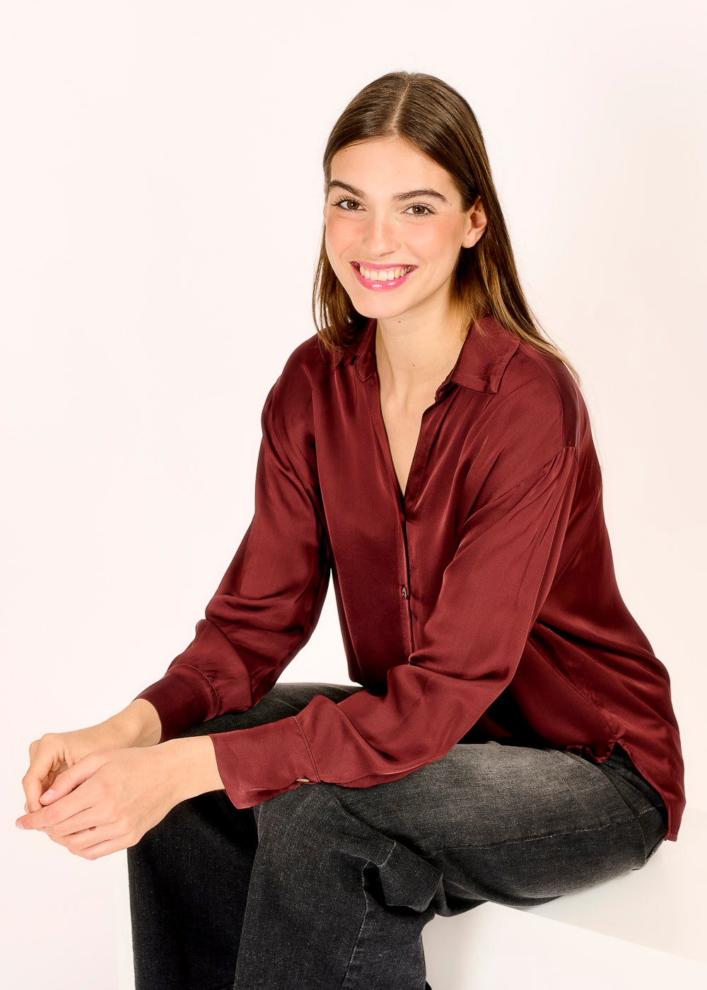 Die Satinbluse in Vino verleiht dir mit ihrem edlen Glanz und der sanften Passform einen besonders eleganten Look. Perfekt für jeden Anlass, an dem du glänzen möchtest!