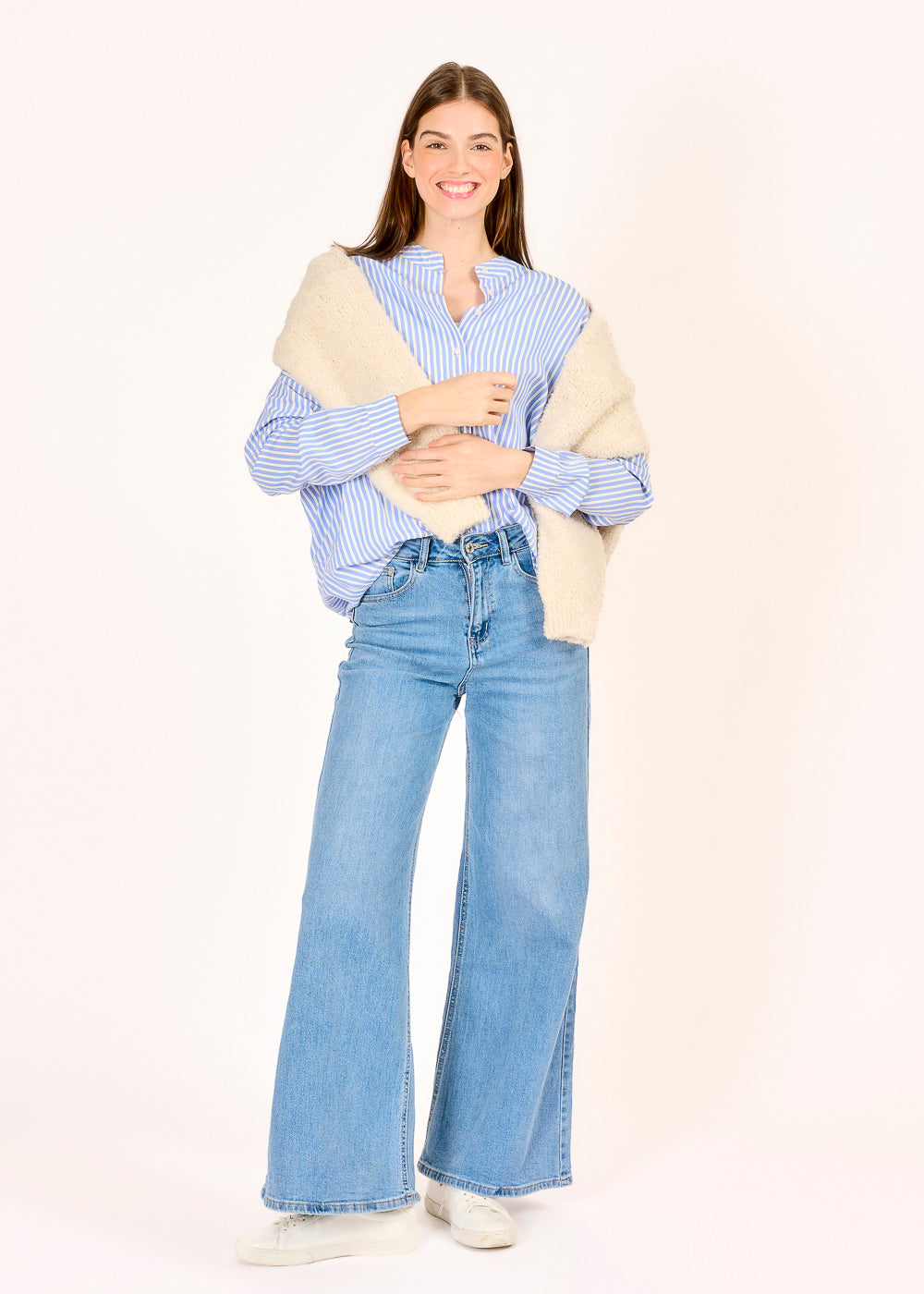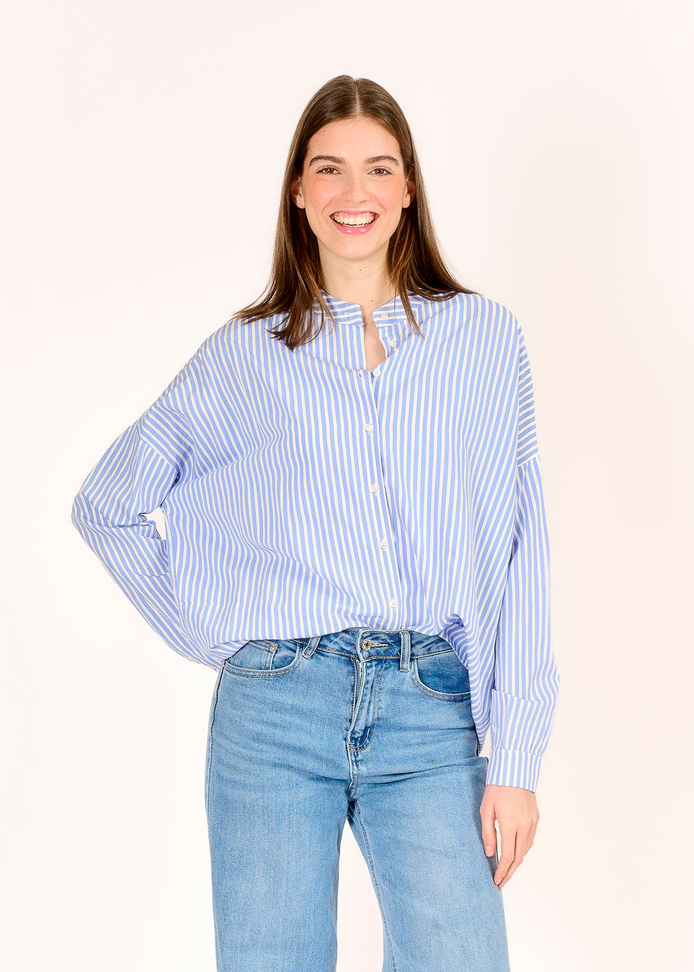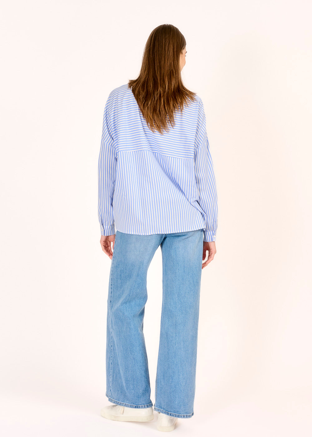 Diese lässig geschnittene Streifenbluse in Blau kombiniert zeitlose Eleganz mit modernem Twist. Ein besonderes Design-Detail: Auf dem Rücken verlaufen die Streifen bewusst quer und setzen einen spannenden Akzent. Leicht und vielseitig tragbar, ist sie das perfekte Piece für stilvolle Alltagslooks.