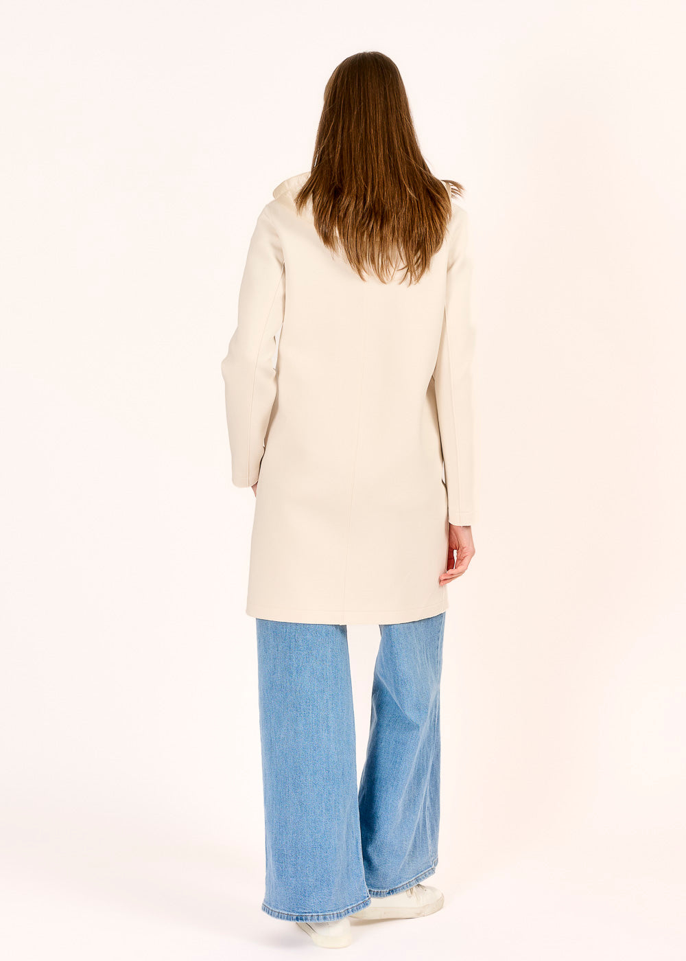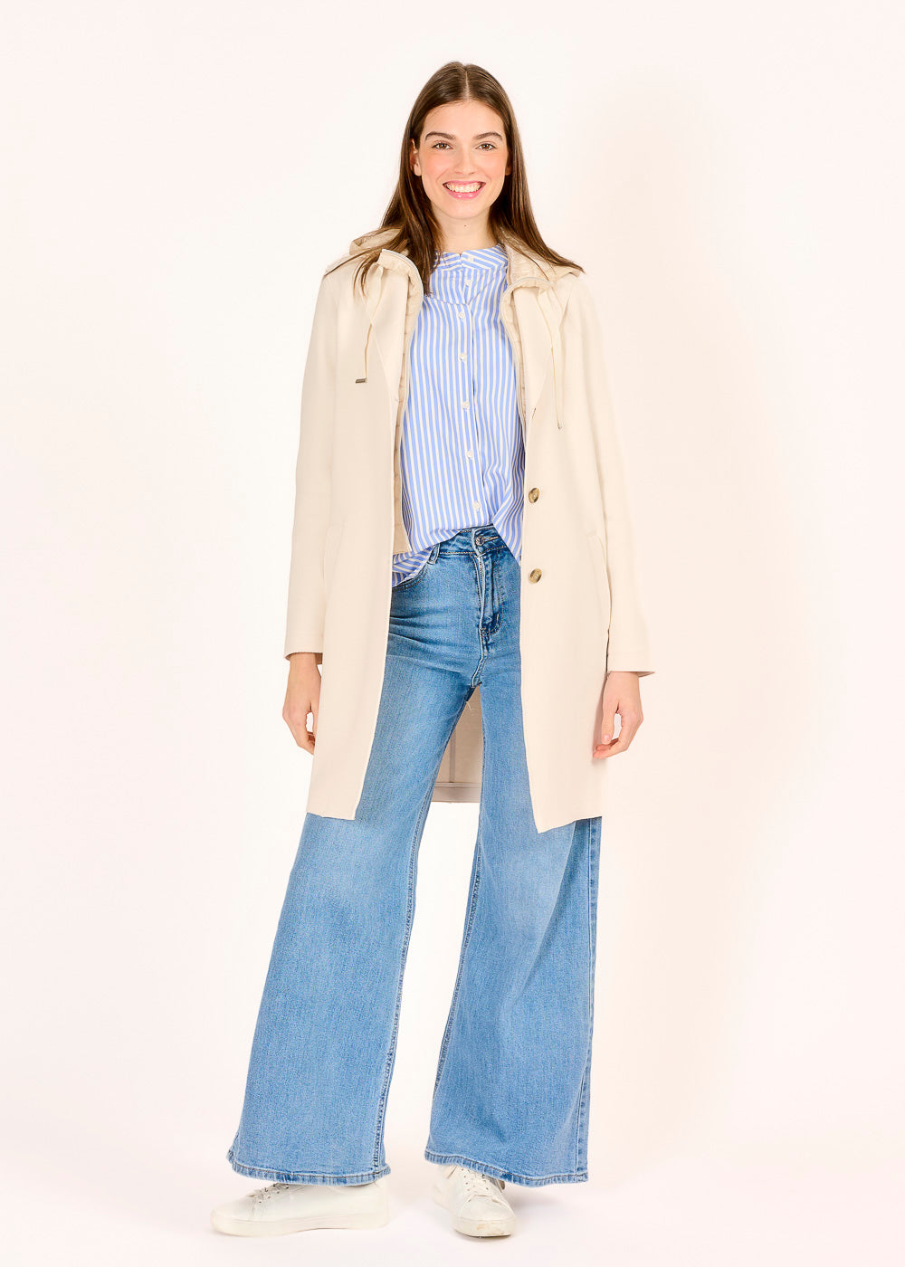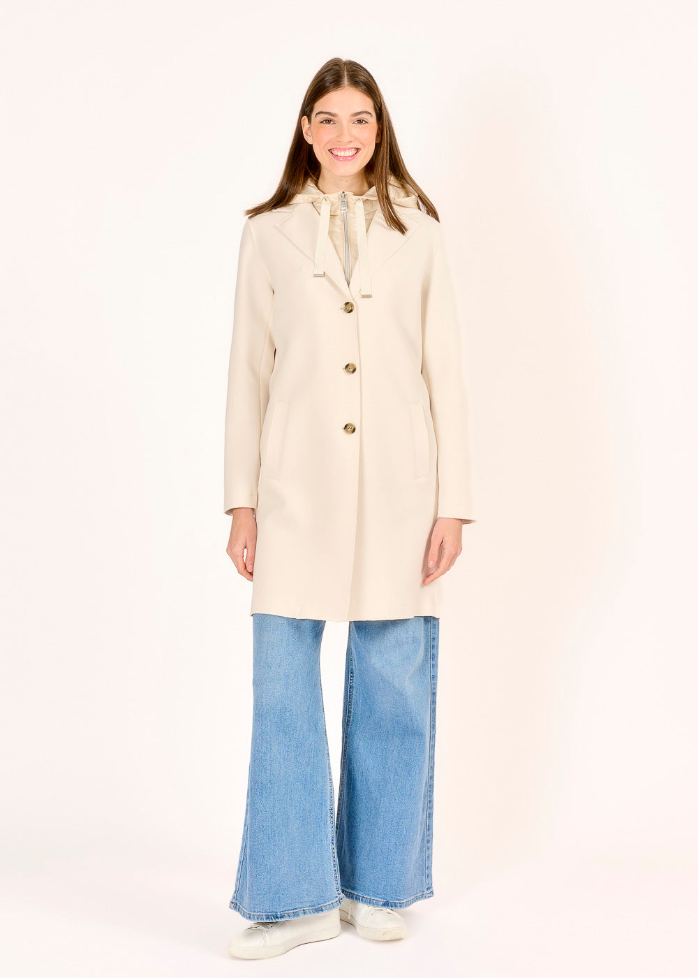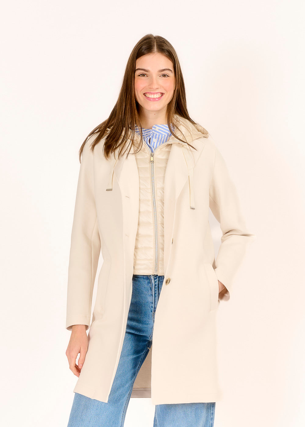 Dieser 2-in-1-Mantel in der eleganten Farbe Panna bietet vielseitige Styling-Möglichkeiten für jede Jahreszeit. Der abnehmbare innere Teil mit Kapuze sorgt für zusätzlichen Komfort und Anpassungsfähigkeit, je nach Wetterlage. So kombiniert der Mantel praktischen Schutz mit einem modernen, stilvollen Look.