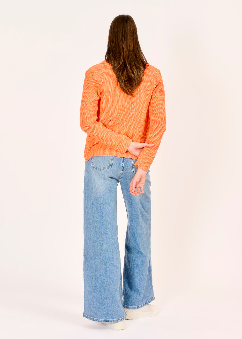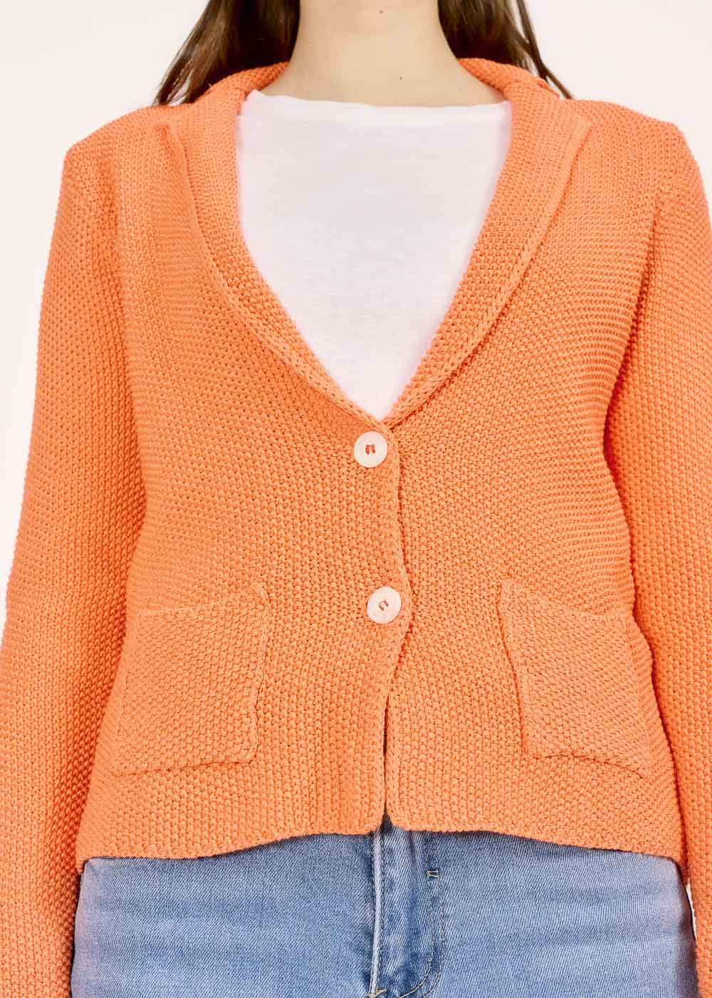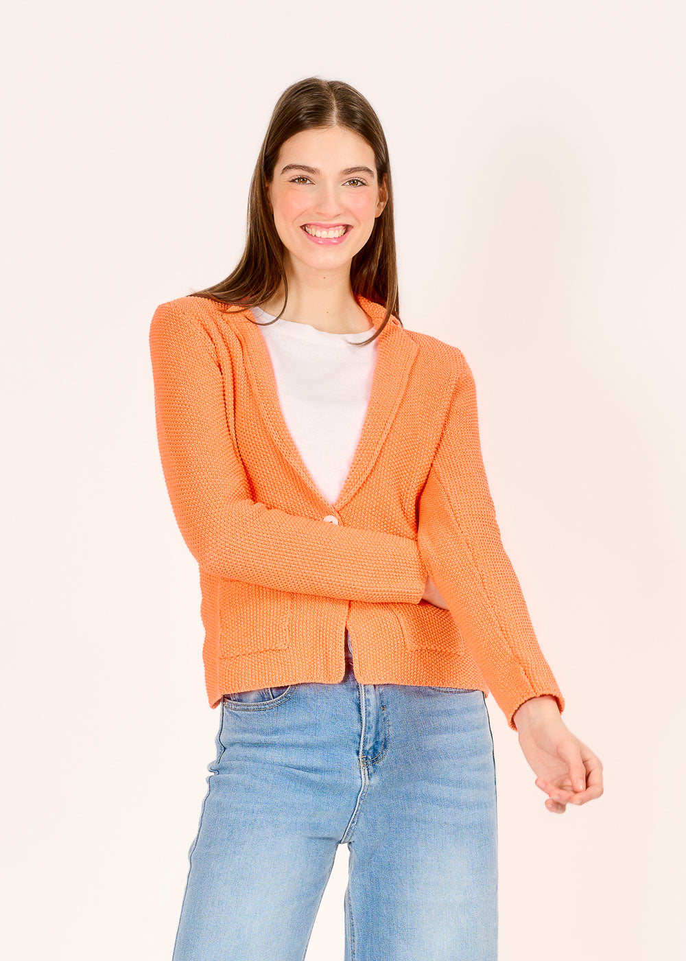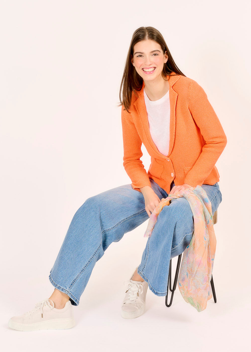 Dieser Strickblazer in der frischen, bunten Farbe Pesca bringt Leichtigkeit in jedes Outfit. Aus weichem Baumwollgarn gefertigt, bietet er höchsten Tragekomfort und eine perfekte Passform. Ein vielseitiges Must-have, das sich mühelos mit jeder Jeansform kombinieren lässt!