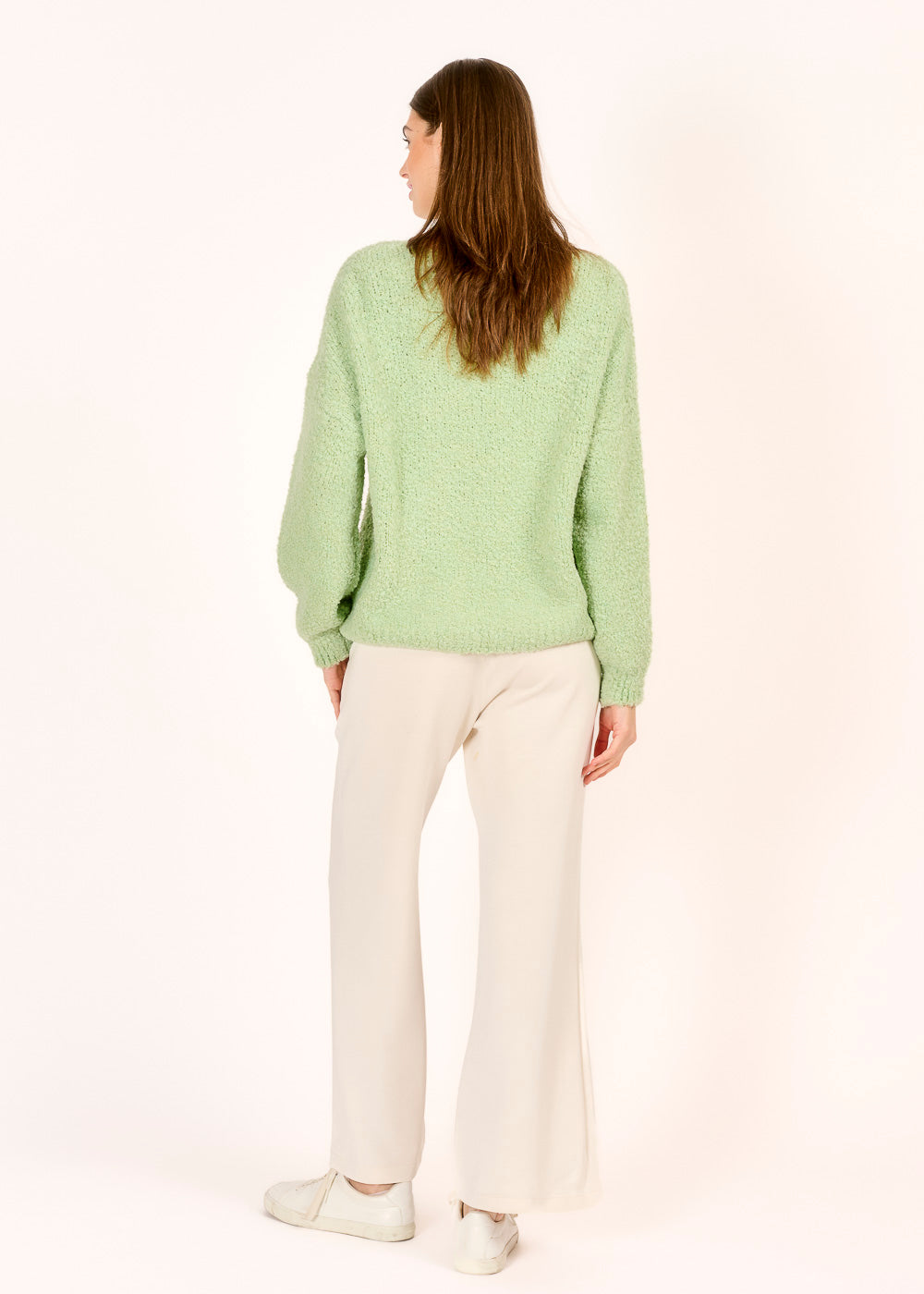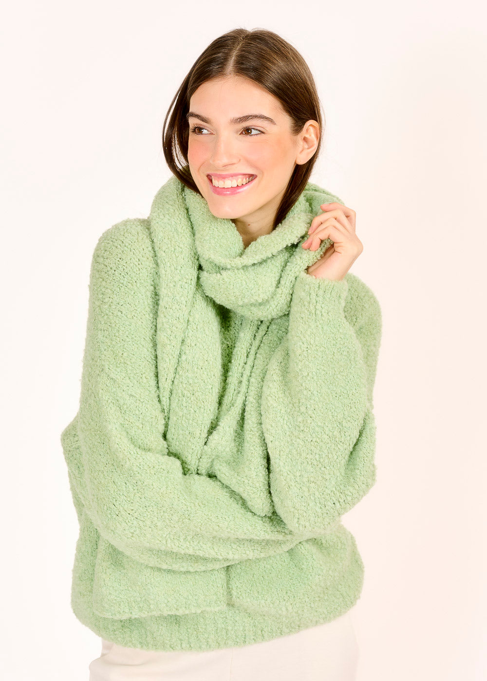Dieser Bouclépullover in der zarten Farbe Salvia begeistert mit seiner kuscheligen Textur und lässigen Eleganz. Das weiche Material sorgt für ein angenehmes Tragegefühl und macht ihn zum perfekten Wohlfühl-Piece. Für den perfekten Look gibt es den passenden Schal dazu – ideal für stilvolle, harmonische Outfits.