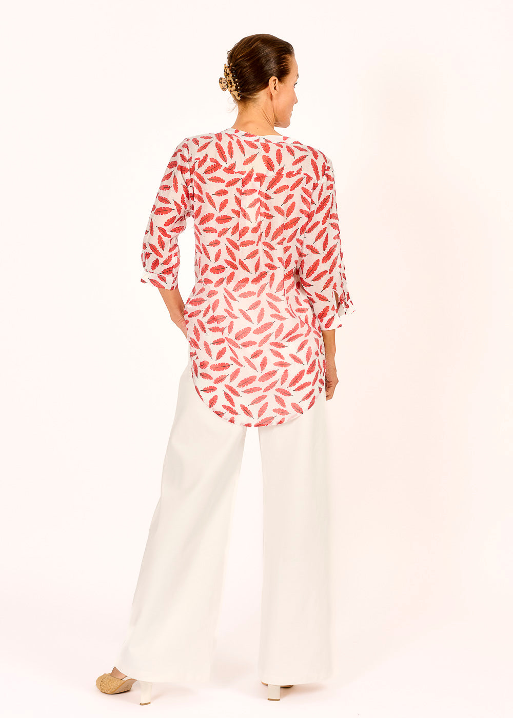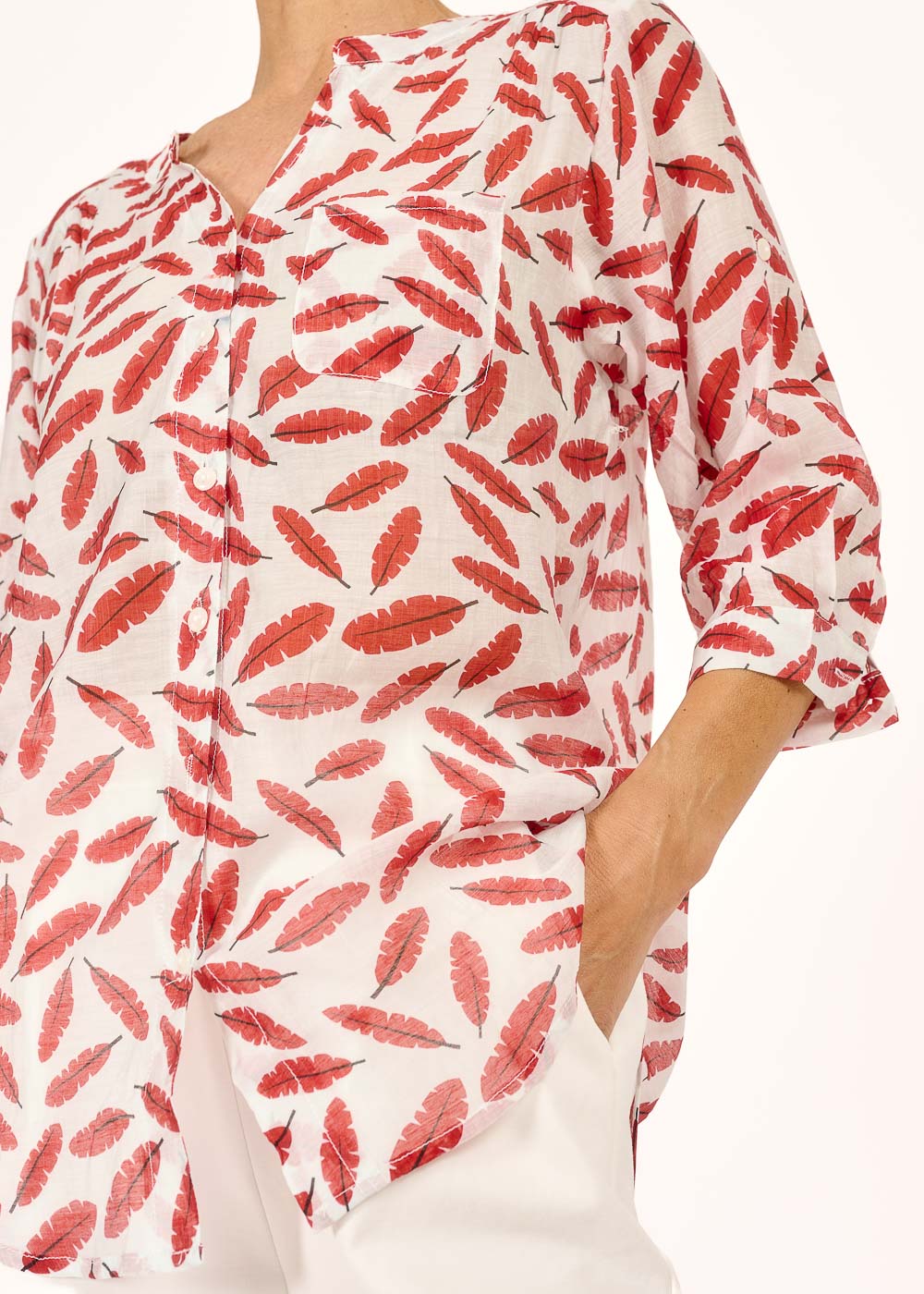Diese bedruckte Viskosetunika in leuchtendem Rosso ist ein echter Blickfang und punktet mit ihrem luftigen, längeren Schnitt. Die Ärmel sind mit Knöpfen versehen und lassen sich ganz einfach hochkrempeln – perfekt für variable Styling-Ideen. Das fließende Material sorgt für ein angenehmes Tragegefühl und einen femininen Look.