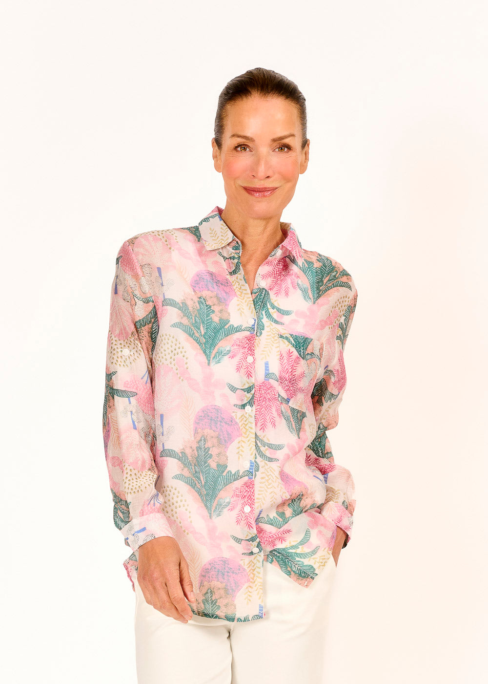 Diese Hemdbluse begeistert mit einem zarten Muster in sanften Rosatönen und verleiht jedem Look eine feminine Leichtigkeit. Der schmale Kragen unterstreicht das elegante Design, während das leichte Material für ein angenehmes Tragegefühl sorgt. Ob im Büro oder in der Freizeit – diese Bluse ist ein stilvoller Allrounder.