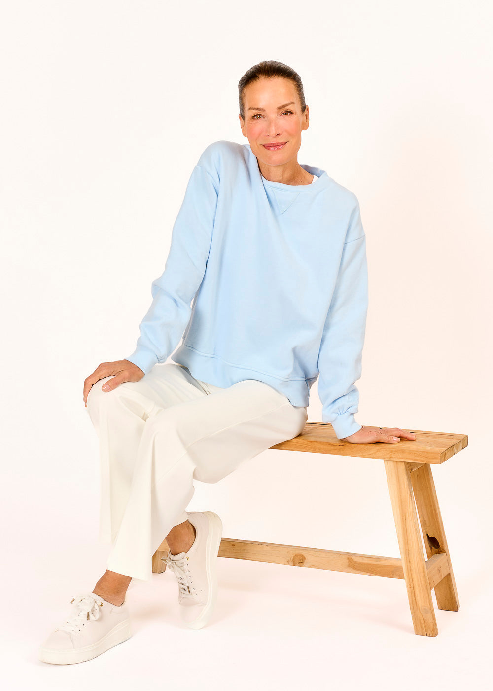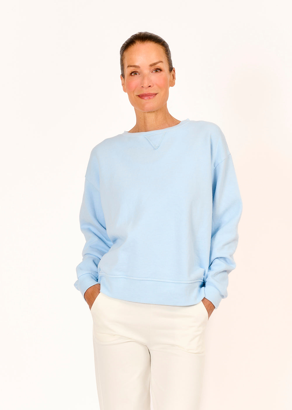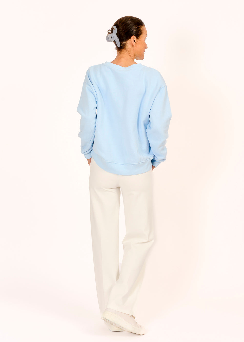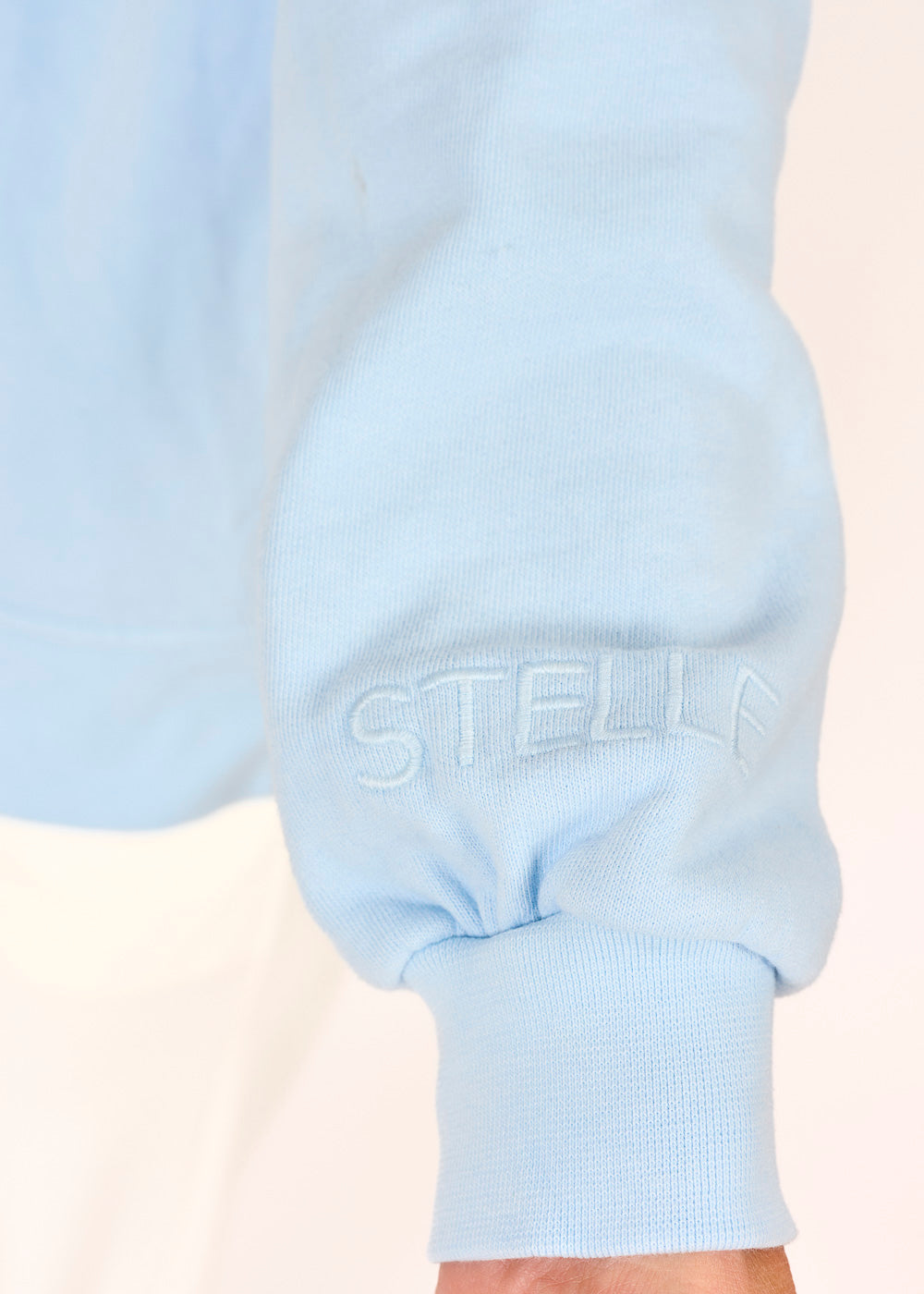 Dieses Sweatshirt in der frischen Farbe Celeste strahlt Leichtigkeit und Modernität aus. Die feine Stickerei des italienischen Wortes „Stelle“ – auf Deutsch „Sterne“ – verleiht dem Design eine verspielte, himmlische Note. Aus weichem Material gefertigt, bietet es höchsten Tragekomfort und wird zum perfekten Begleiter für entspannte Looks.