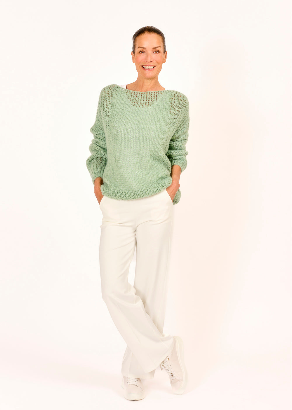Dieser Grobstrickpullover in der frischen Farbe Menta bringt einen Hauch von Frühlingsfrische in deine Looks. Die lockere Strickstruktur sorgt für eine lässige Optik und ein angenehmes Tragegefühl. Perfekt für kühle Tage – stylisch, cozy und wunderbar vielseitig kombinierbar.