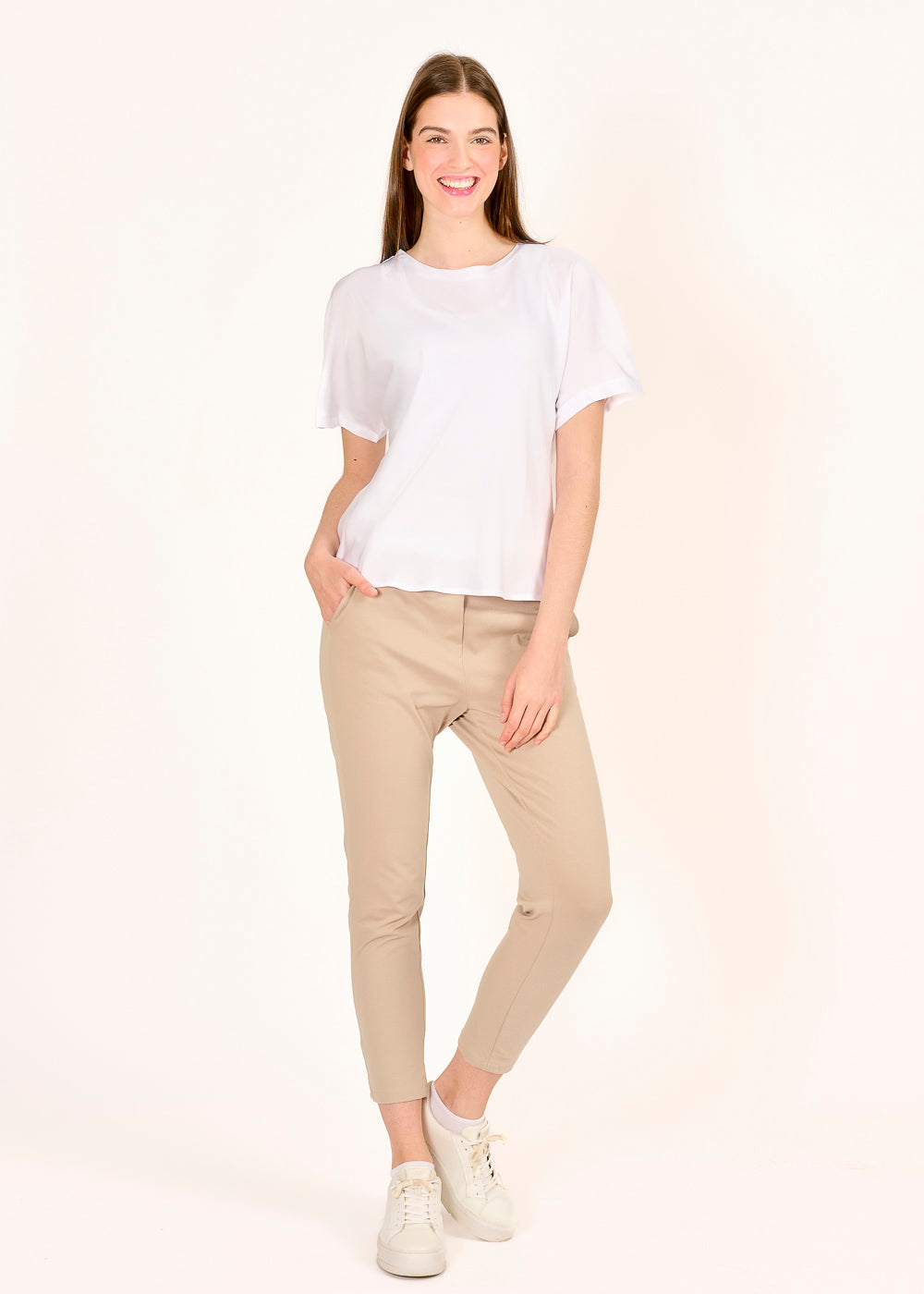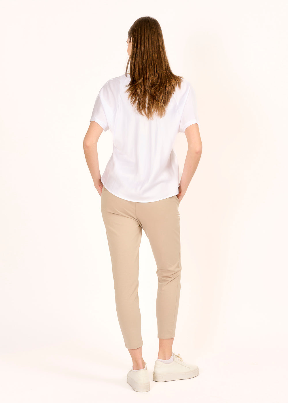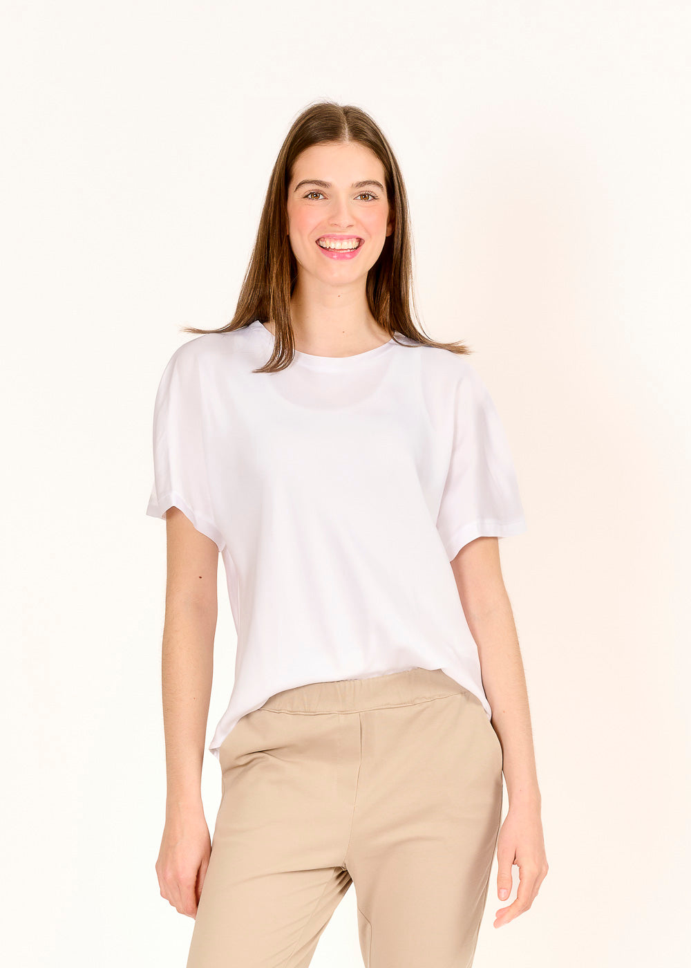 Dieses Satinishirt in der Farbe Bianco-Ottico besticht durch seinen edlen Glanz und die weich fließende Qualität mit Stretch-Anteil. Die überschnittenen Schultern verleihen dem Look eine moderne Lässigkeit – ideal für elegante wie auch entspannte Outfits.
