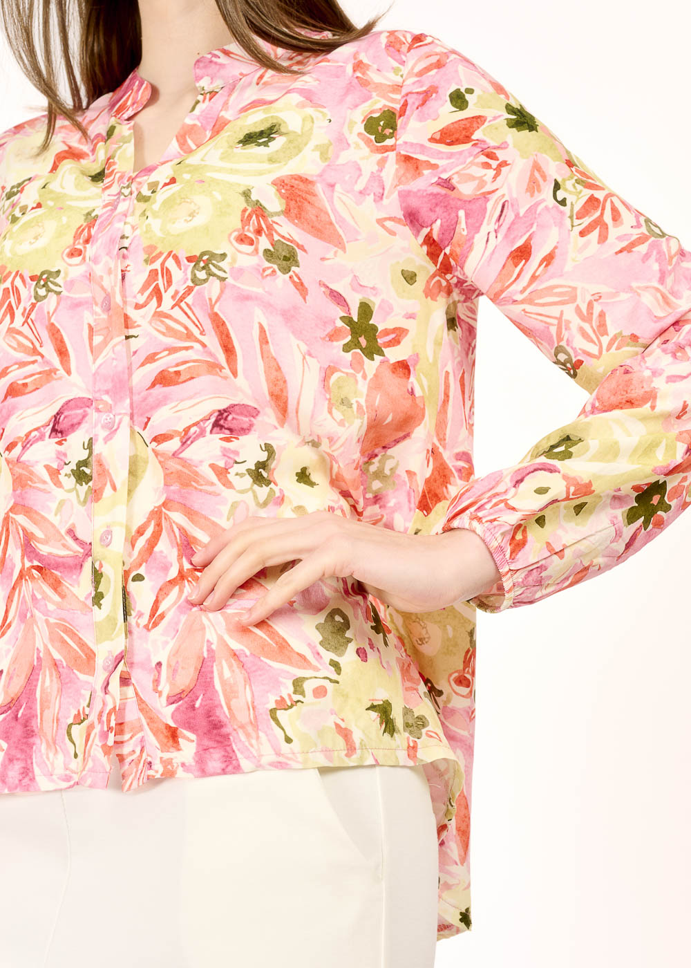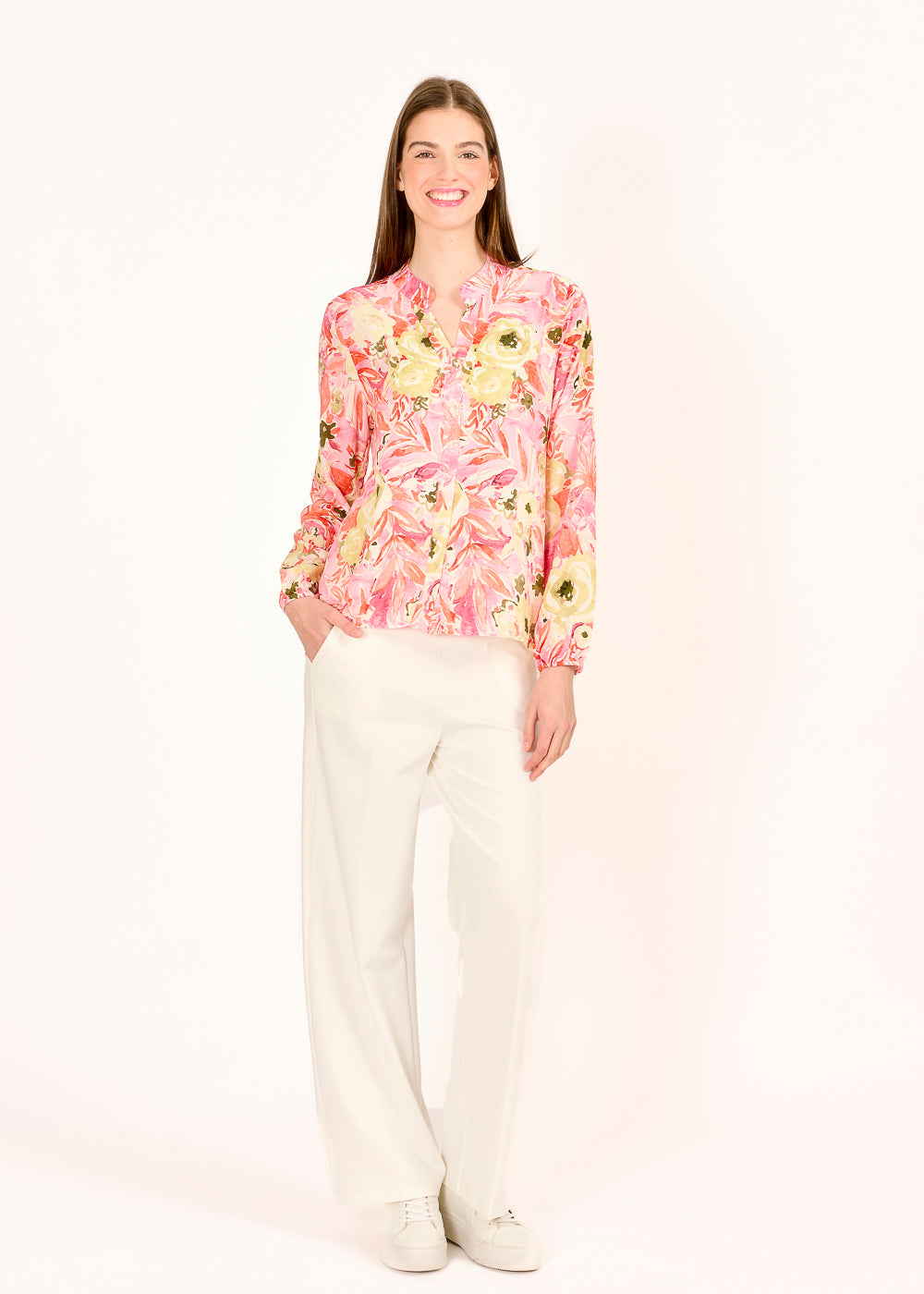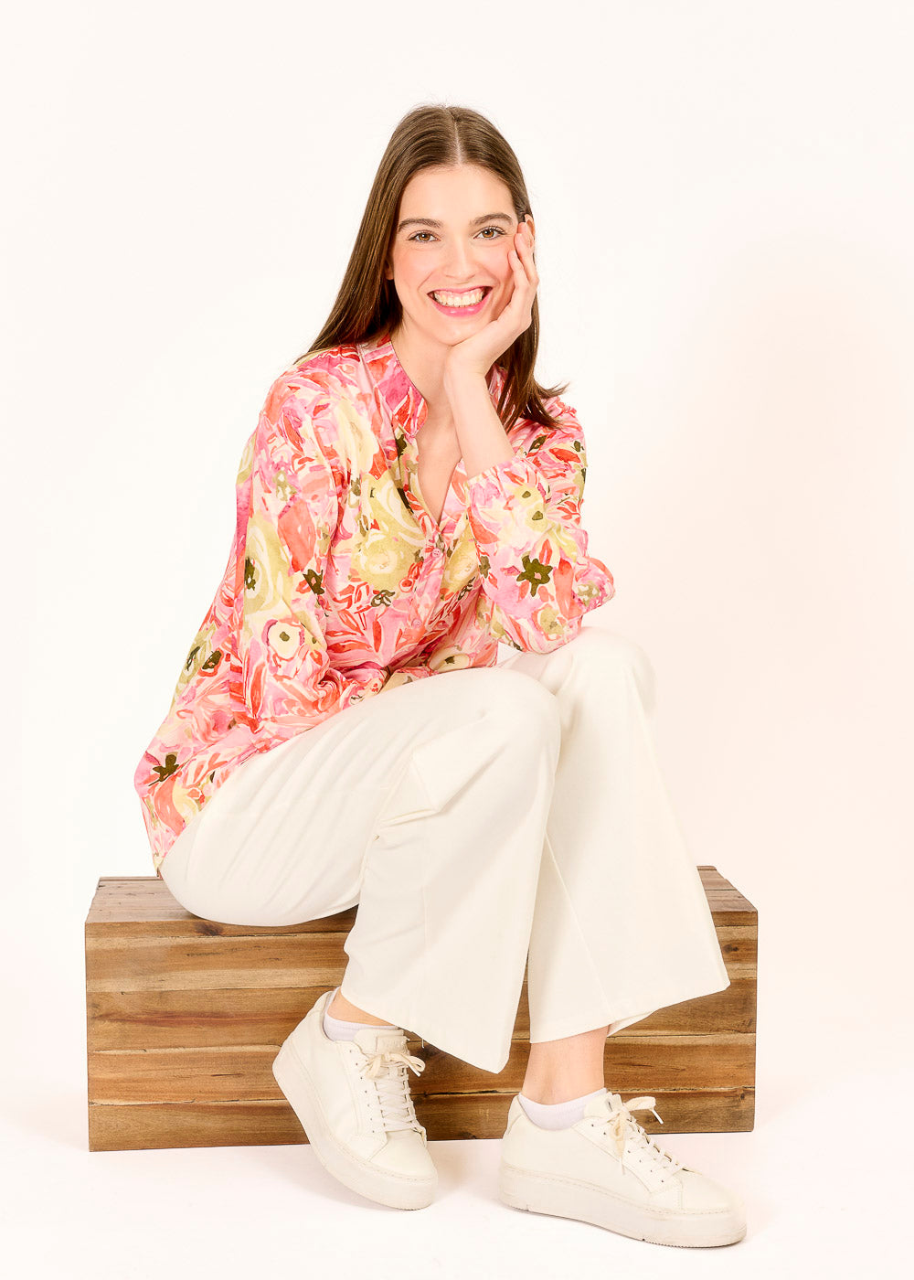 Diese pinke Druckbluse bringt sofort die lebendige Energie der warmen Frühlingstage in deinen Look. Der fröhliche Print sorgt für eine frische, positive Ausstrahlung und macht sie zum perfekten Begleiter für sonnige Tage. Leicht und luftig im Stoff – ideal für einen stylischen, komfortablen Frühling!