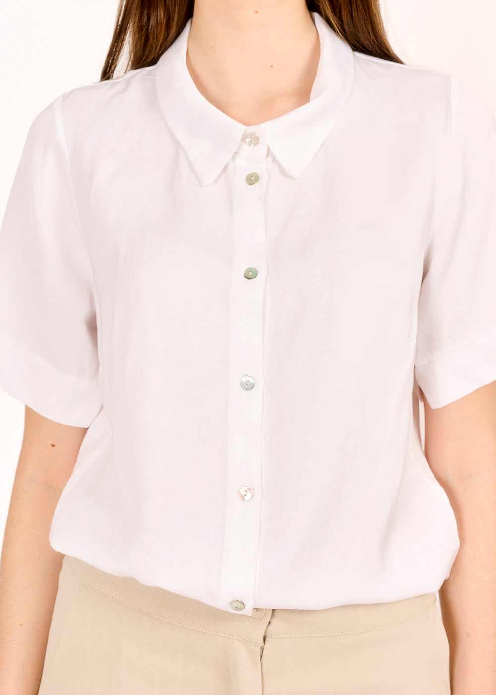Diese weiße Bluse mit kleinem Kragen besticht durch ihre schlichte Eleganz und ihren modernen Schnitt. Der tiefer geschnittene Kragen sorgt für einen dezenten, schönen Ausschnitt, der das Design besonders feminin macht. Mit ihren halblangen Ärmeln ist sie ein vielseitiges Essential für stilvolle Looks.