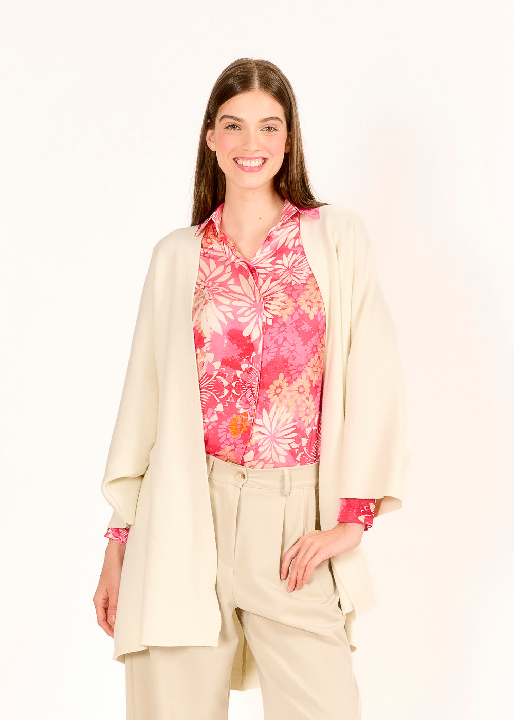 Dieser edle Kimonocardigan in der Farbe Panna besticht durch seine zeitlose Eleganz und fließende Silhouette. Die dezente, neutrale Farbe macht ihn zum vielseitigen Begleiter, der sich mühelos kombinieren lässt. Perfekt für die Übergangszeit, verleiht er jedem Outfit eine stilvolle und moderne Note.