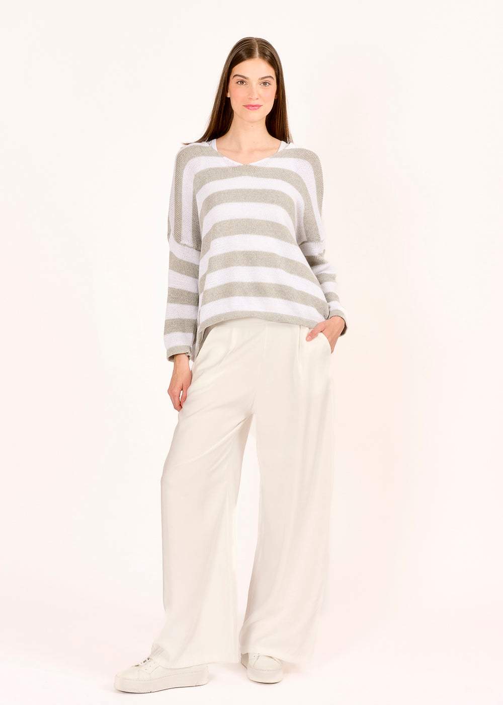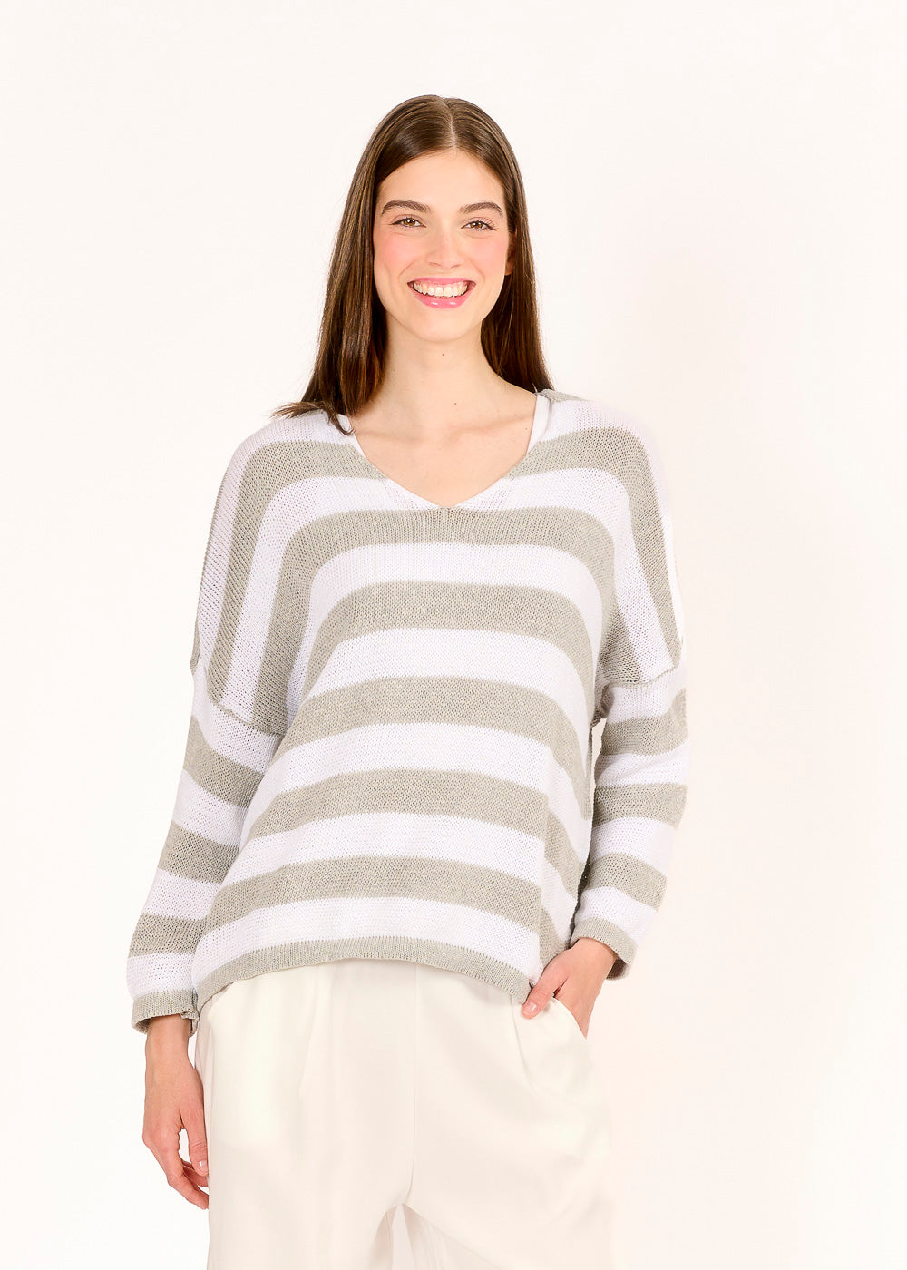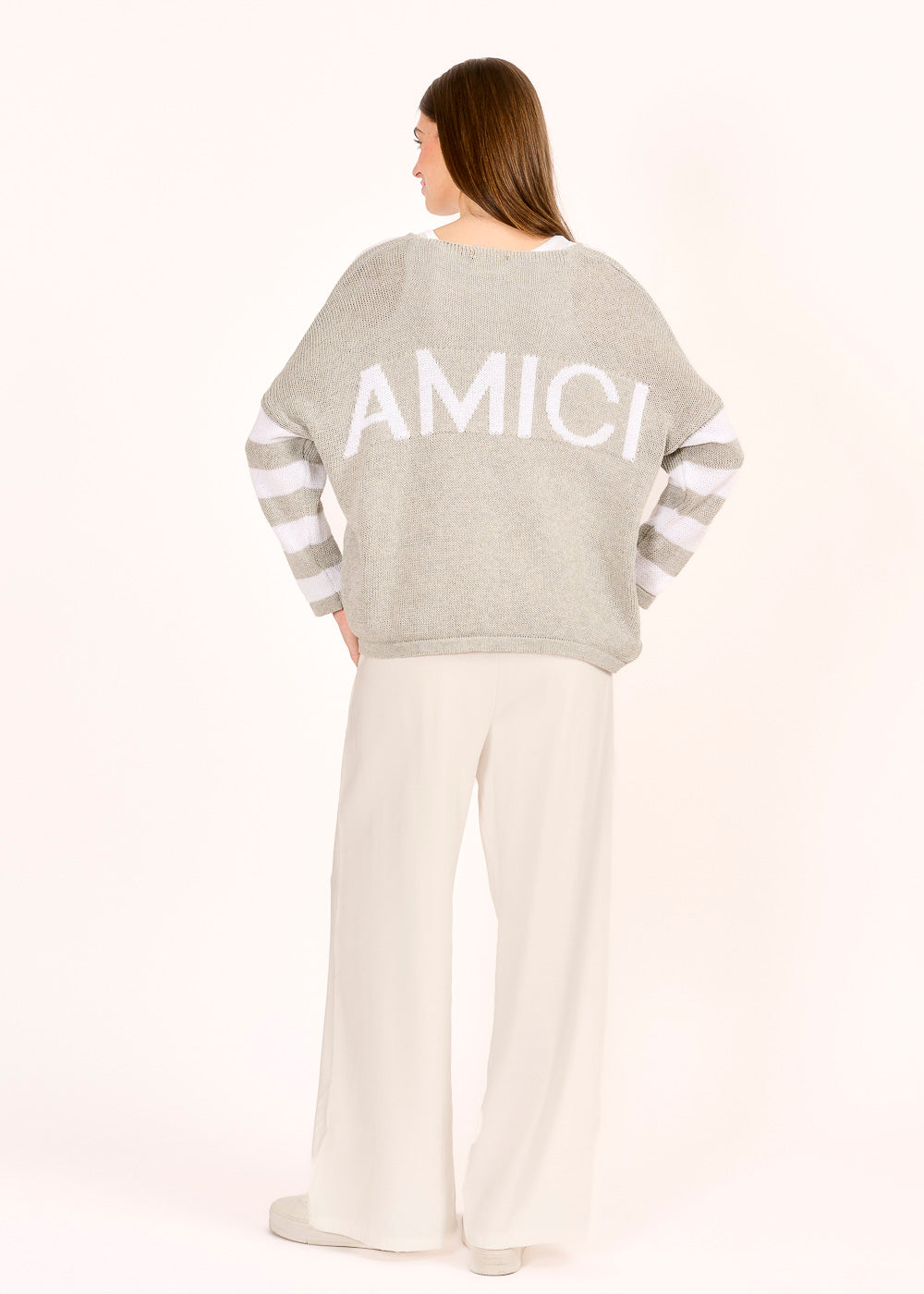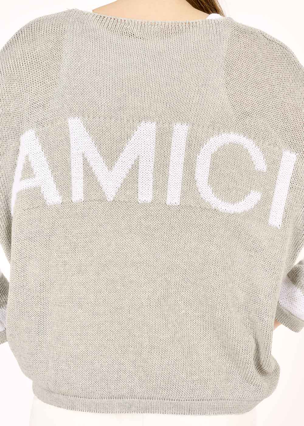 Dieser graue Pullover aus sommerlichem Baumwollgarn überzeugt mit seiner lässigen Eleganz und dem besonderen Detail auf der Rückseite – dem Schriftzug „Amici“. Die Intarsien-Stricktechnik sorgt für eine hochwertige Verarbeitung und einen einzigartigen Look. Leicht und bequem, ist er der perfekte Begleiter für entspannte Sommertage.